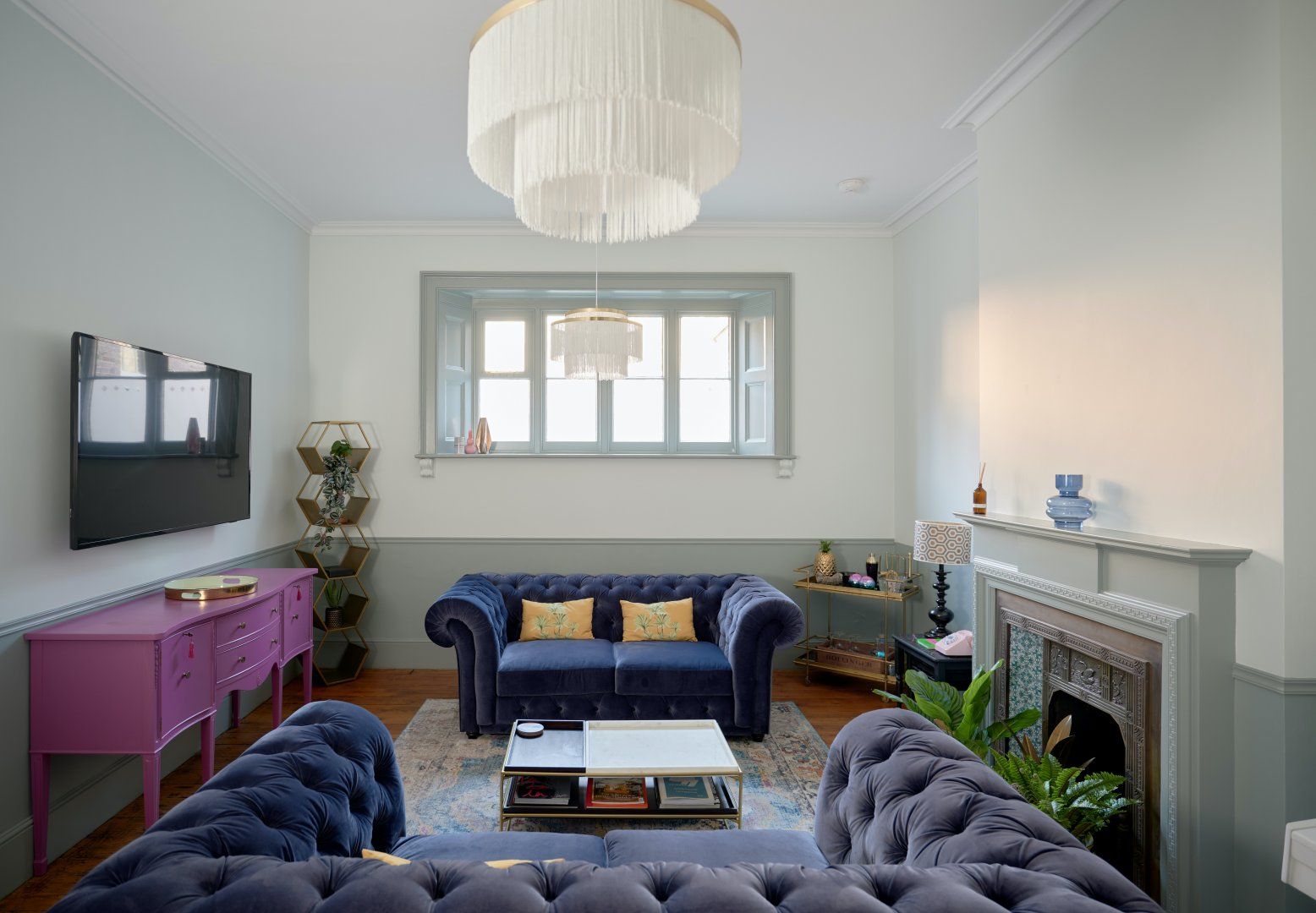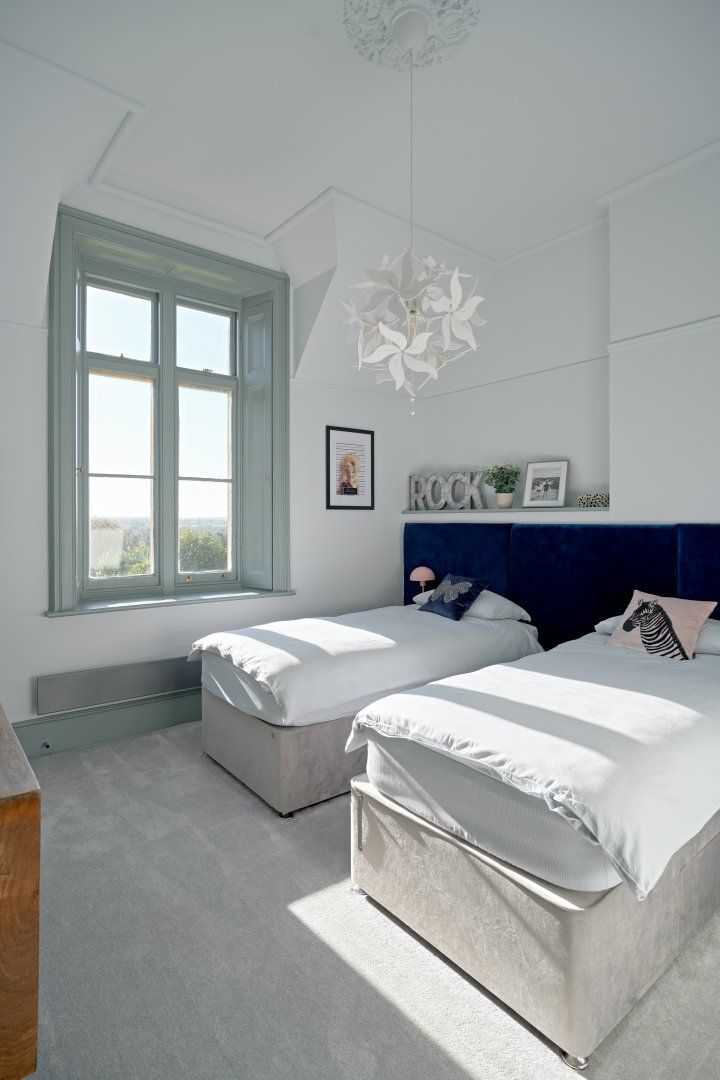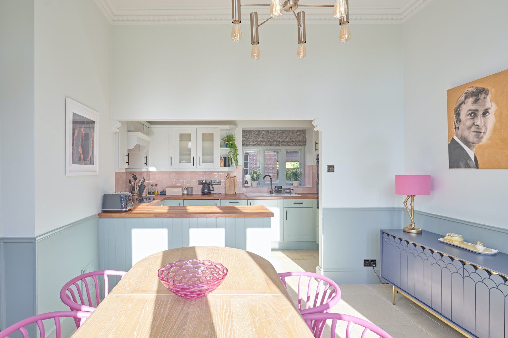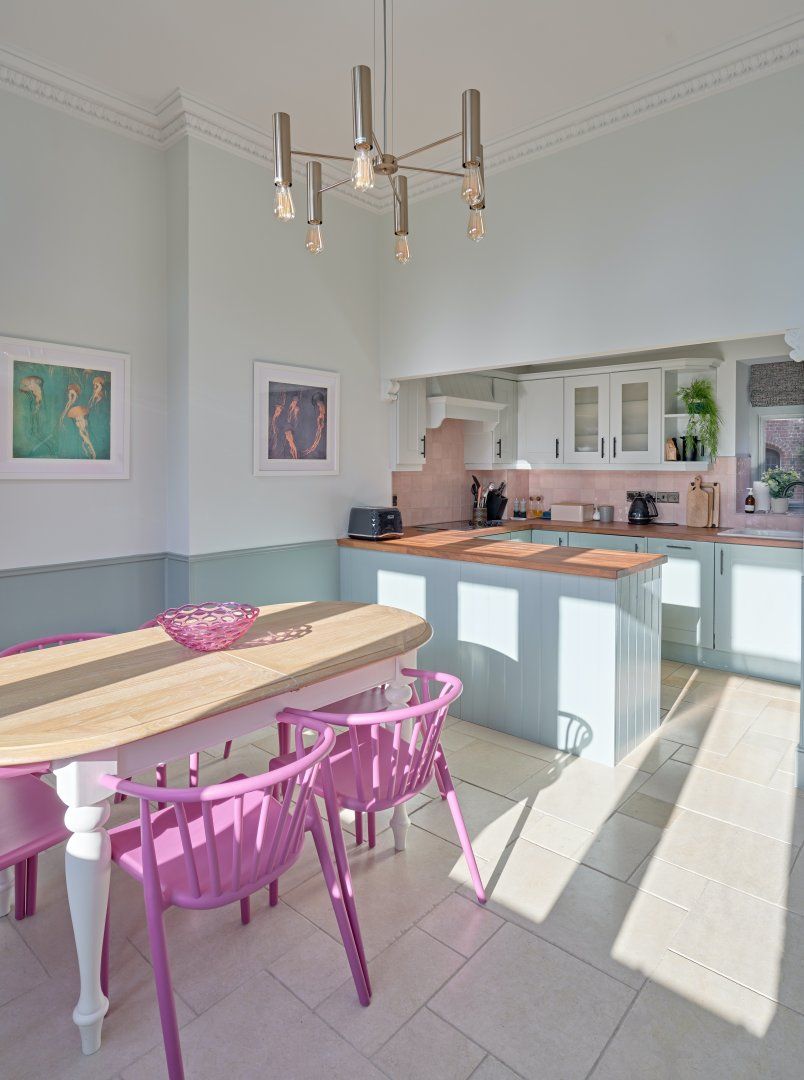 This picturesque, Grade II-listed cottage set within the grounds of a 19th-century mansion is full of surprises. Designed by eminent architect Benjamin Ferrey, it features characterfully towering chimney stacks and a charming redbrick facade. So far, so traditional. But step inside and we think you'll do a double-take. The interior is a contemporary design haven, with bold colour choices (we love the lavender dresser in the living room and the playful candy-coloured chairs in the kitchen) and stunning modern artwork (say hello to Michael Caine as you sashay through the kitchen). Large windows let light flood right in, and make every colour pop in a joyful way. There are thoughtful, almost-kitsch touches everywhere you look - the neon disco ball cocktail glasses on the gilded drinks trolly, the flamingo leg table lamp in the kitchen, the silver graffiti slogan on the royal-blue dresser in the master bedroom and the cute zebra-print cushions in the twin room. And it's not often we say the downstairs loo is a real highlight in a home, but check out this one with the retro cassette wallpaper and you'll see what we mean. The home's private terrace is the perfect place to give those disco glasses a whirl (might we suggest a Mai-Tai?), and the enormous, immaculate shared gardens are waiting to be explored. Set in the heart of the Dorset countryside, the dramatic Jurassic Coast is about 30 minutes away, and the magnificent cathedral city of Dorchester about a 20-minute drive.