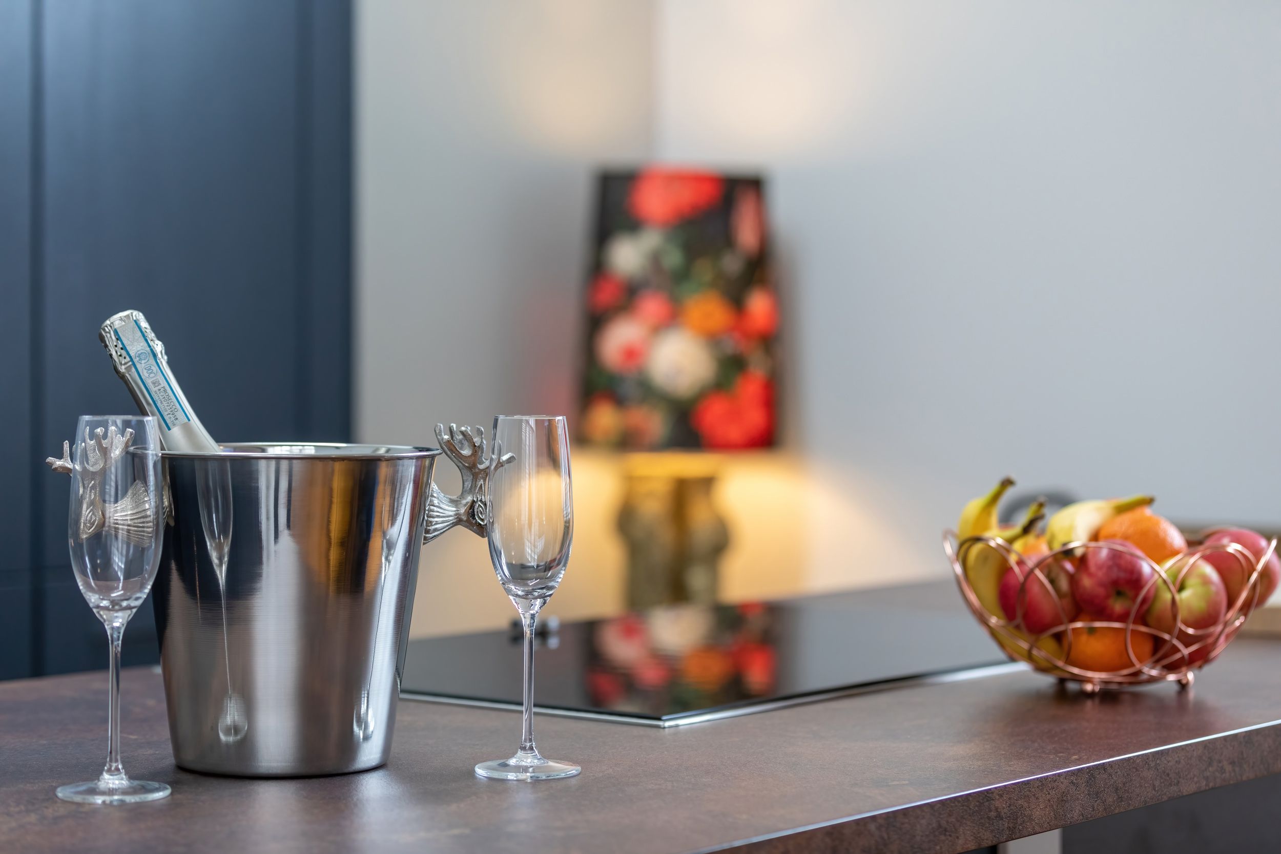 Reverse-level. Three bedrooms: 2 x ground-floor double with TV, 1 x ground-floor double. Ground-floor bathroom with freestanding roll-top bath, walk-in shower, basin, heated towel rail, and WC. Open-plan living space with kitchen, dining area, and sitting area
