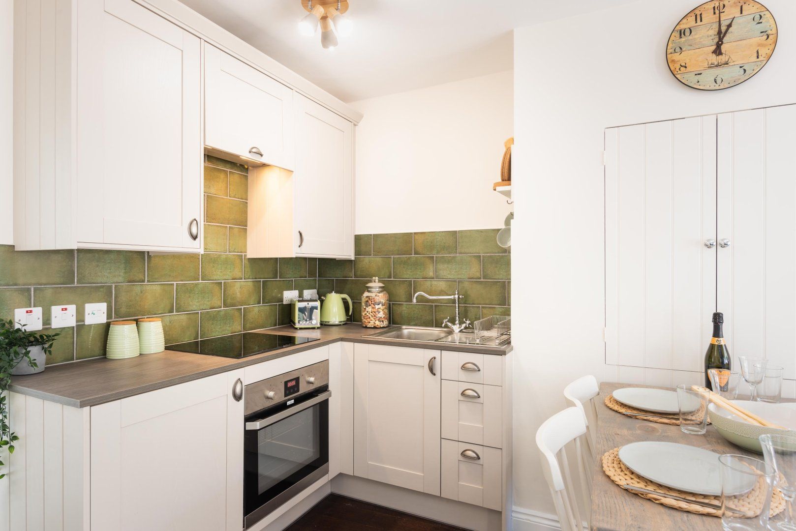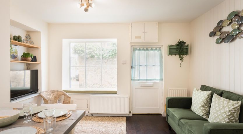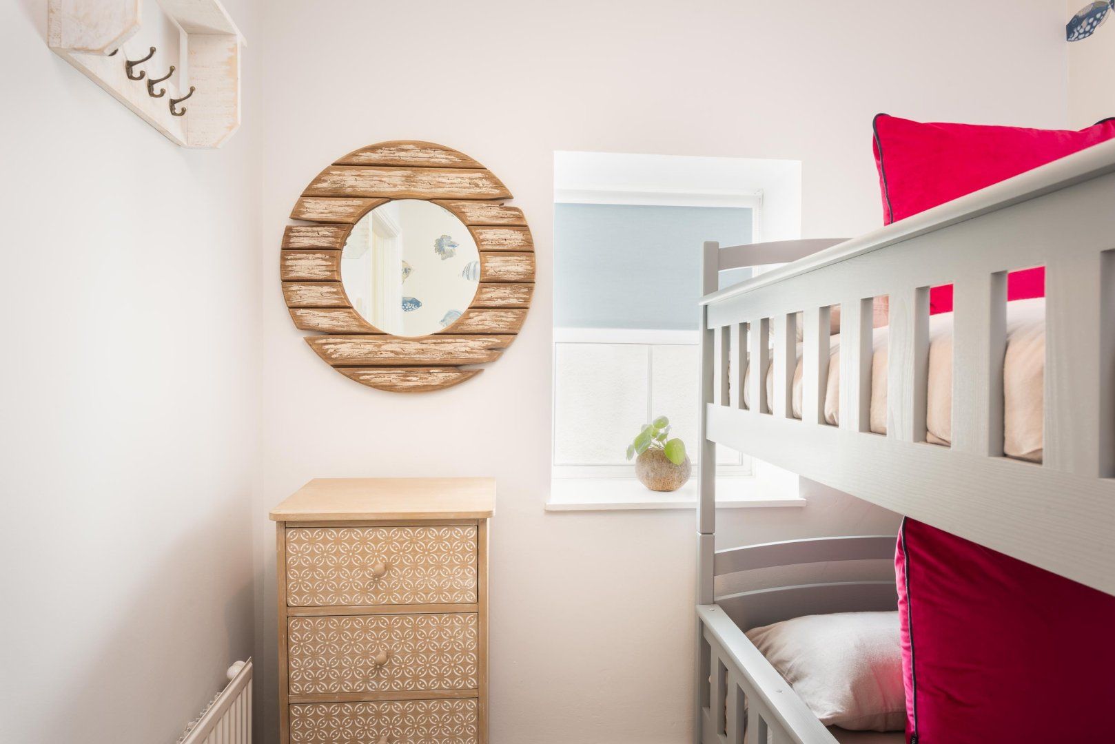 Inside this traditional building, the fresh, modern decor makes you feel immediately relaxed. We love the earthy palette of peach, cream, dark brown wooden floors, and a moss-coloured sofa. Wicker pieces and textures bring a sandy look, offering another reminder of your coastal setting. Further nods to the nautical theme are found throughout the cosy cottage, with anchors, captain’s wheels, and a glossy shoal of decorative fish bringing the seaside to life. Anyone for some fish and chips?