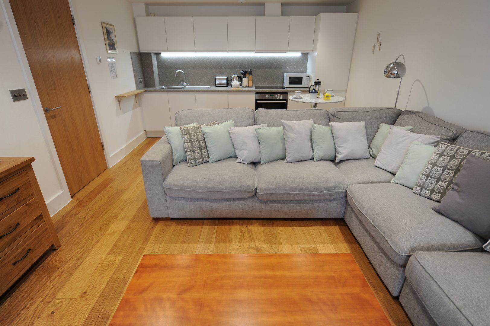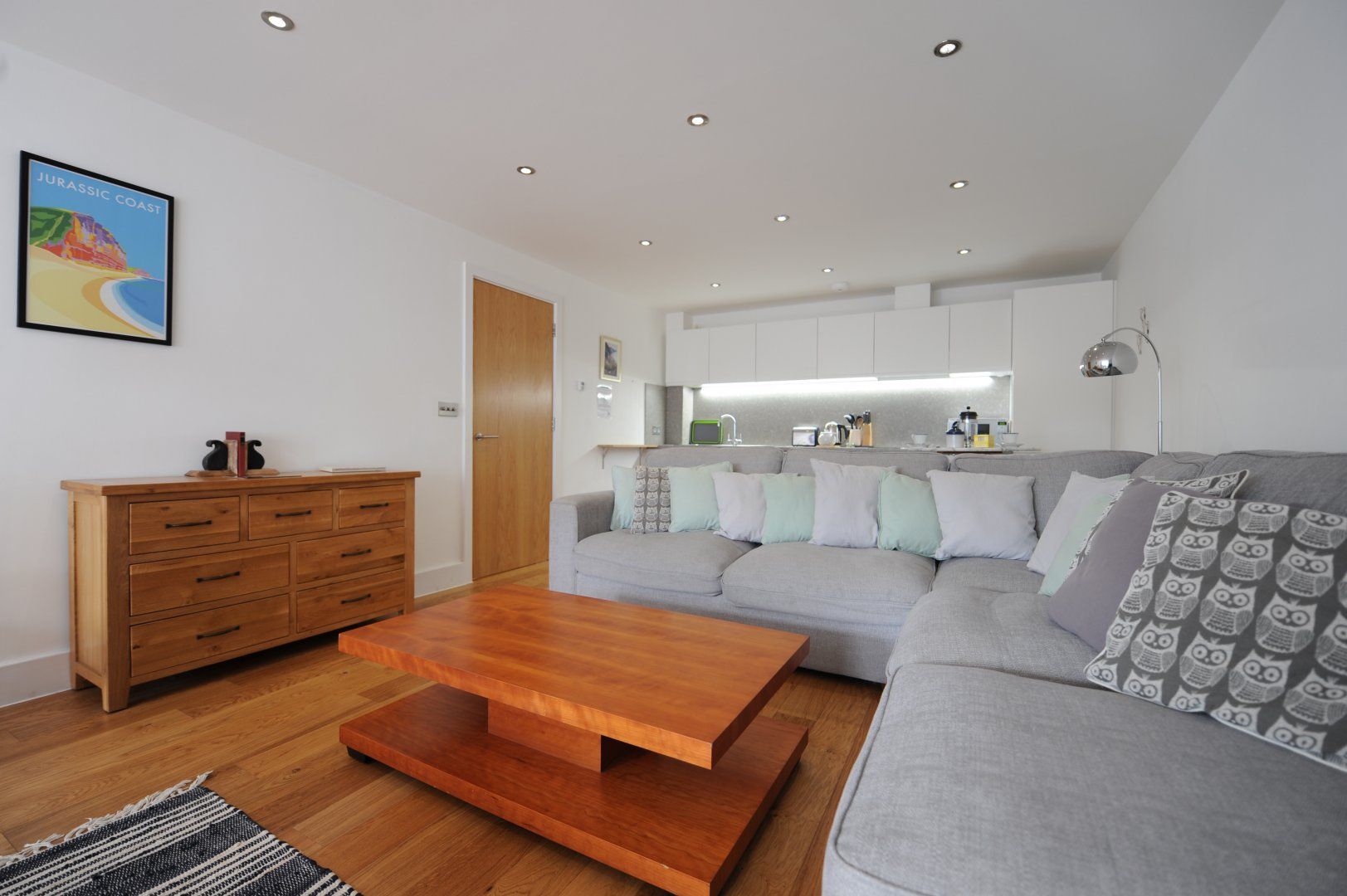Ground-floor apartment. Two bedrooms: 1 x king-size with en-suite with bath with shower over, basin and WC, 1 x twin. Shower room with walk-in shower, basin and WC. Open-plan living area with kitchen, dining area and sitting area