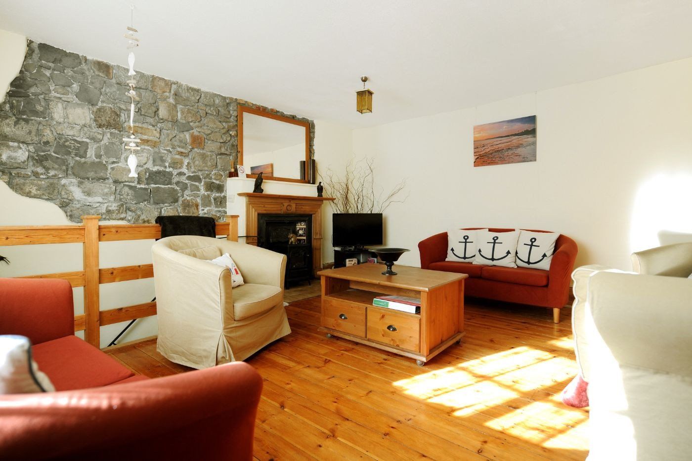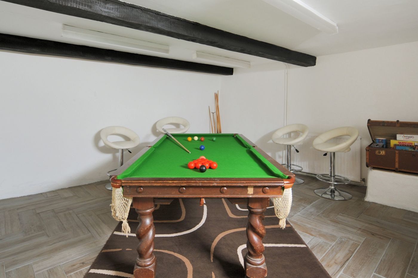 Accomodation Details Over three floors. Three bedrooms: 1 x king-size, 1 x twin, 1 x children’s bunk. Second-floor bathroom with bath with shower over, basin and WC. Ground-floor wet room with walk-in shower, basin and WC. Kitchen. Dining room with double sofa bed. Sitting room. Basement games room