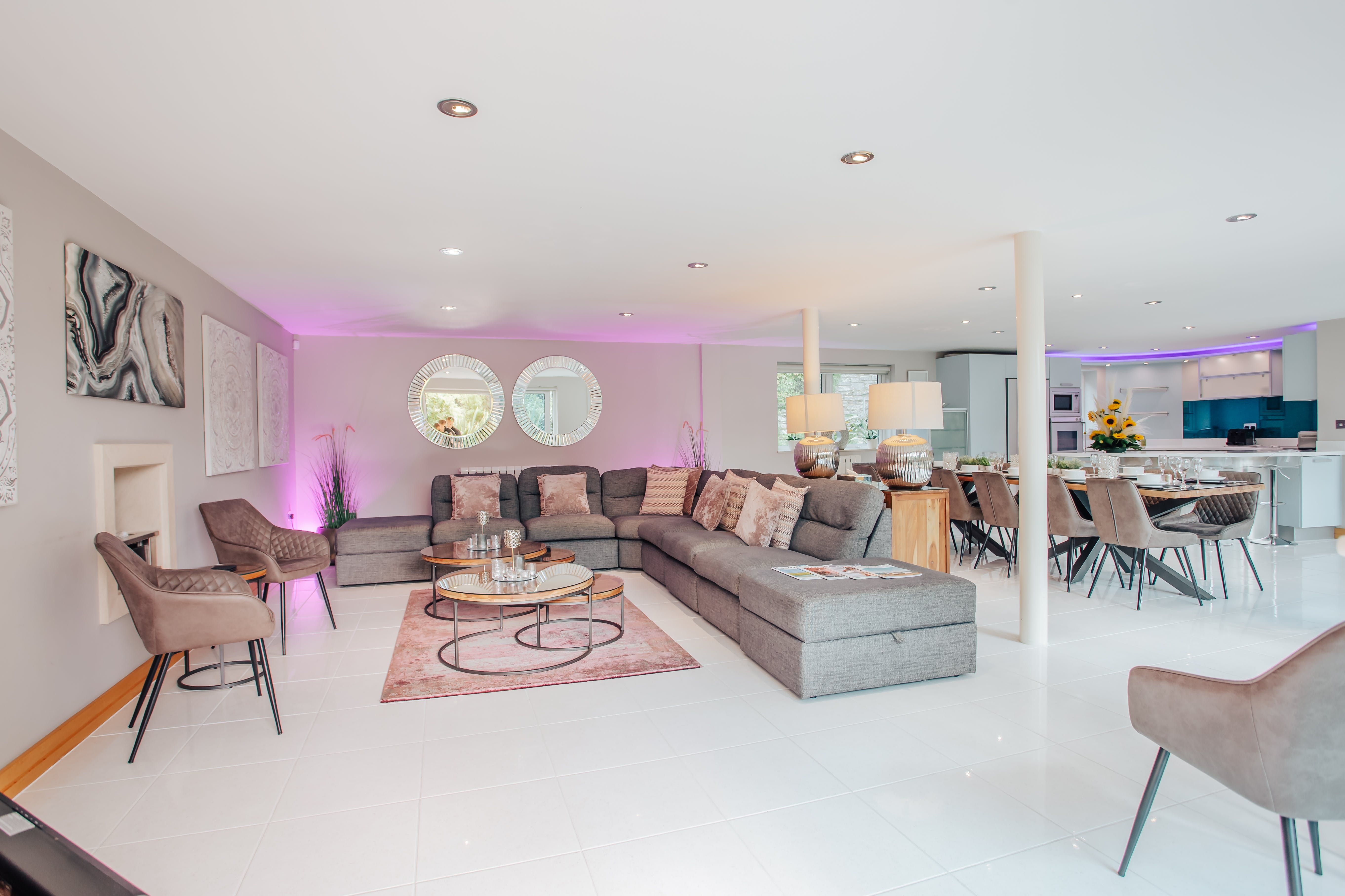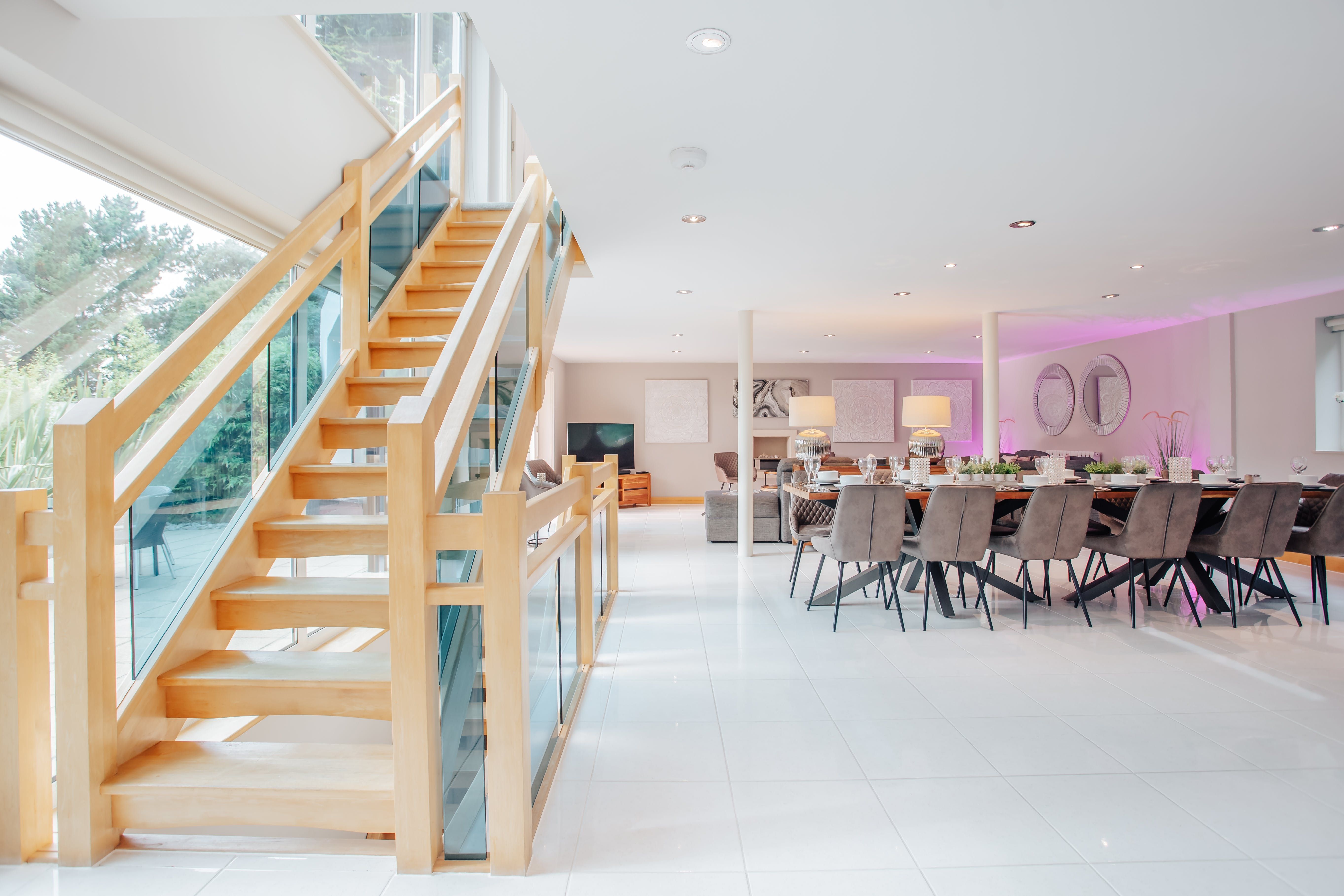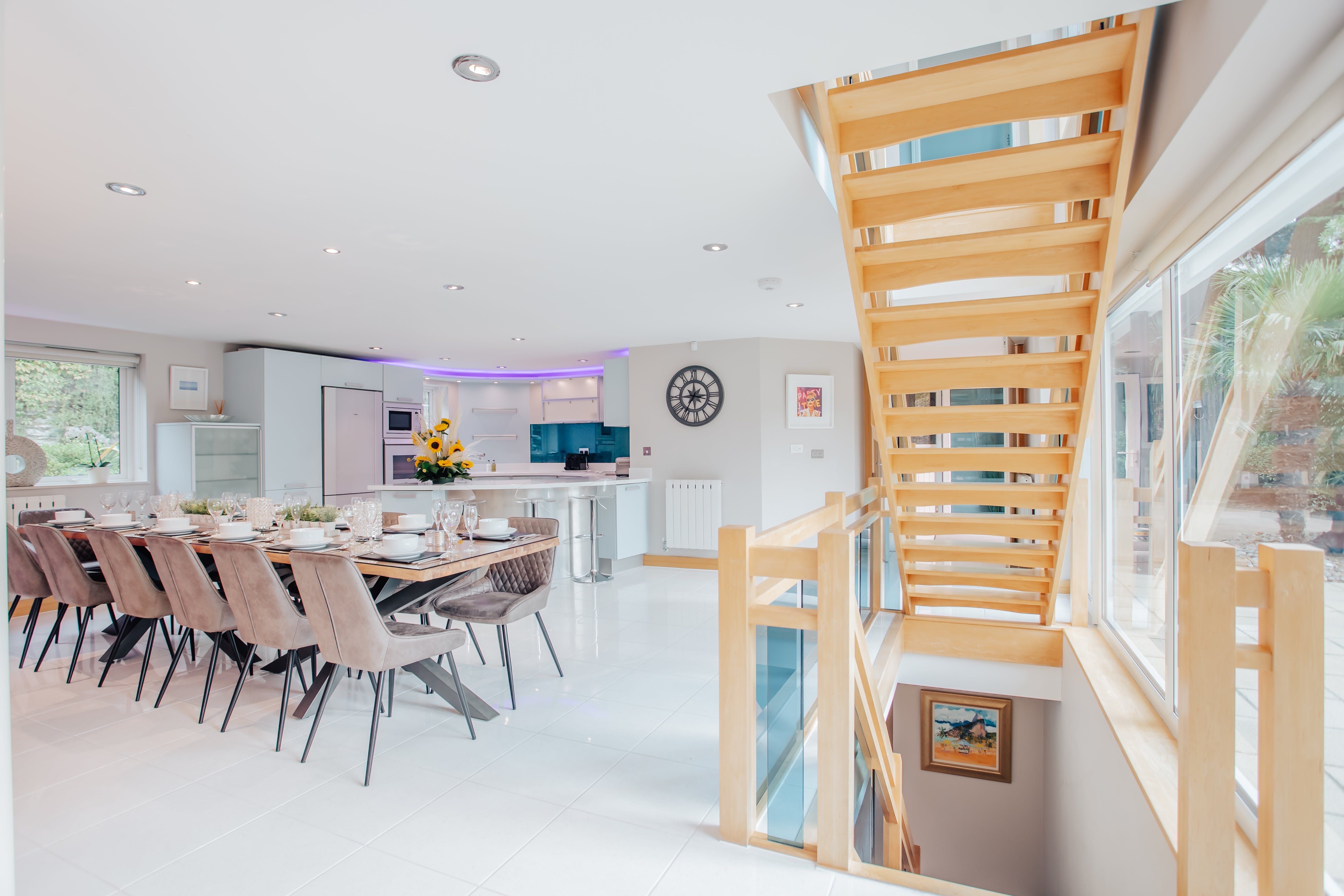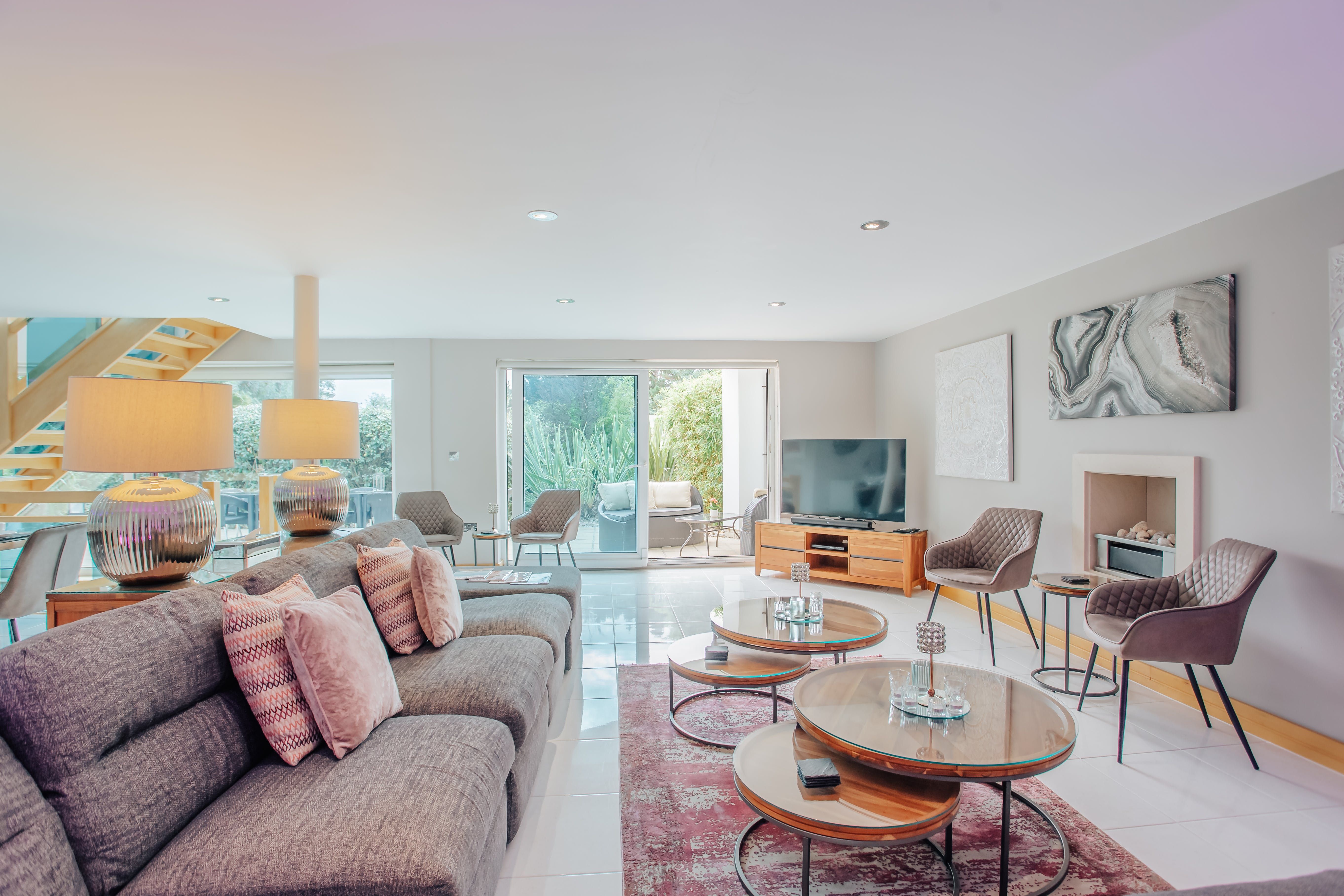 Step inside and you'll immediately be wowed by the spectacular open-plan layout of the ground floor. In addition to a welcoming seating area, the gargantuan fourteen-seater dining table and designer kitchen create the ultimate multi-purpose space. Large sliding doors ensure plenty of natural light and offer direct access to the gorgeous garden. As the abundance of palm trees will attest, the south coast benefits from a balmy climate, so you'll likely be able to enjoy the outdoors for a surprisingly large part of the year.