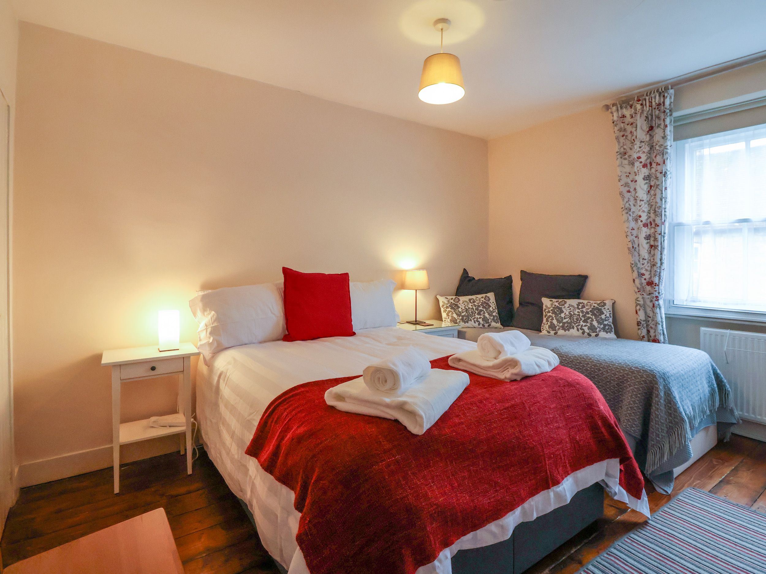 Accomodation Details Two bedrooms: 1 x king-size, 1 x family room with double and single. Ground-floor shower room with walk-in shower, basin, heated towel rail and WC. Kitchen/diner. Sitting room with electric fire