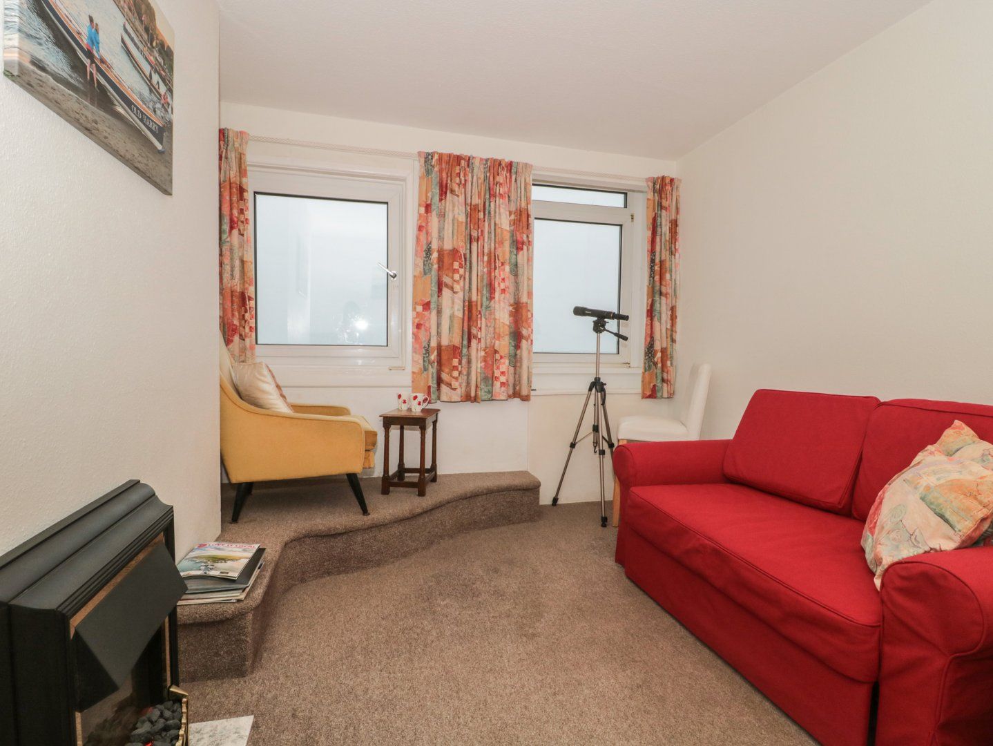 Second-floor apartment. One king-size bedroom which can be split into two single beds upon request. Bathroom with bath, shower over, basin, and WC. Kitchen/diner. Sitting room with electric fire