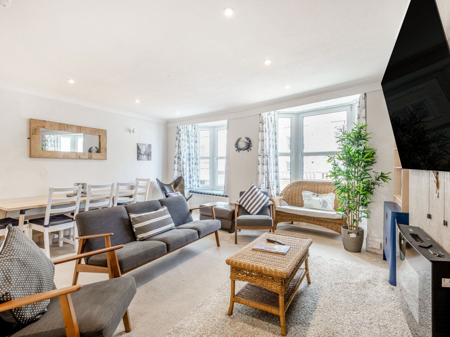 Gas central heating with electric fire. Electric oven and hob, microwave, fridge/freezer, washing machine and dishwasher. TV, WiFi. Fuel and power inc. in rent (Please see note below). Bed linen and towels inc. in rent. Highchair and travel cot available. Enclosed first-floor garden with decked area, furniture and barbecue. Roadside parking available. Sorry, no smoking and no pets. Convenience store below apartment, pub 0.1 miles, beach 0.05 miles. Note: The maximum occupancy for this property is 6 people. Please note: A fixed amount of fuel and power is included £75pw is prepaid 1 October to 31 March and £30pw 1 April - 30 September. Additional fuel and power can be purchased in the convenience store below if required