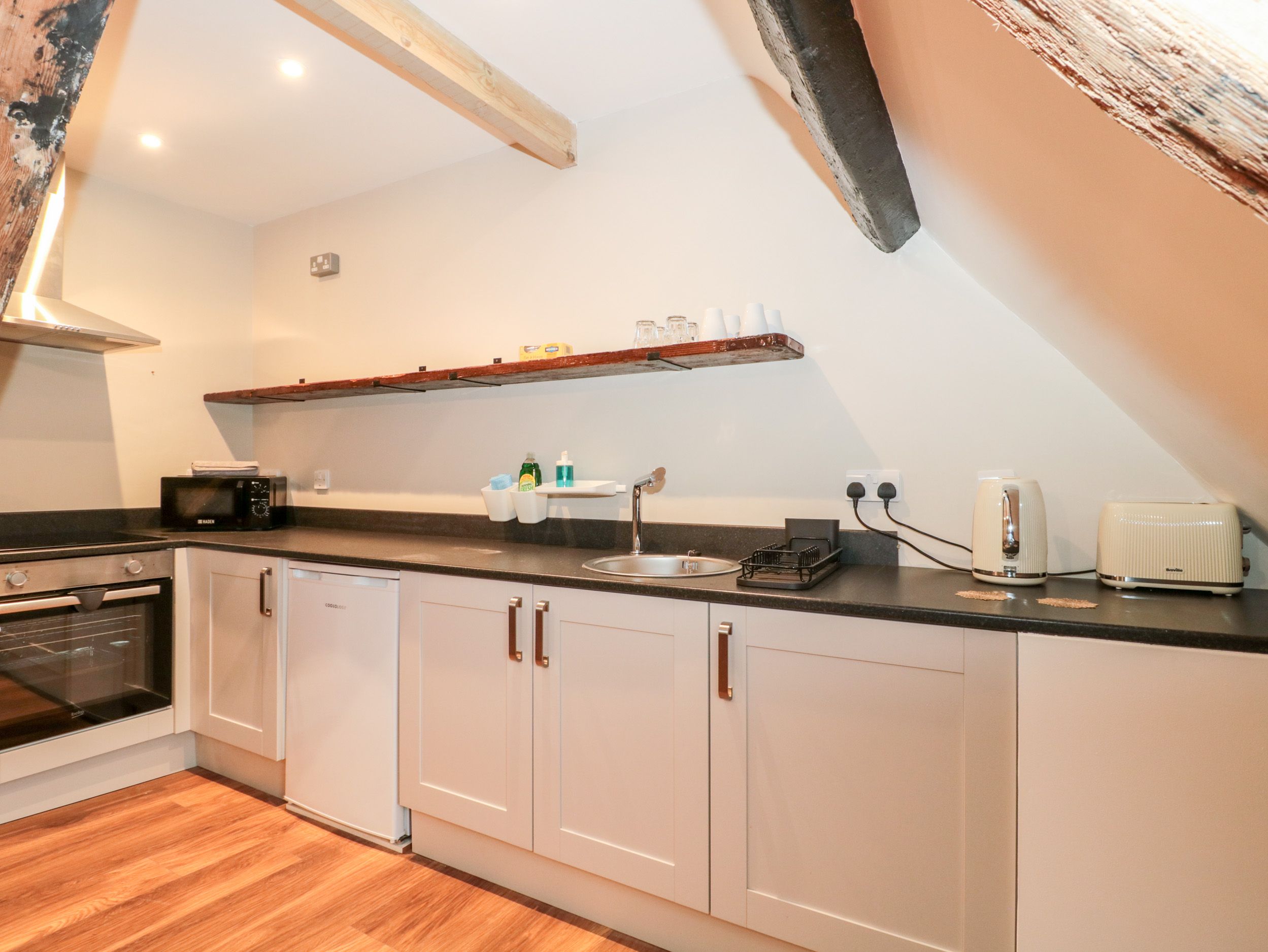 Amenities Electric central heating. Electric oven and hob, microwave, fridge with freezer compartment, kettle, toaster. Smart TV, WiFi. Fuel and power inc. in rent. Bed linen and towels inc. in rent. Highchair and travel cot available. Roadside parking with close-by car parks. Two well-behaved pets welcome. Sorry, no smoking. Shop and pub 0.1 miles, beach 0.3 miles. Note: Communal washing machine and tumble dryer. Note: Limited headroom in property