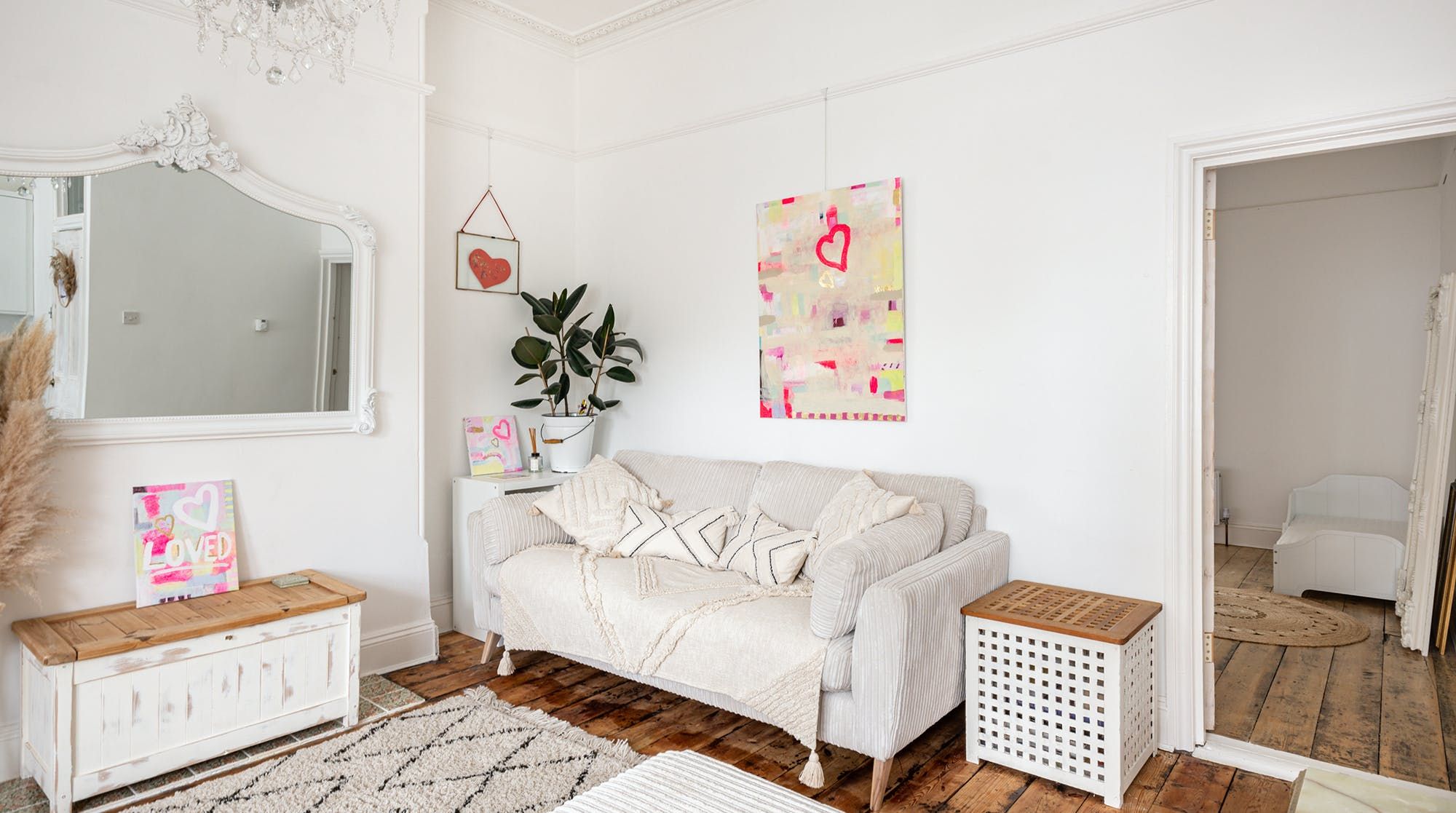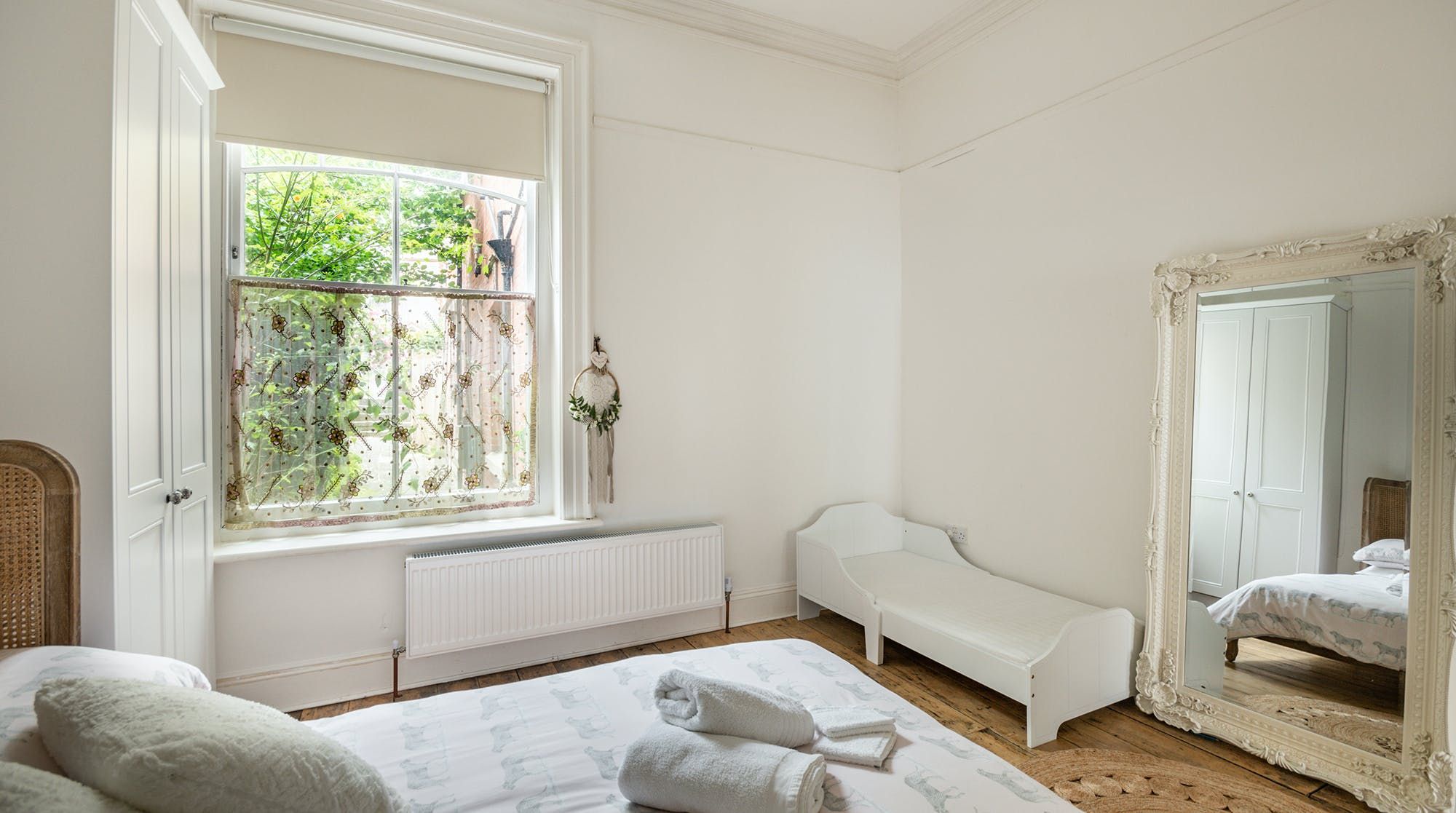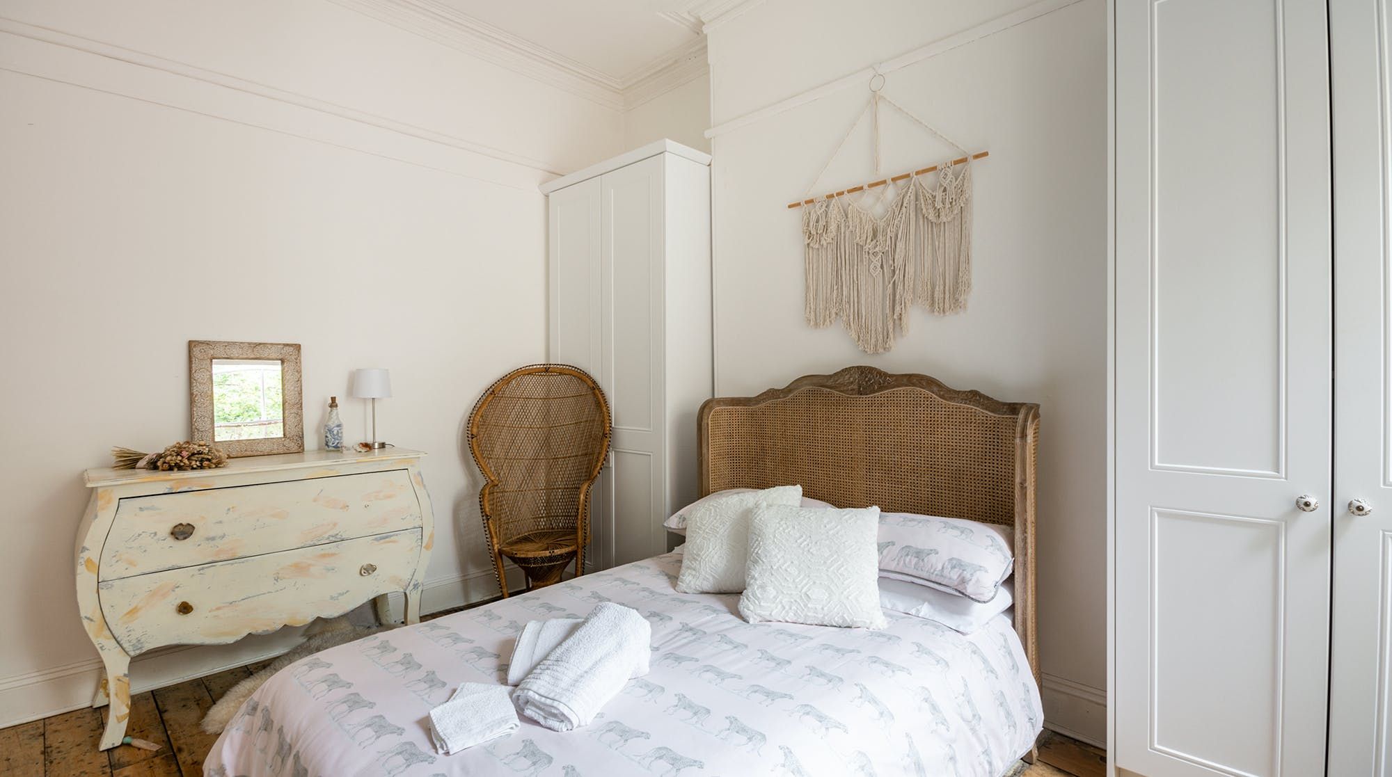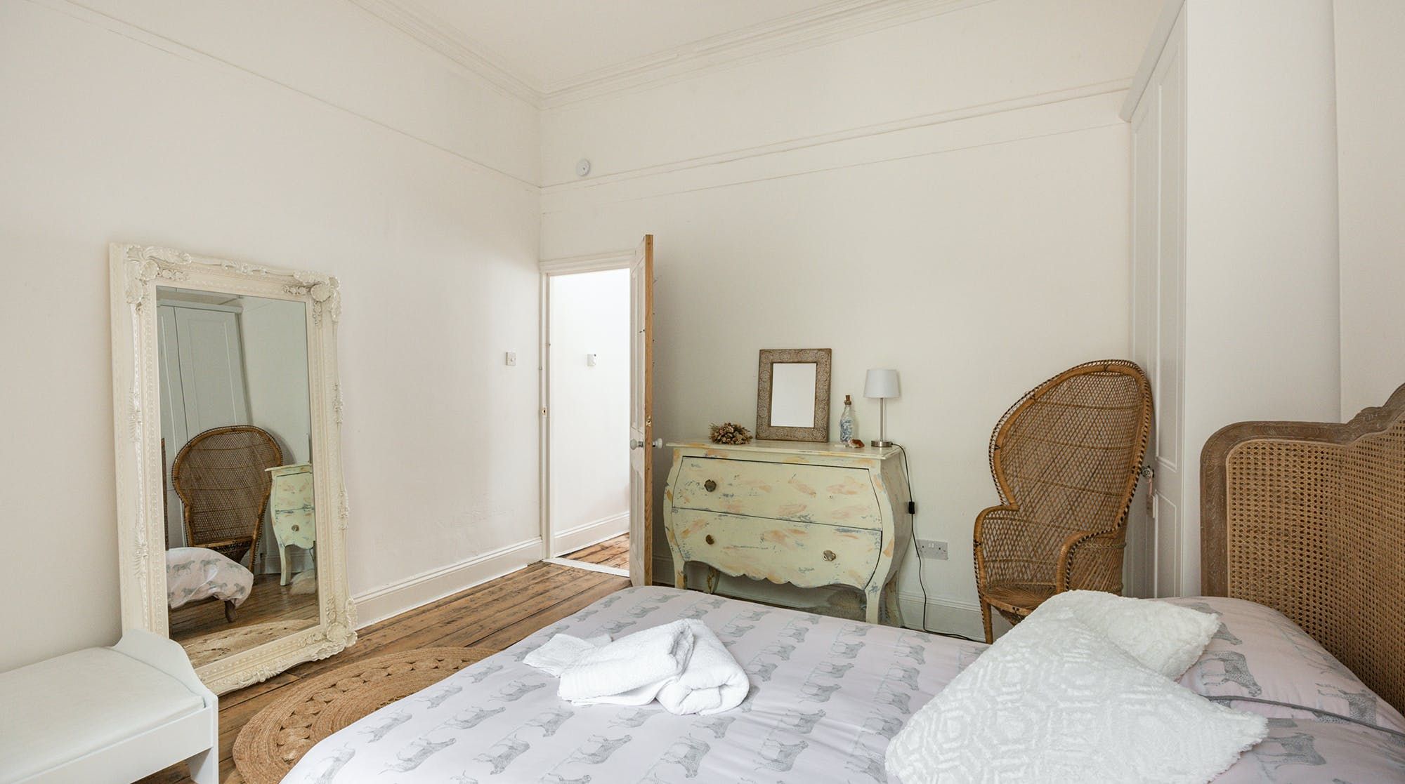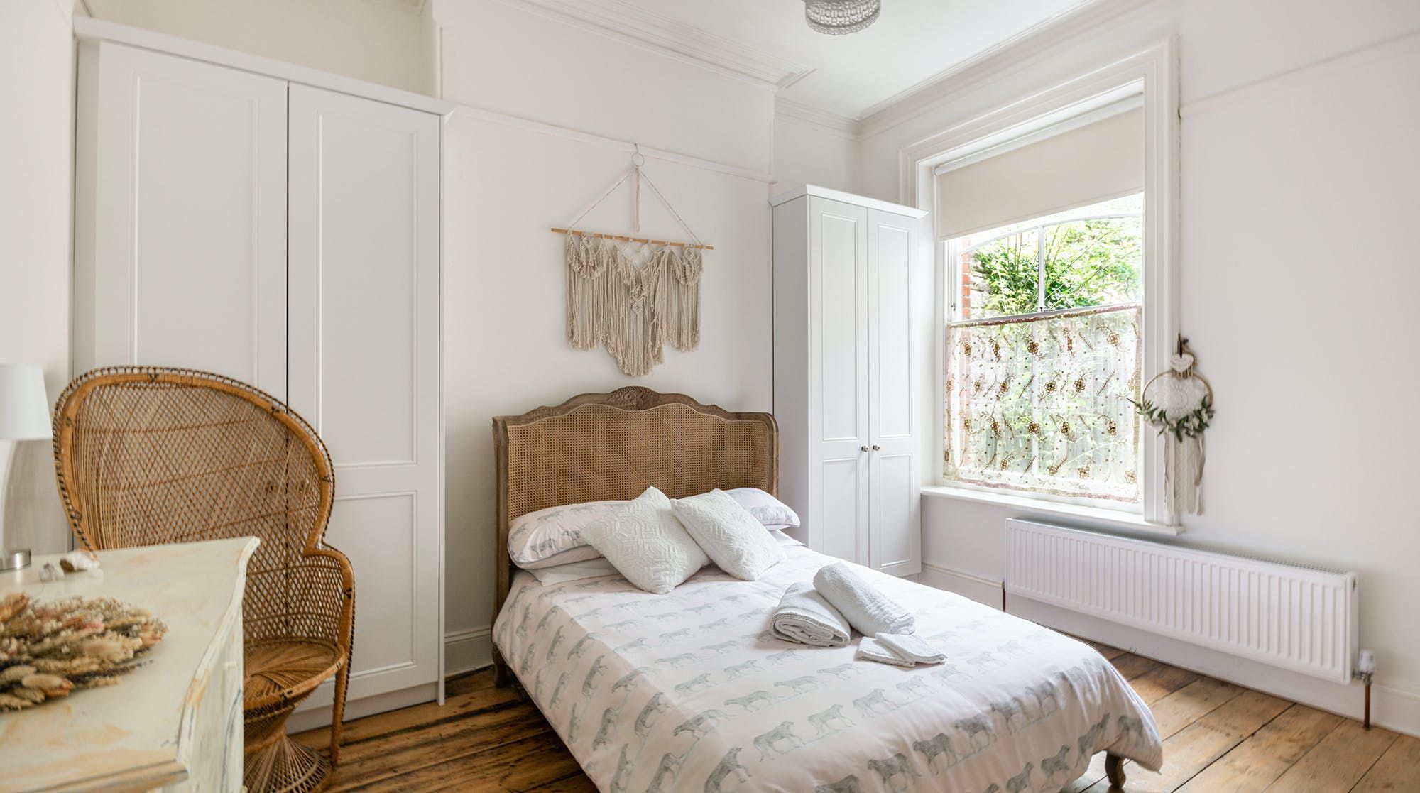 Tall ceilings, sash windows, oak floorboards and chandeliers are the order of the day here, along with all-white decor and pops of colourful modern art. There's a squashy sofa in the cosy living room, and a well-kitted-out, modern kitchen if you'll be cooking at home. But it's the bedroom we really love here, with its vintage rattan headboard and French vintage furniture.