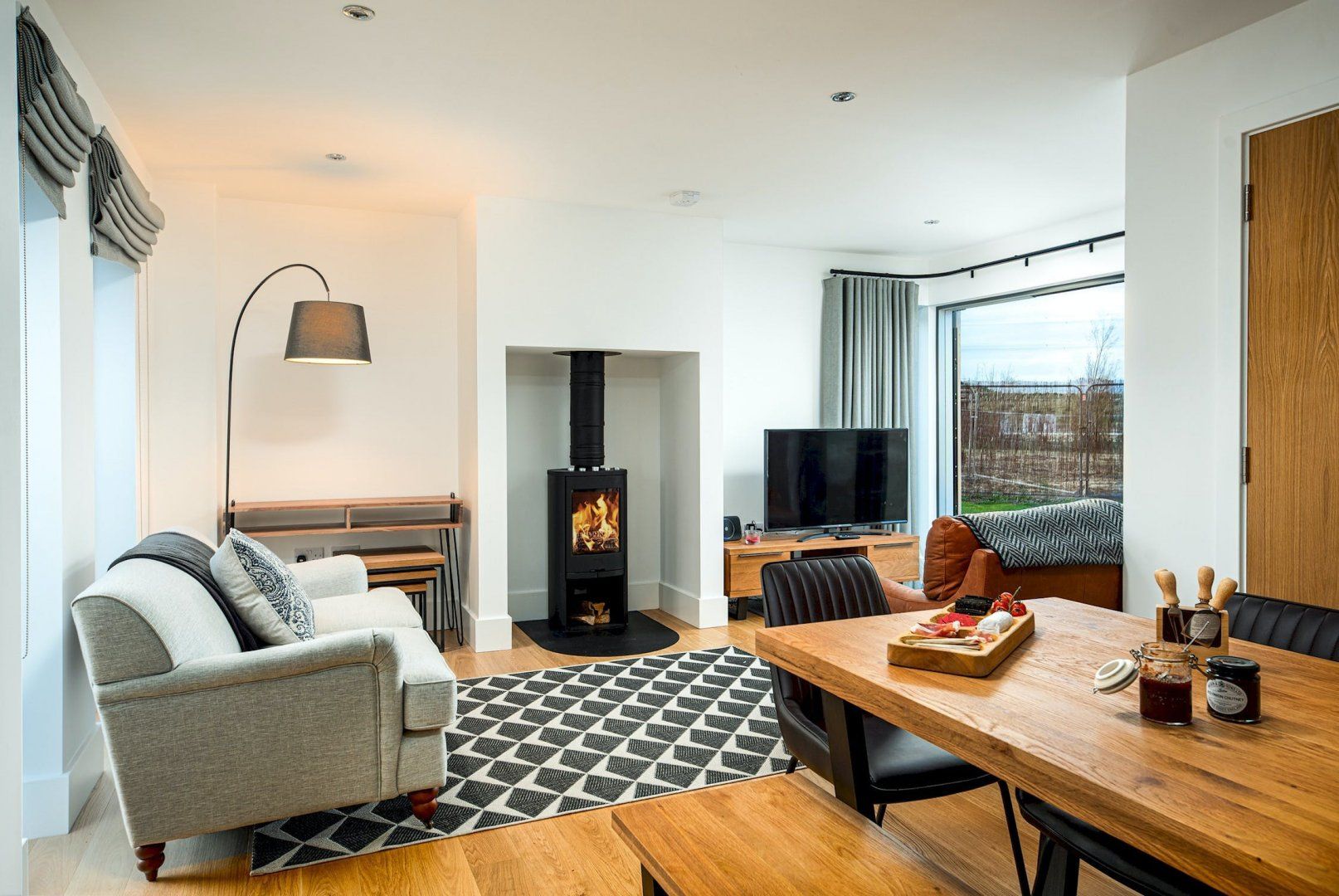 Set within a lakeside holiday estate in West Dorset, this two-level home is all about taking advantage of the great outdoors on its doorstep. Communal access to the on-site heated swimming pool, spa and restaurant ensure plenty of relaxing downtime, while the gym, tennis courts, children’s playground and array of watersports on offer are on hand for when you wish to ramp up the activity level. The holiday site also boasts access to a beach where you can while away sunny hours on the sands. And after a fun-filled day, there’s no better way to end the evening than with an alfresco meal on the private patio, followed by a glass of wine by the living room’s fire.