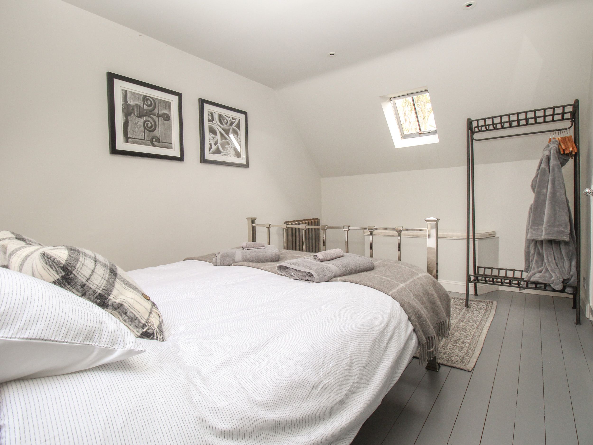 Three bedrooms: 1 x ground-floor double, 1 x double, 1 x bunk room. Ground-floor shower room with walk-in shower, basin, and WC. Bathroom with roll top bath, basin and WC. Open-plan living space with kitchen, dining area and sitting area