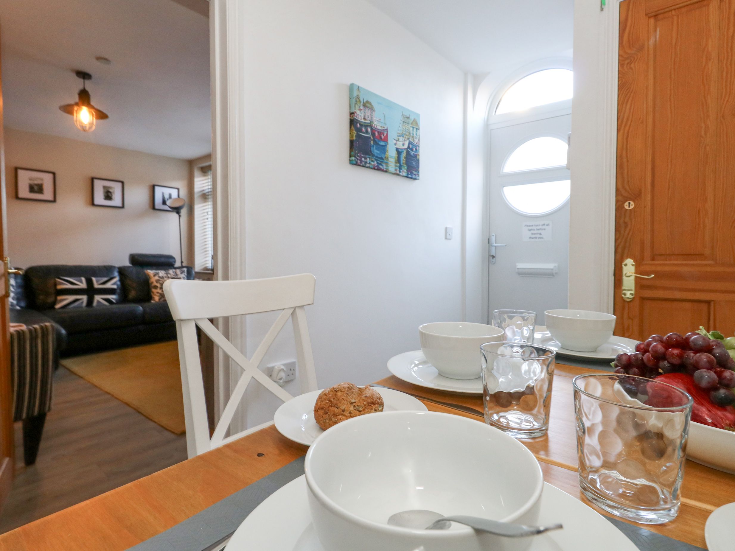 Holiday home Anchor Cottage rests in Weymouth, Dorset. Hosting one en-suite king-size bedroom with sofa bed and TV, one king-size bedroom and one single bedroom, along with one bathroom and cloakroom with WC, this three-storey property can sleep up to six guests. Bathroom with bath, shower over, basin, and WC. Cloakroom with basin and WC. There is also an open-plan living space with kitchen, dining area, and sitting area.