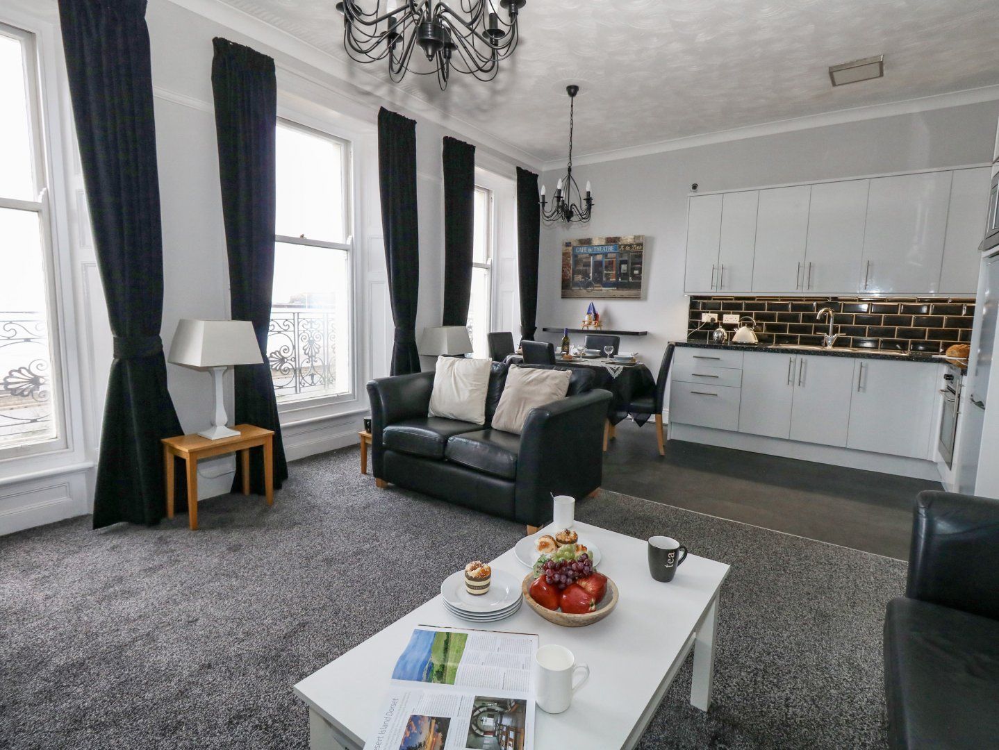 First-floor apartment. 1 x king-size with ensuite shower, basin and WC. 1 x king size. Bathroom with walk in shower, basin and WC. Open-plan living space with kitchen, dining and sitting area. Balcony