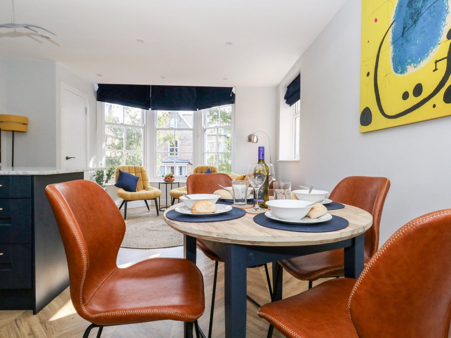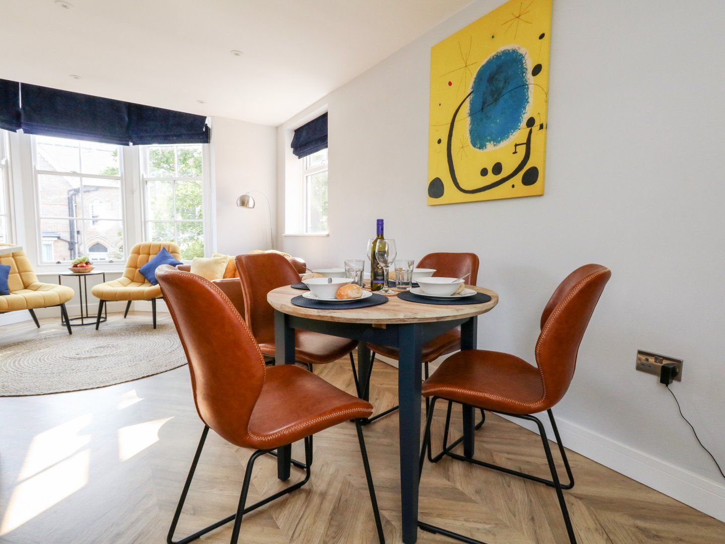 Accomodation Details First-floor apartment accessed via stairs. Two bedrooms: 1 x double, 1 x twin. Bathroom with bath, shower over, basin, heated towel rail, and WC. Open-plan living space with kitchen, dining area and sitting area. Small snug room