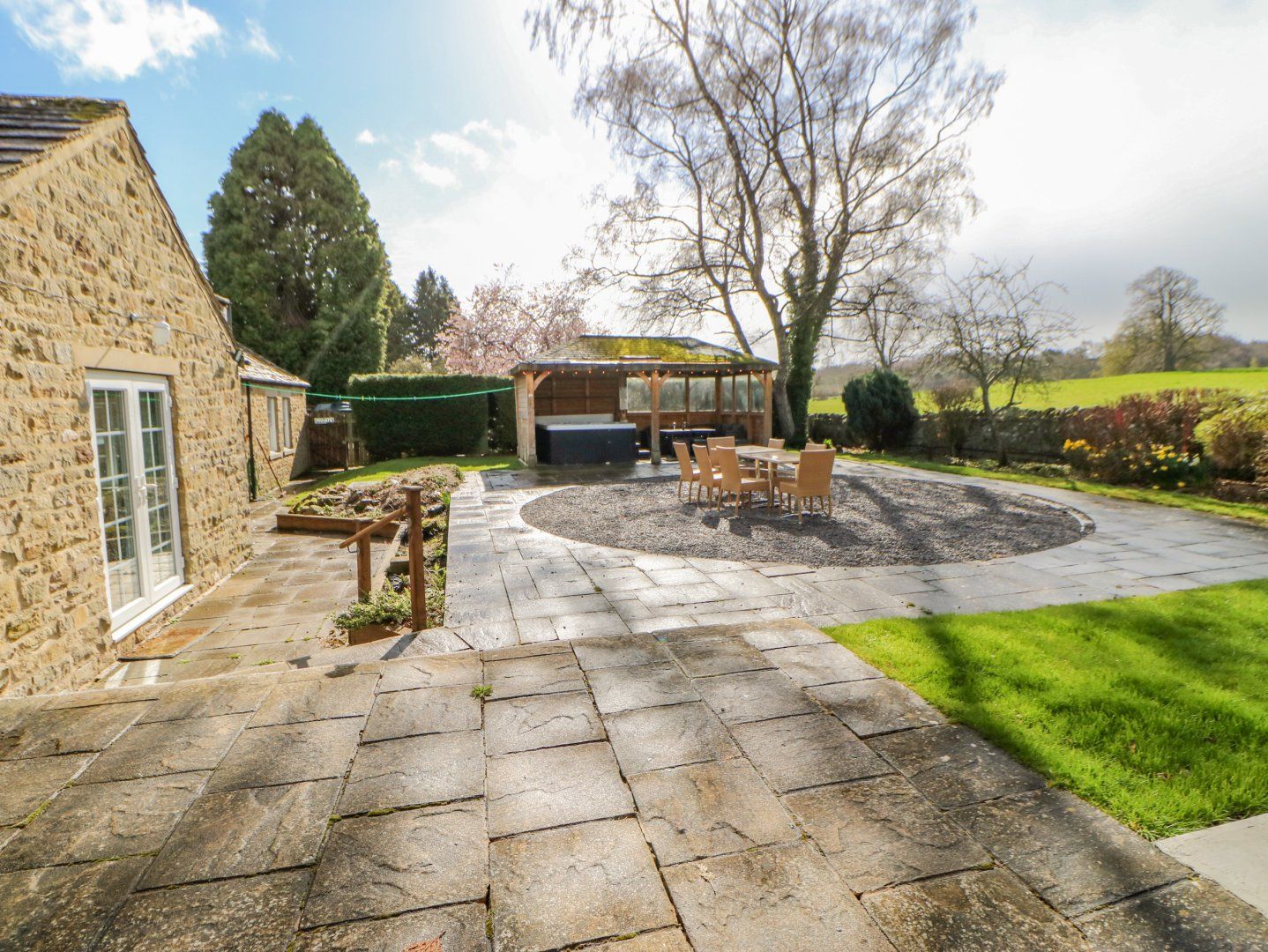 Amenities Gas central heating with open fire. 2 x Oven, 2 x hob, microwave, 2 x fridge/freezer and dishwasher. 10 x TV, WiFi. Fuel and power inc. in rent. Bed linen and towels inc. in rent. Highchair and travel cot available on request. Ample off-road parking. Enclosed rear garden with lawned area, patio, furniture and 2 x hot tubs, Please note: hot tubs are not guaranteed to be up to temperature on arrival. Sorry, no smoking. Shop 3.8 miles, pub 0.1 miles. Note: There are several steps on the ground-floor in the living areas