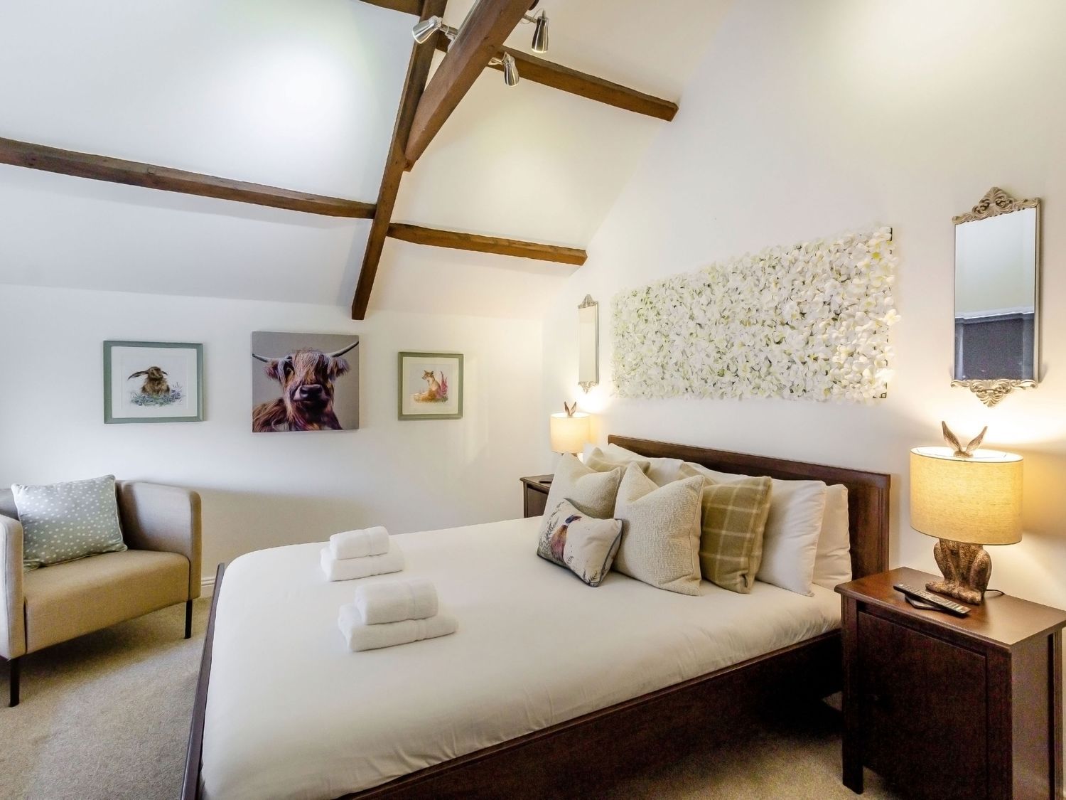 Duplex apartment set over first and second floor. Three bedrooms: 1 x king-size with TV and with en-suite rain shower, basin and WC, 1 x second-floor king-size, 1 x second-floor double. Bathroom with bath and hand-held shower, walk-in shower, basin and WC. First-floor kitchen/diner. First-floor sitting room with electric fire