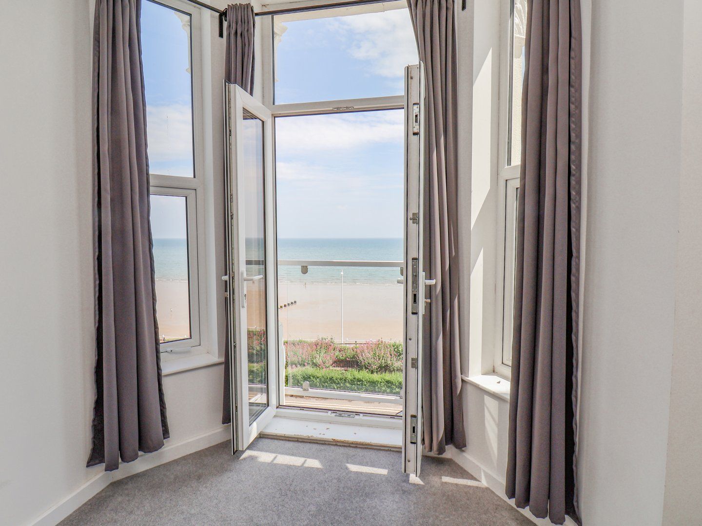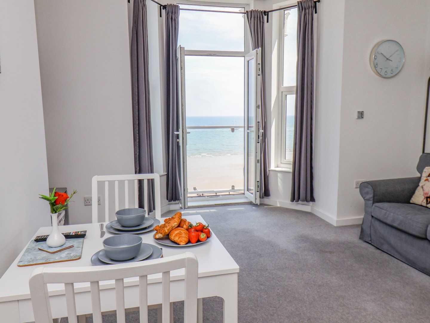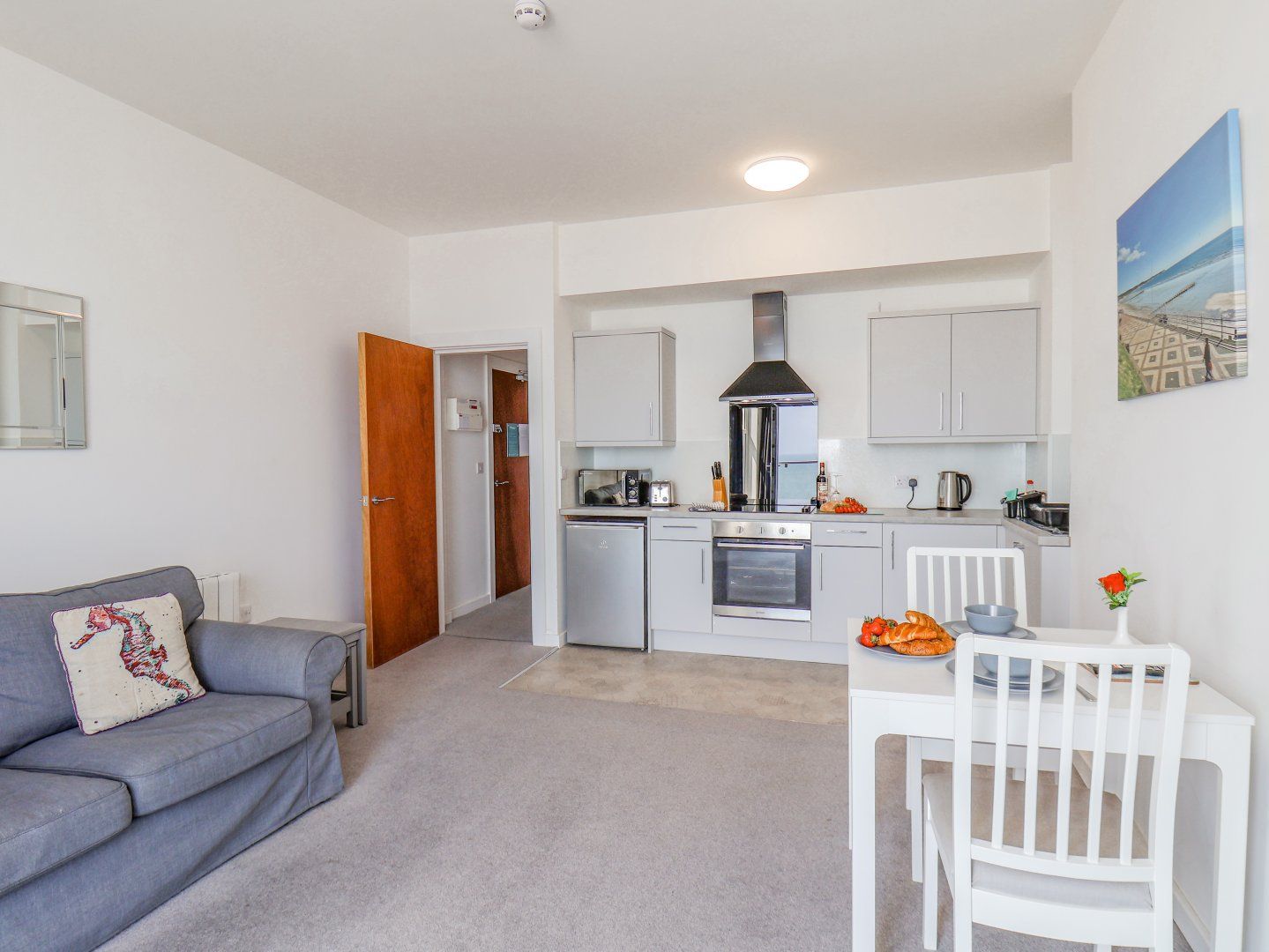 Accomodation Details First-floor apartment with sea views. One double bedroom. Shower room with walk-in shower, basin, heated towel rail, and WC. Open-plan living space with kitchen, dining area and sitting area. Juliet balcony