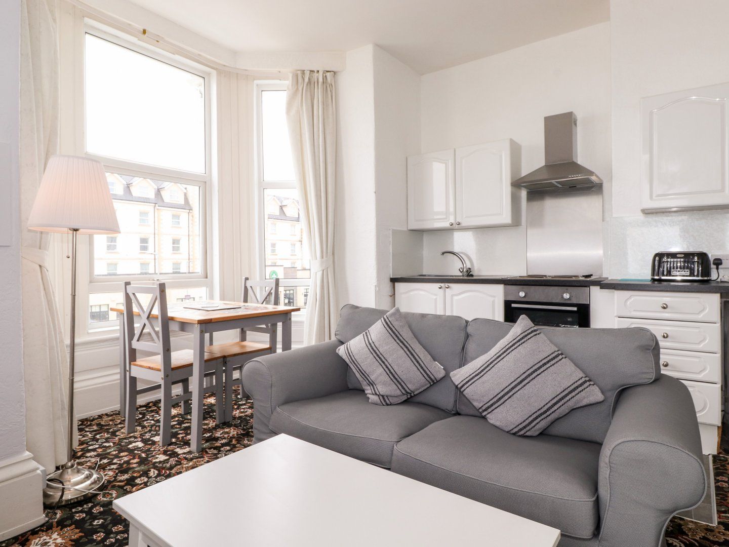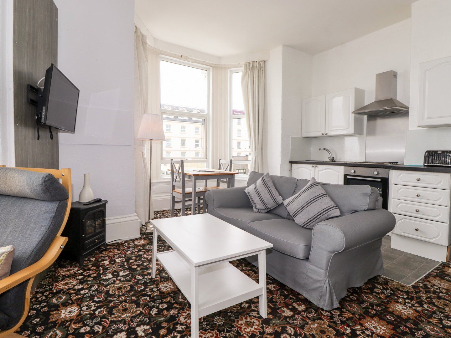 First-floor apartment with sea views. One twin bedroom with en-suite walk-in shower and basin and WC. Open-plan living space with kitchen, dining area and sitting area with electric stove-effect fire.