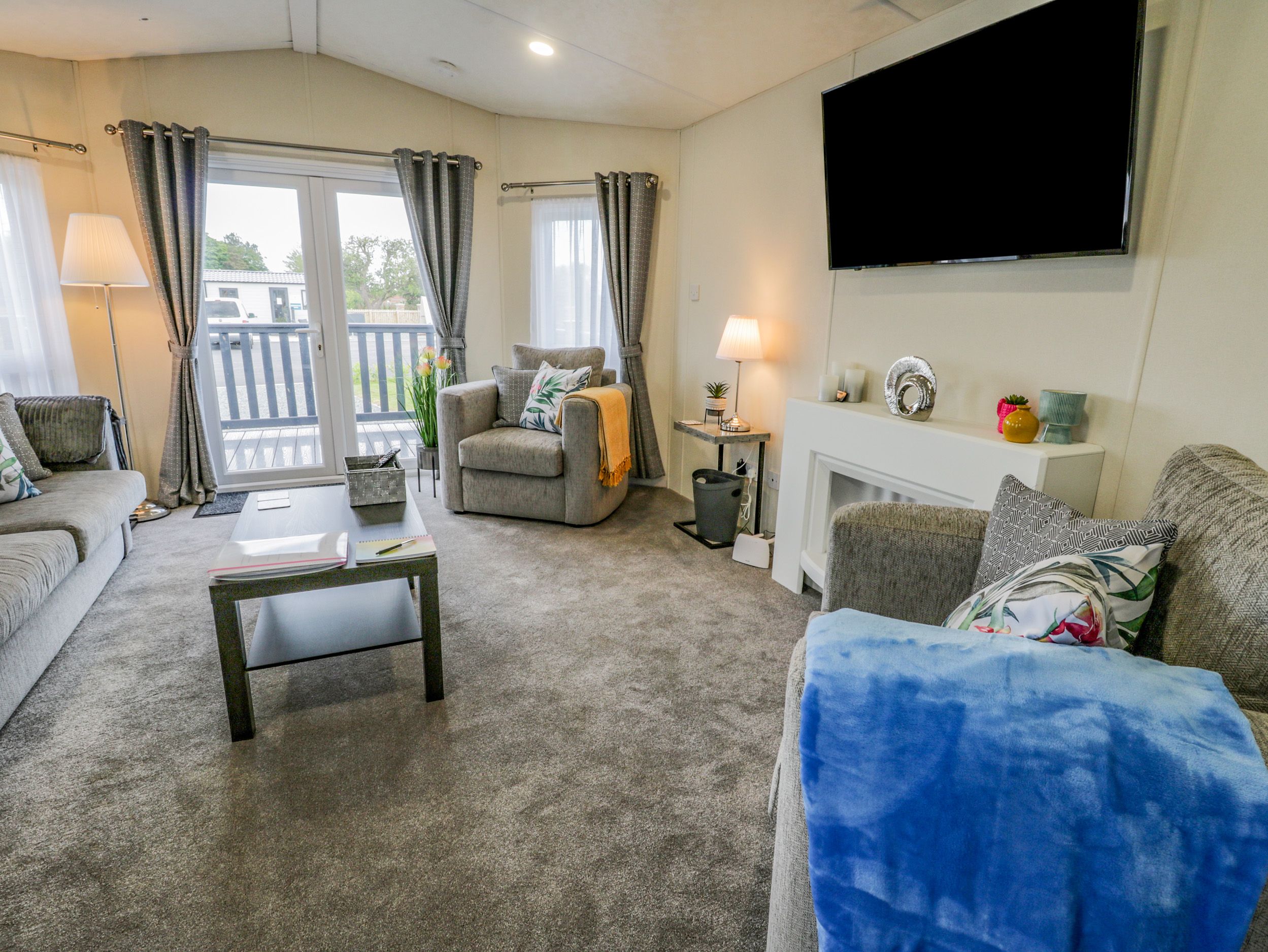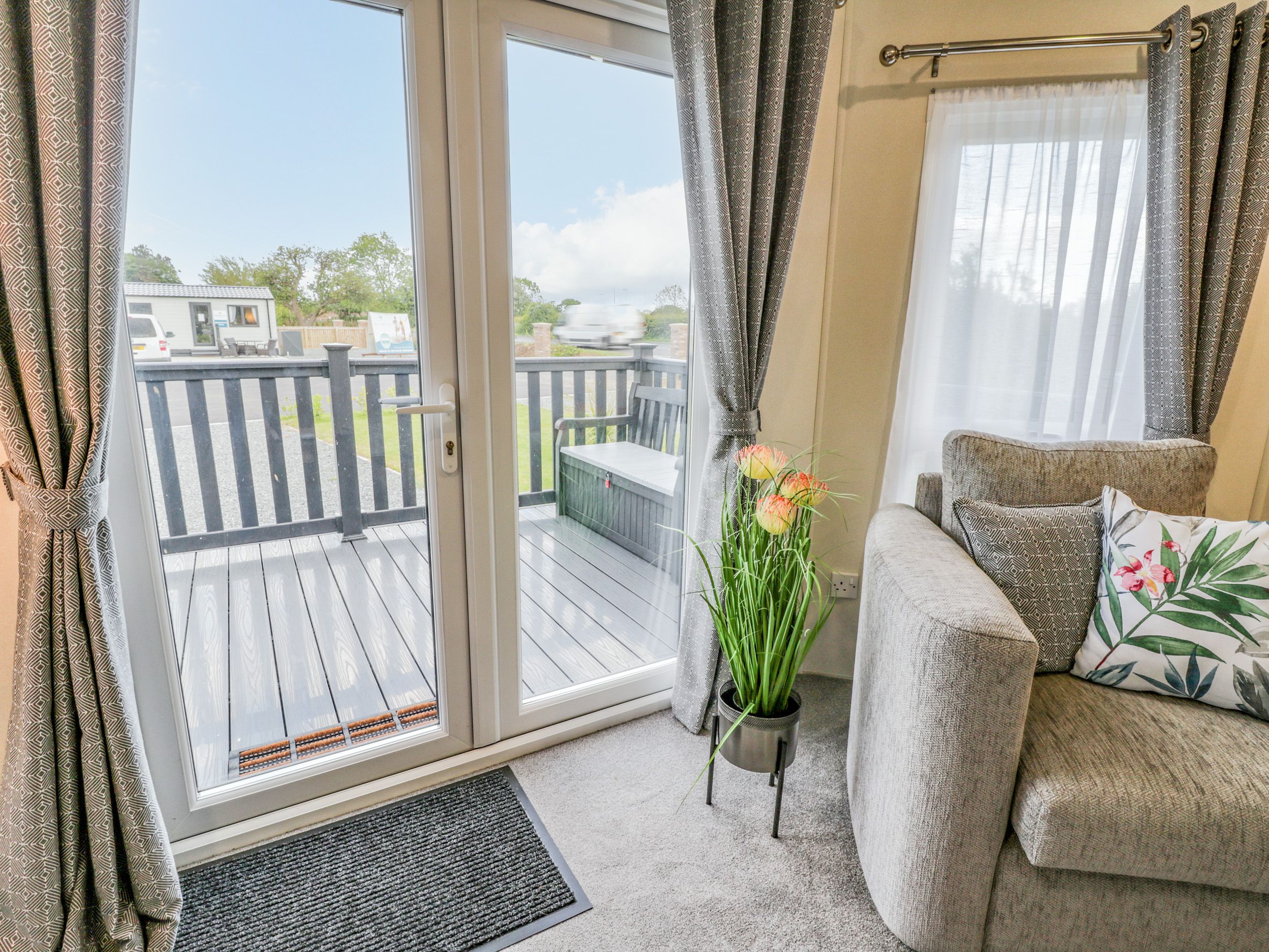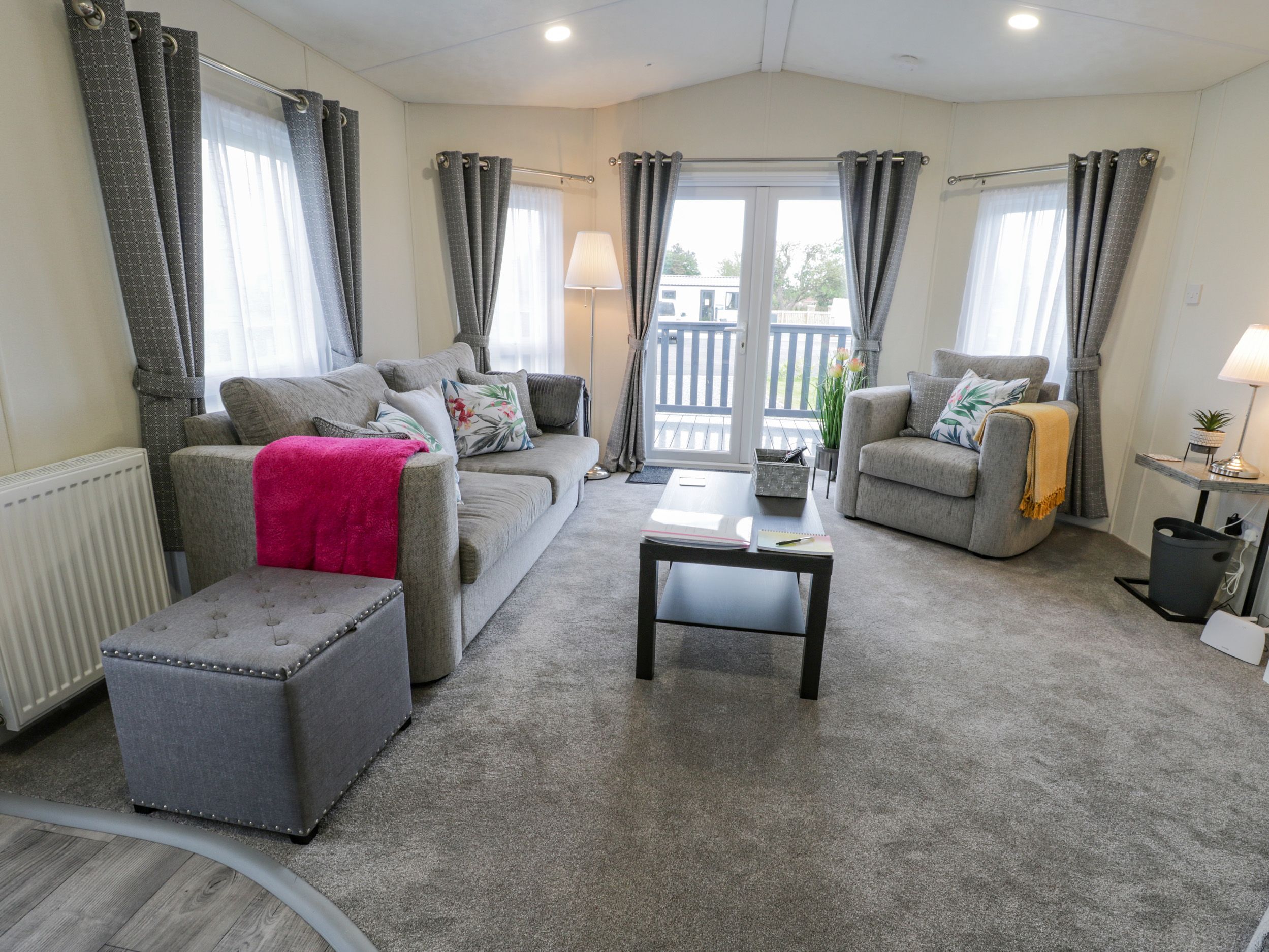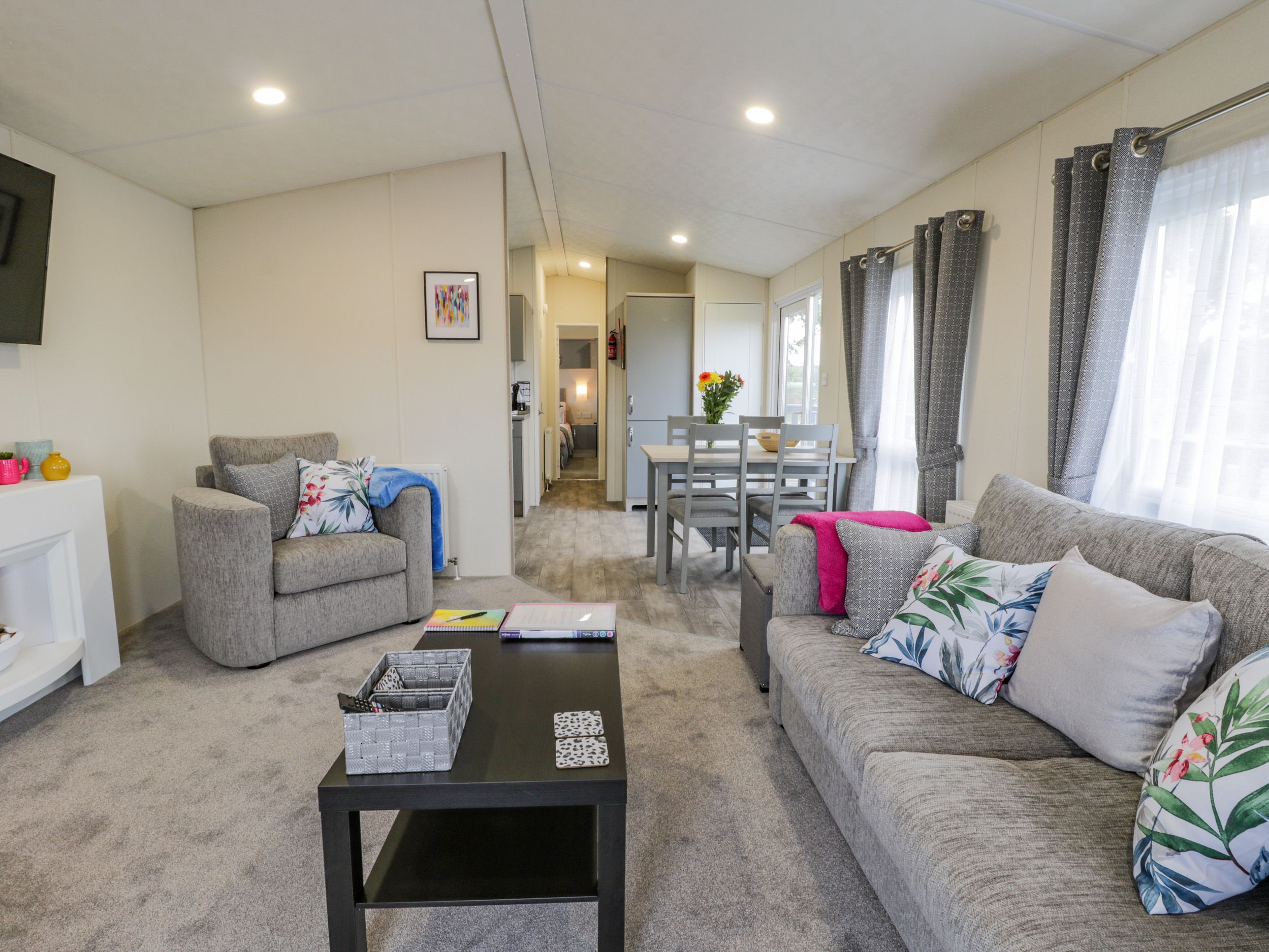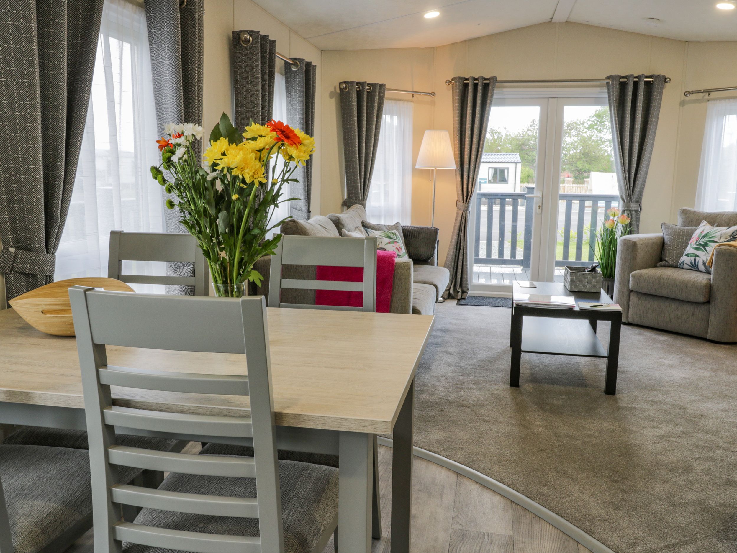 Holiday home This single-storey lodge has an open-plan living space with a kitchen, dining area for four guests, and a sitting area with a TV. Amenities include a gas oven and hob, microwave and fridge. There is one double bedroom with a TV and one twin bedroom, along with a bathroom. Outside, there is a decking area with furniture, and off-road parking for two cars. Within 1.1 miles, there is a shop, within 2.6, a pub, and within 1, a beach. One medium or two small, well-behaved dogs are welcome. Sorry, no smoking. WiFi, fuel, power, bed linen and towels are all included in the price. Note: there is a Golf Passport available to play over a 7 day period 3 rounds of golf for £66, 4 rounds for £84 or 5 rounds for £100- playing Belvedere plus any of the following Links, Flamborough, Filey, Hornsea and Scarborough South Cliff Property Reference 1107793 is also available to book. Make Happy Daze your holiday home to explore Yorkshire's renowned coast with your loved ones.