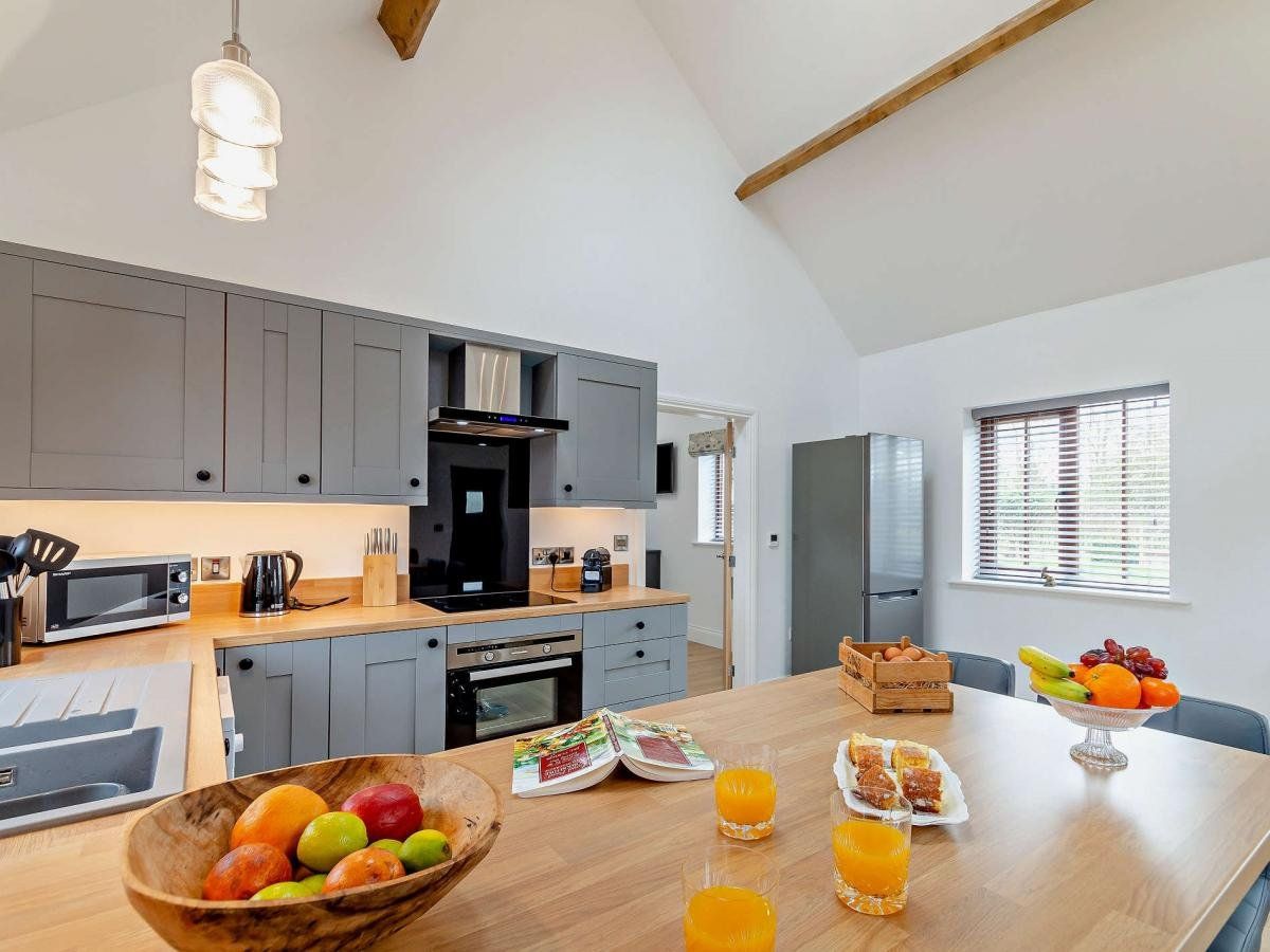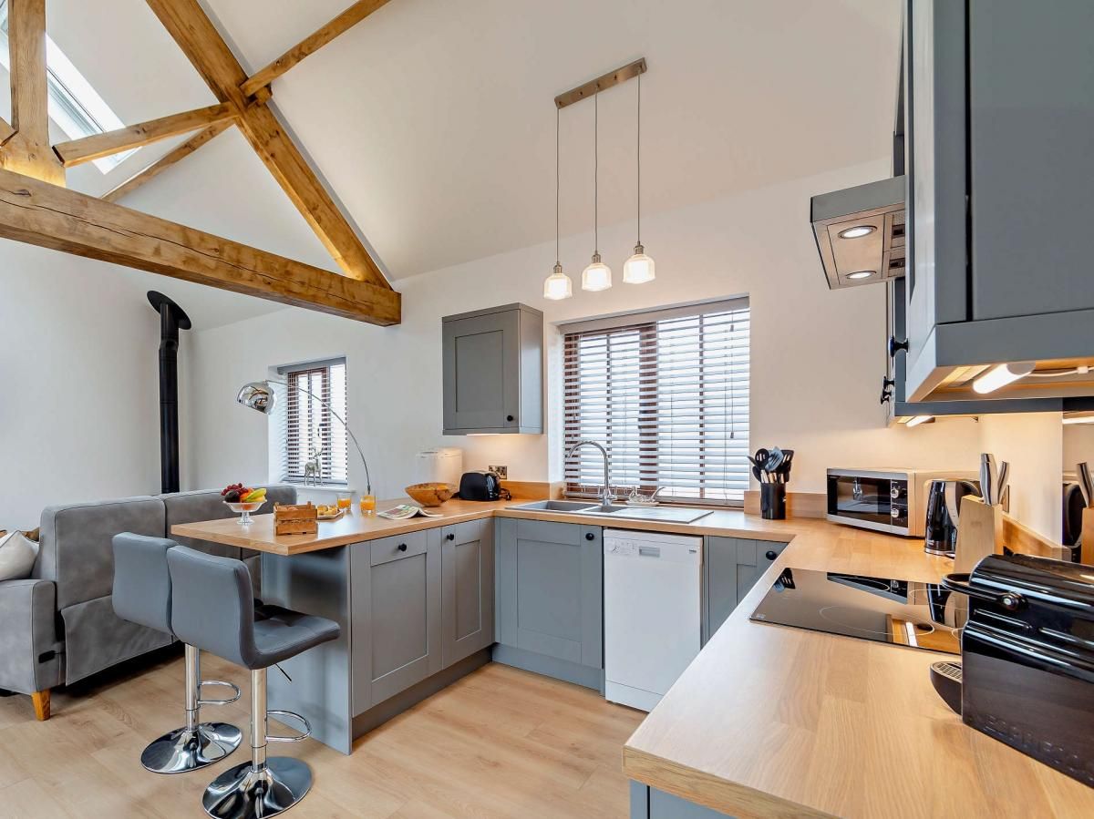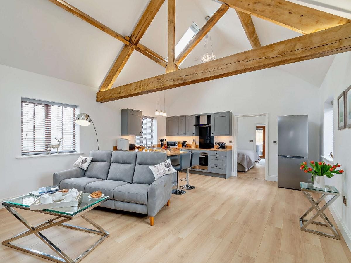 Swathed in luxury, the living room will encourage you to truly switch off and relax on the large grey sofa beneath the exposed beams.