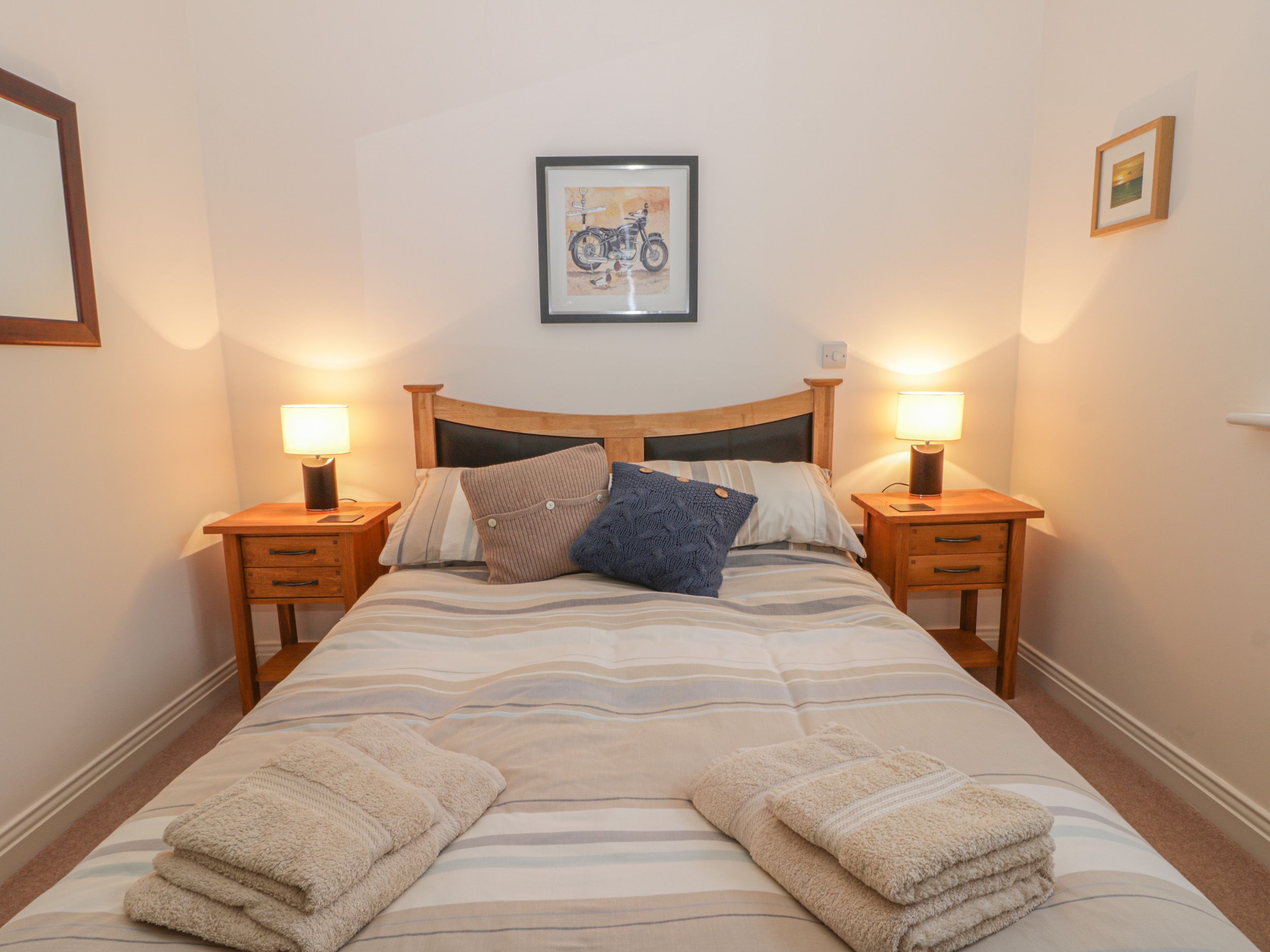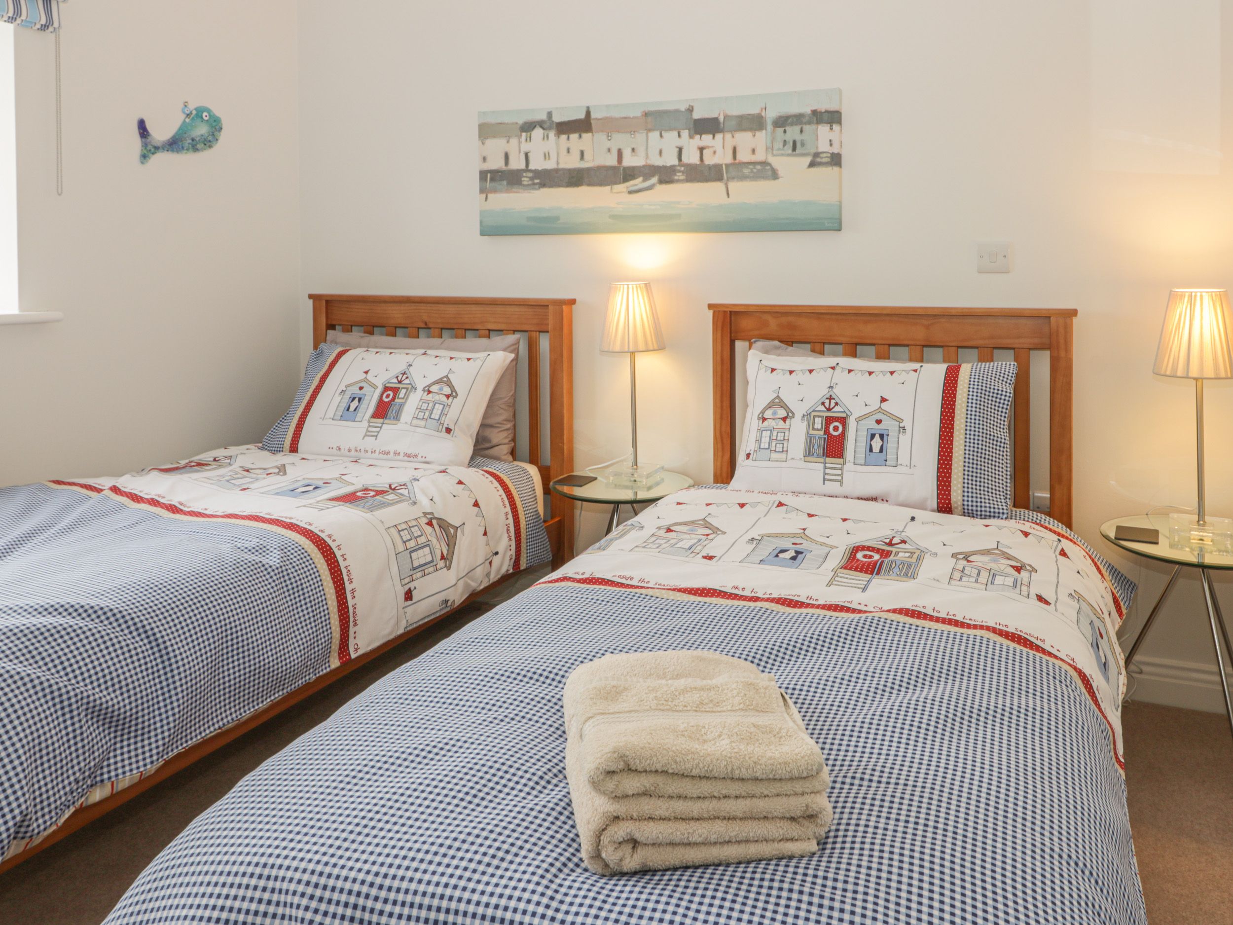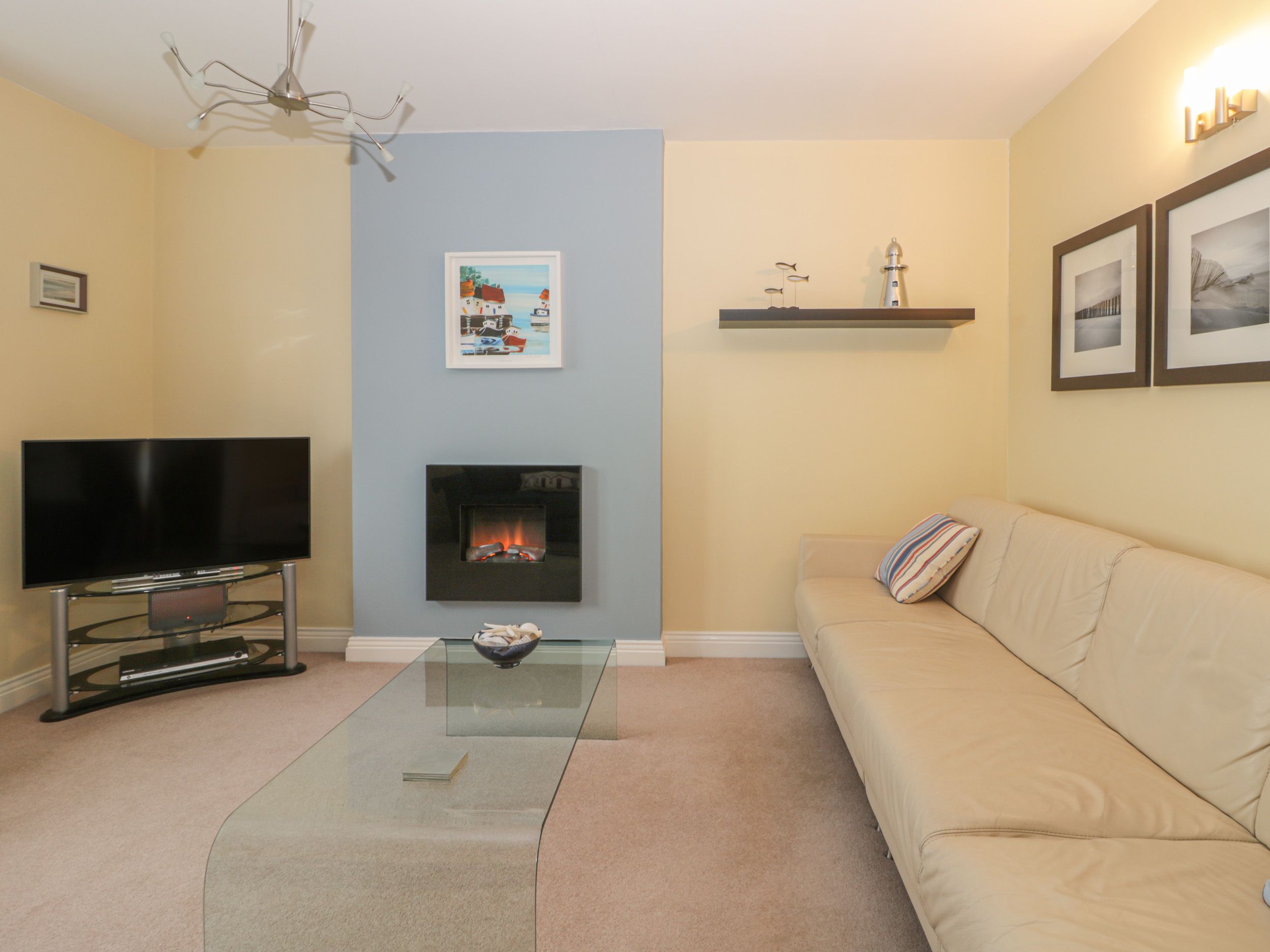 Amenities Gas central heating with electric fire. Electric oven and gas hob, microwave, fridge/freezer, washing machine, dishwasher, Smart TV, WiFi, TASSIMO coffee machine (pods not provided) selection of books, games and DVDs. Fuel and power inc. in rent. Bed linen and towels inc. in rent. Travel cot provided. Off-road parking for 2 cars in car park. Enclosed courtyard with seating. One well-behaved small dog welcome. Sorry, no smoking. Note: There are steps leading to front and back of property to access parking area - care to be taken. Note: Steps in the property are open and wooden, please take care and dogs may need to be carried. Shop 0.4 miles, pub 0.3 miles. Beach 0.5 miles. Note: The property isn't suitable for people with limited mobility.