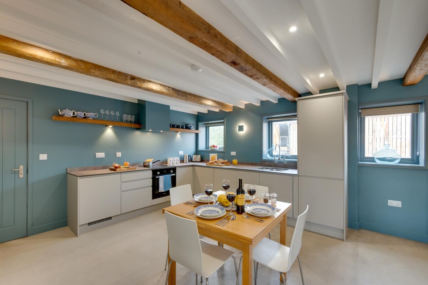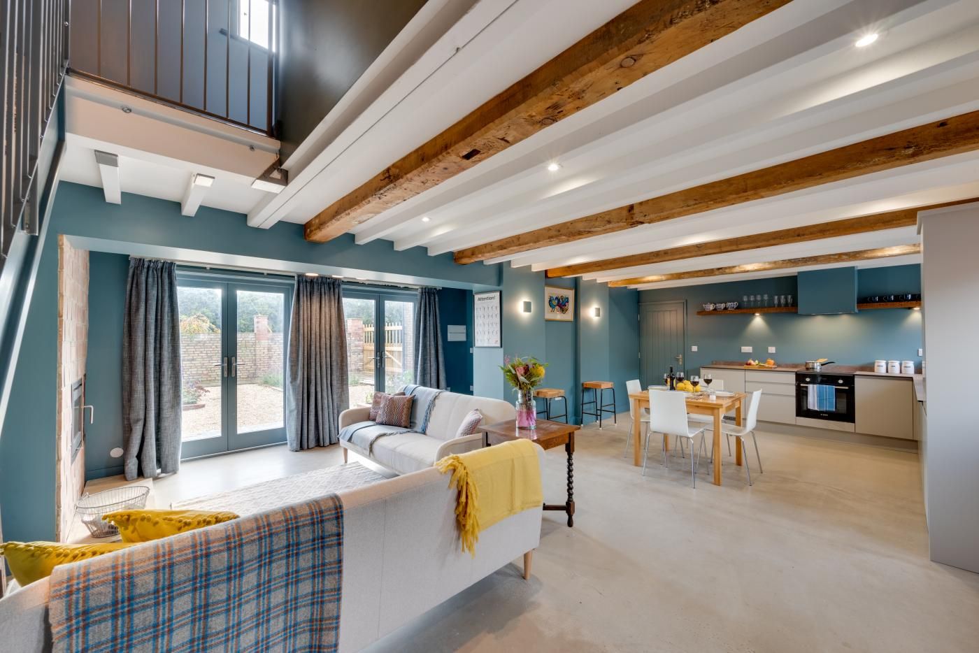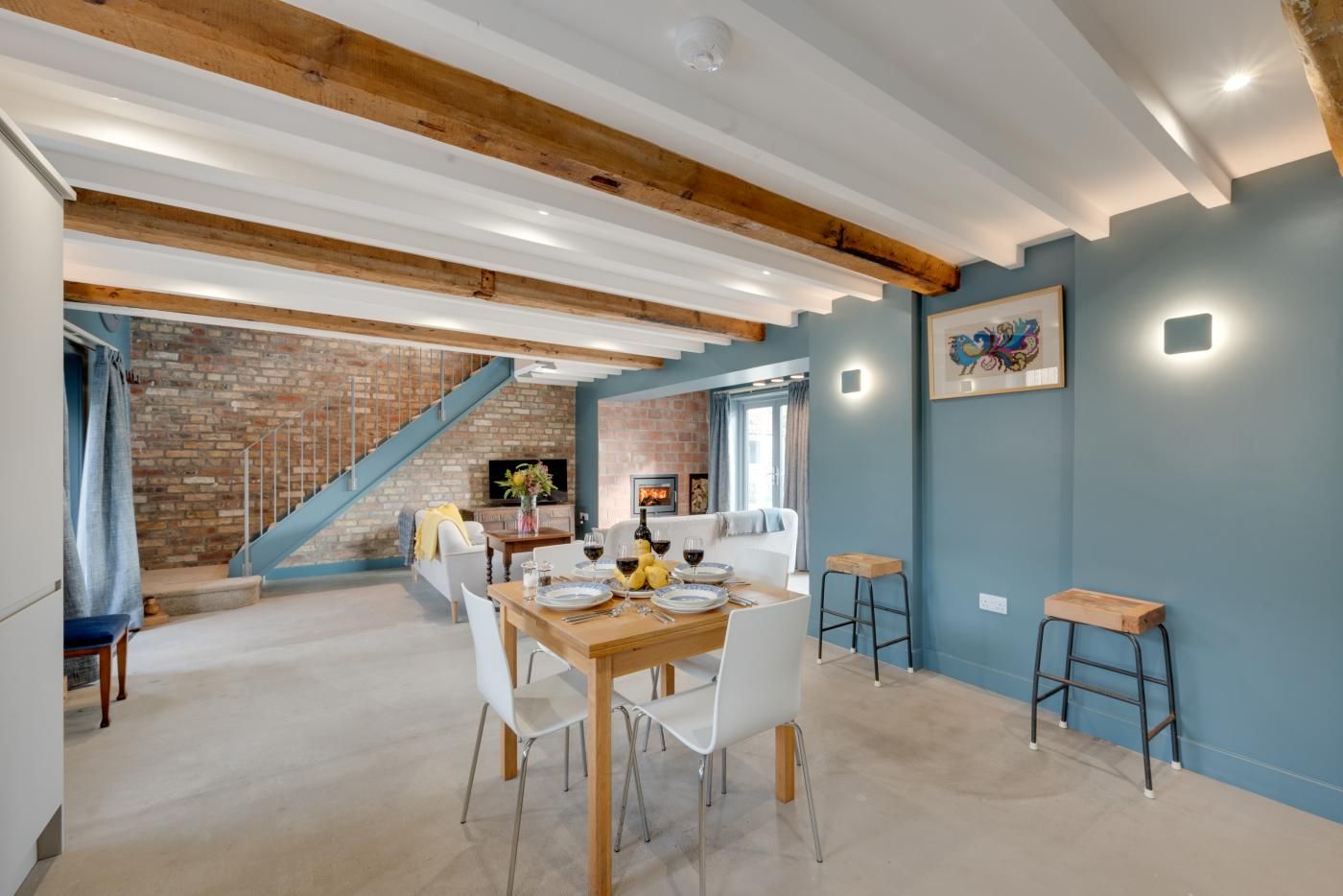 Step inside the open-plan kitchen/diner/lounge to find a wooden beamed ceiling, tranquil tones of blue, a characterful exposed stone wall plus plenty of natural light pouring through the glass patio doors.