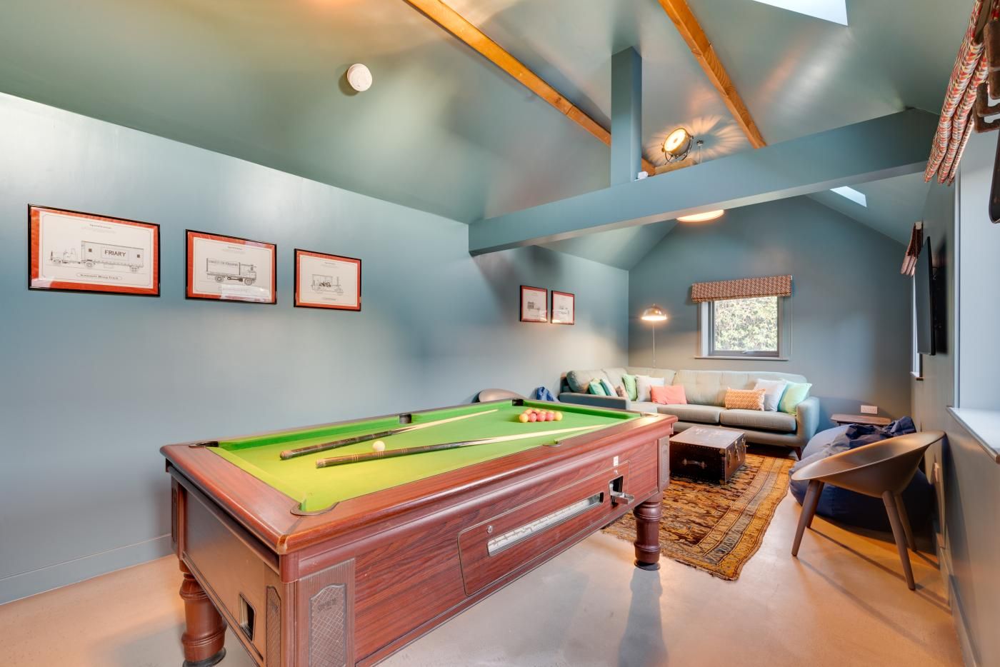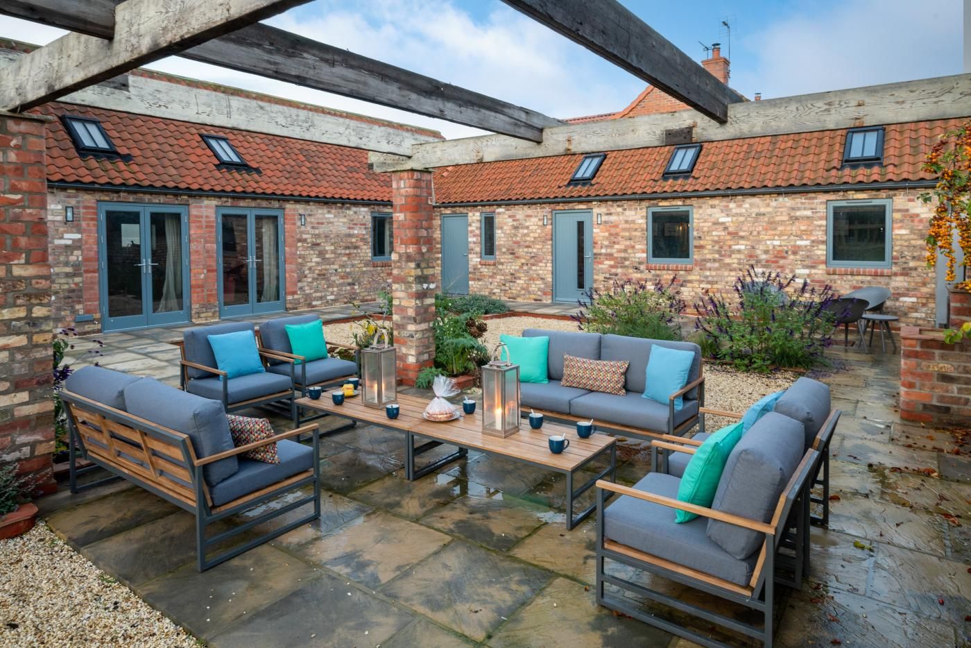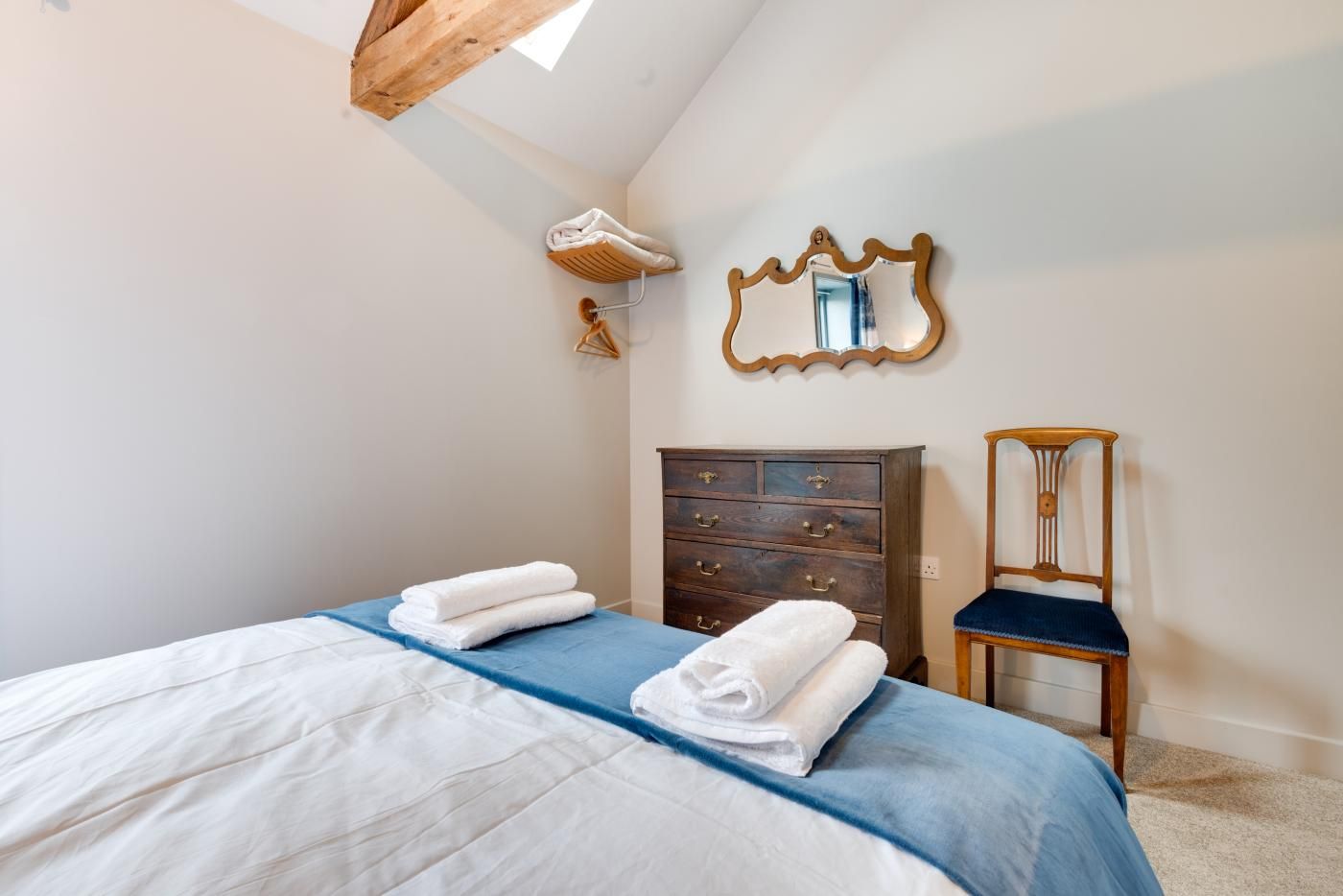 Step inside the open-plan kitchen/diner/lounge to find a wooden beamed ceiling, tranquil tones of blue, a characterful exposed stone wall plus plenty of natural light pouring through the glass patio doors.