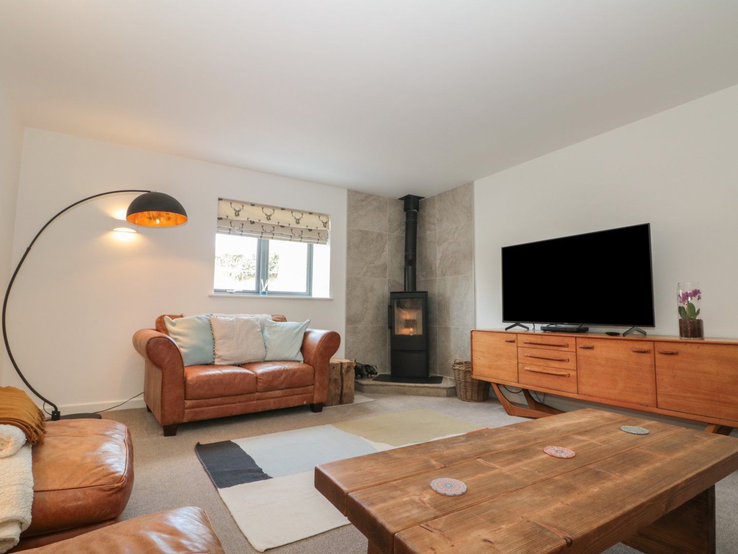 Over three floors. Four bedrooms: 1 x king-size with Smart TV, 2 x king-size with Smart TVs, en-suite walk-in shower, basin, and WC, 1 x lower-ground-floor twin. Bathroom with free-standing bath, walk-in shower, basin, and WC. Lower-ground-floor cloakroom with basin, WC, washing machine and tumble dryer. Lower-ground-floor, open-plan living space with kitchen, dining area and sitting area, with patio door to enclosed front patio and outdoor dining area. Sitting room with woodburning stove. Entrance Hall