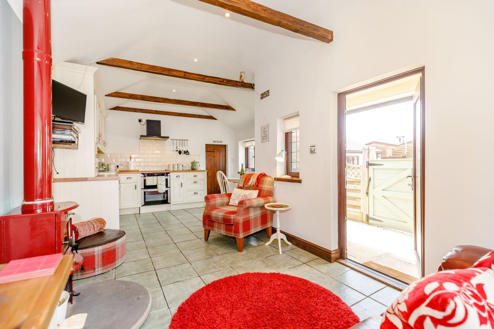 All ground floor. One king-size double bedroom with TV. Shower room with shower, basin and WC. Open plan living area with kitchen, dining area and sitting area with woodburner.