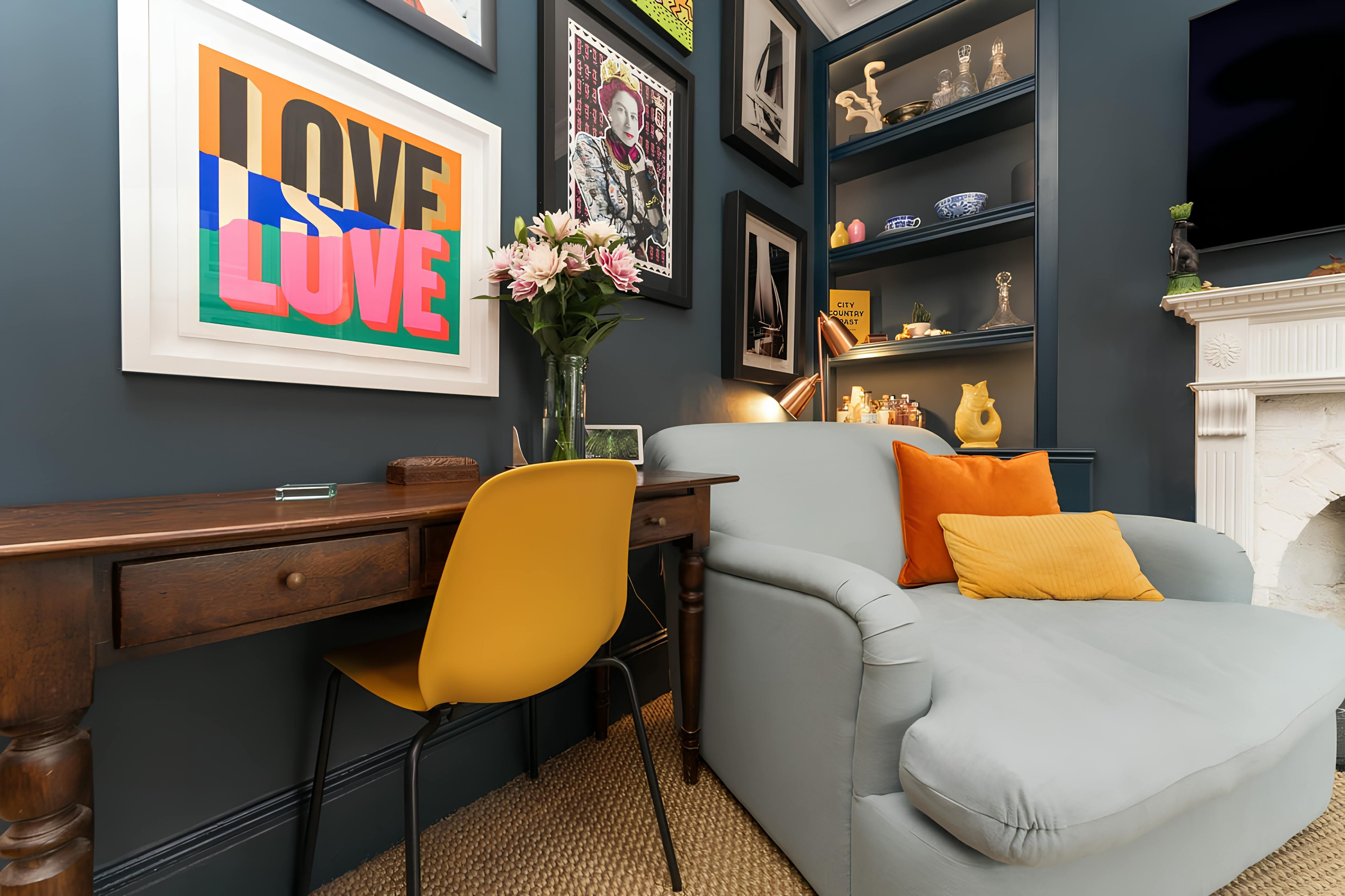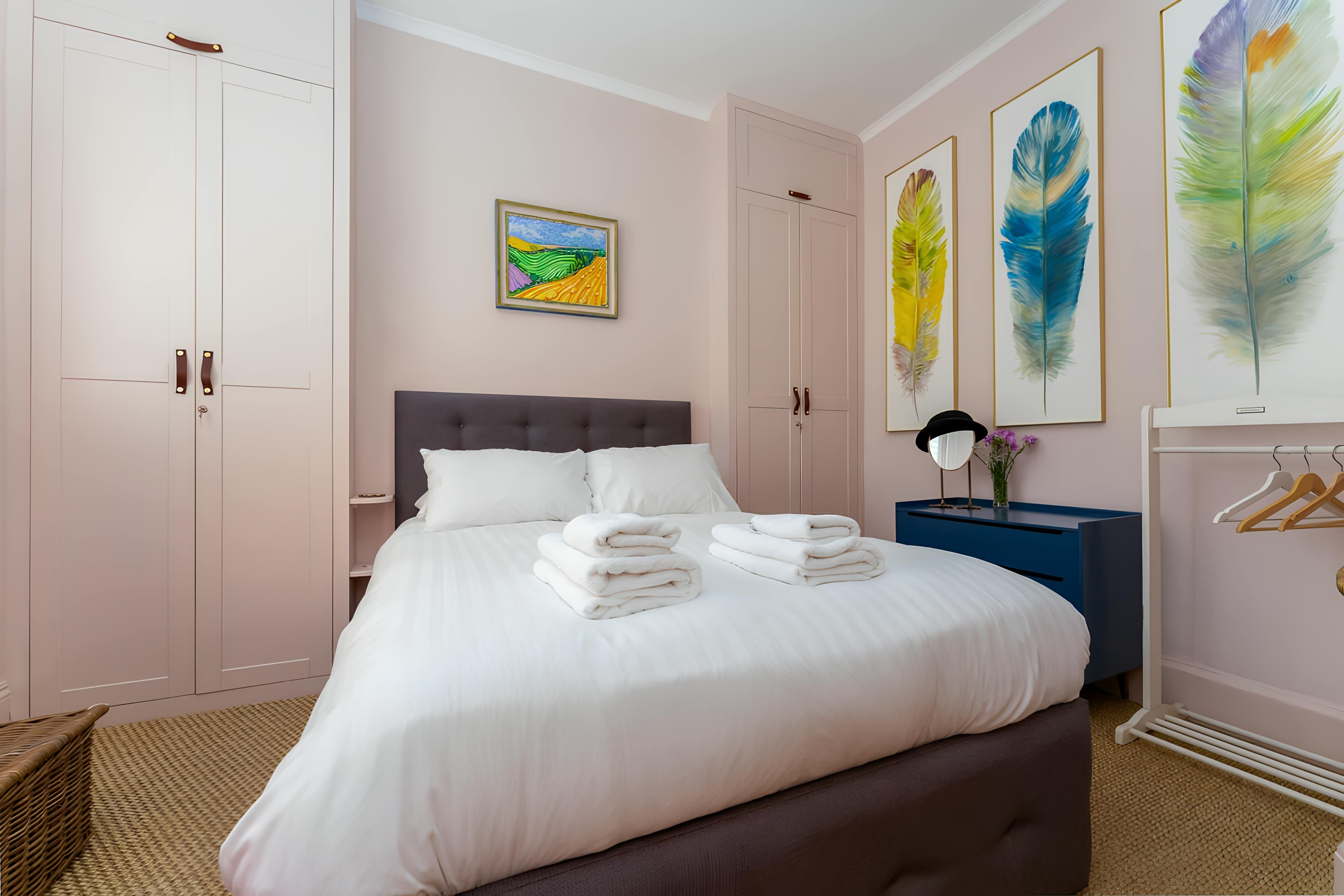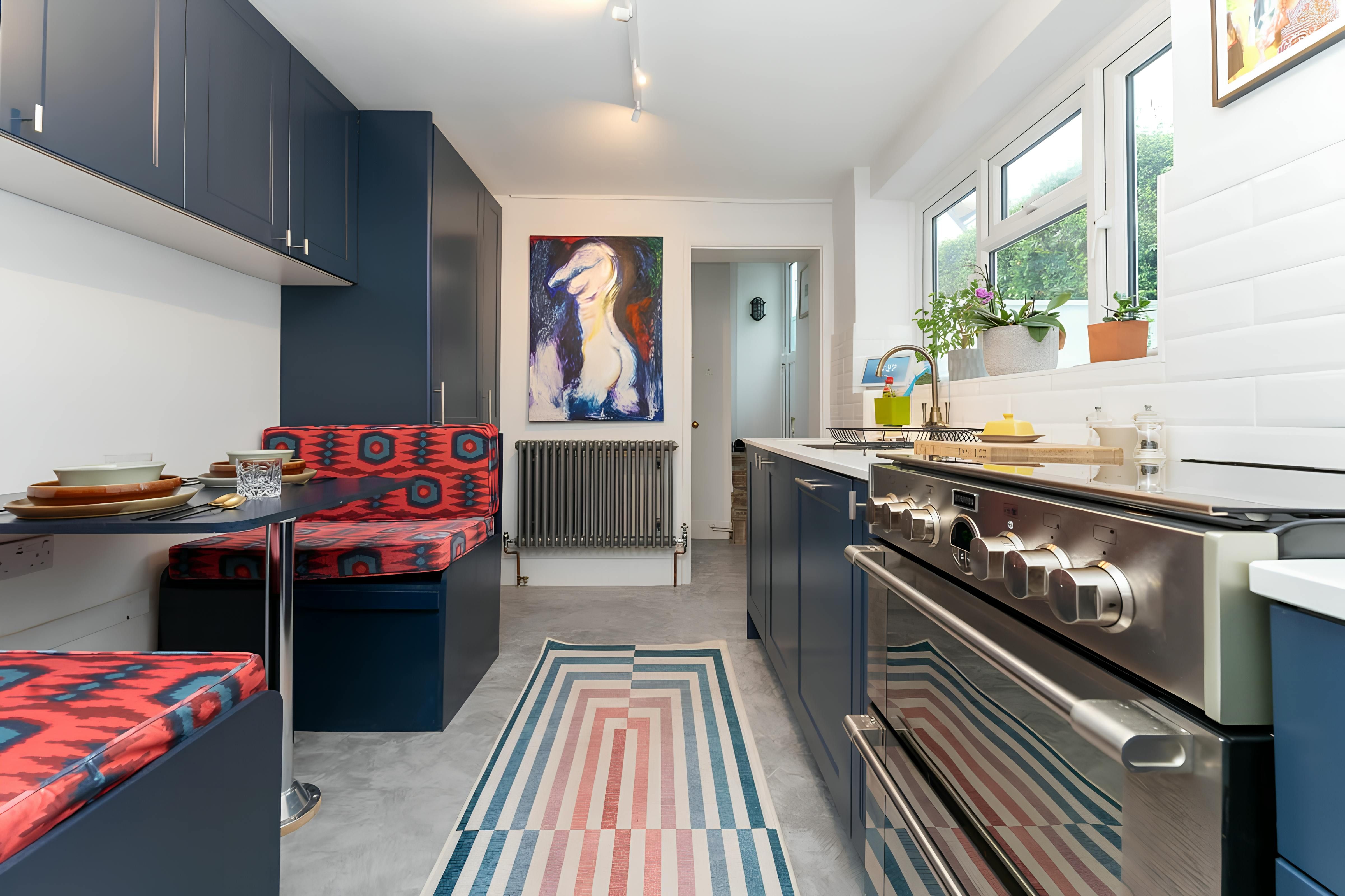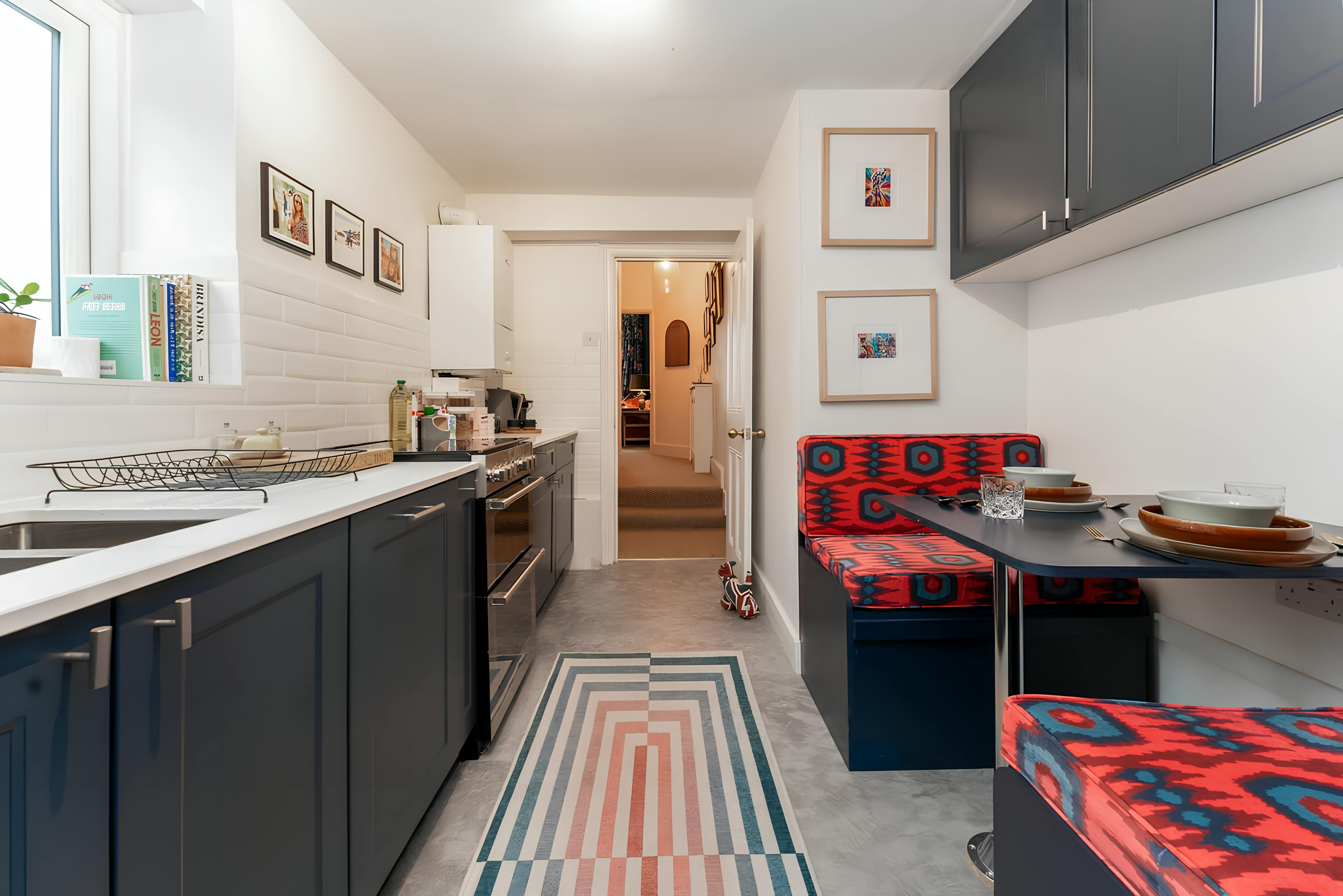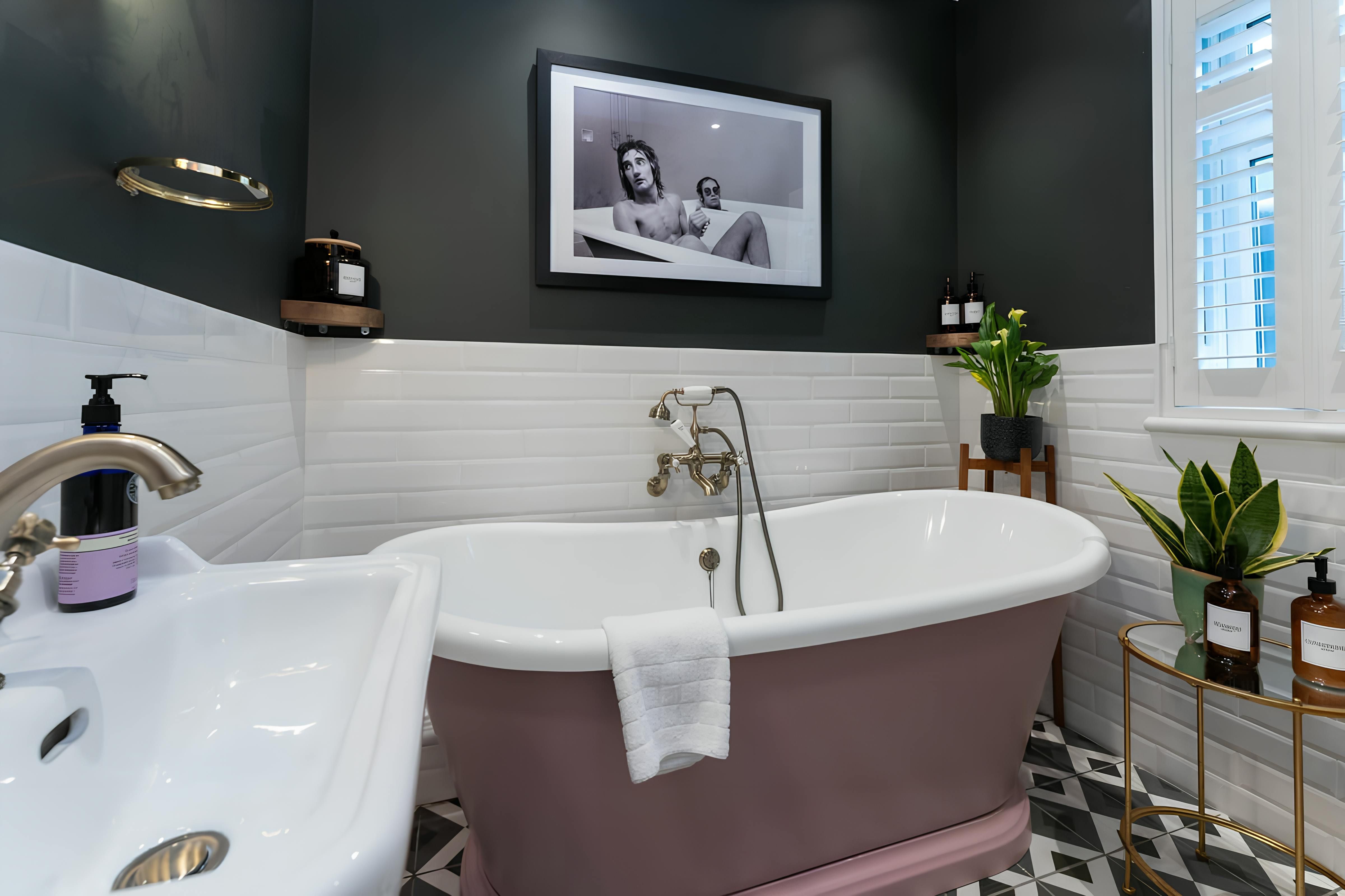 Tucked away in Brighton's Seven Dials area, this one-bedroom retreat offers a playful blend of period charm and modern style. The living space is full of personality — think velvet sofa, bold colours, pop culture moments and desk space for creative moments or remote work. Start your mornings with coffee in the garden nook, then wander through the Lanes or down to the seafront in under 20 minutes. The bathroom, with its blush-pink rolltop bath, is made for long soaks, while the kitchen’s dining booth is ideal for unwinding over wine and conversation. Romantic hideaway? Solo creative break? Either way, this flat delivers character, comfort, and a side of Brighton cool.
