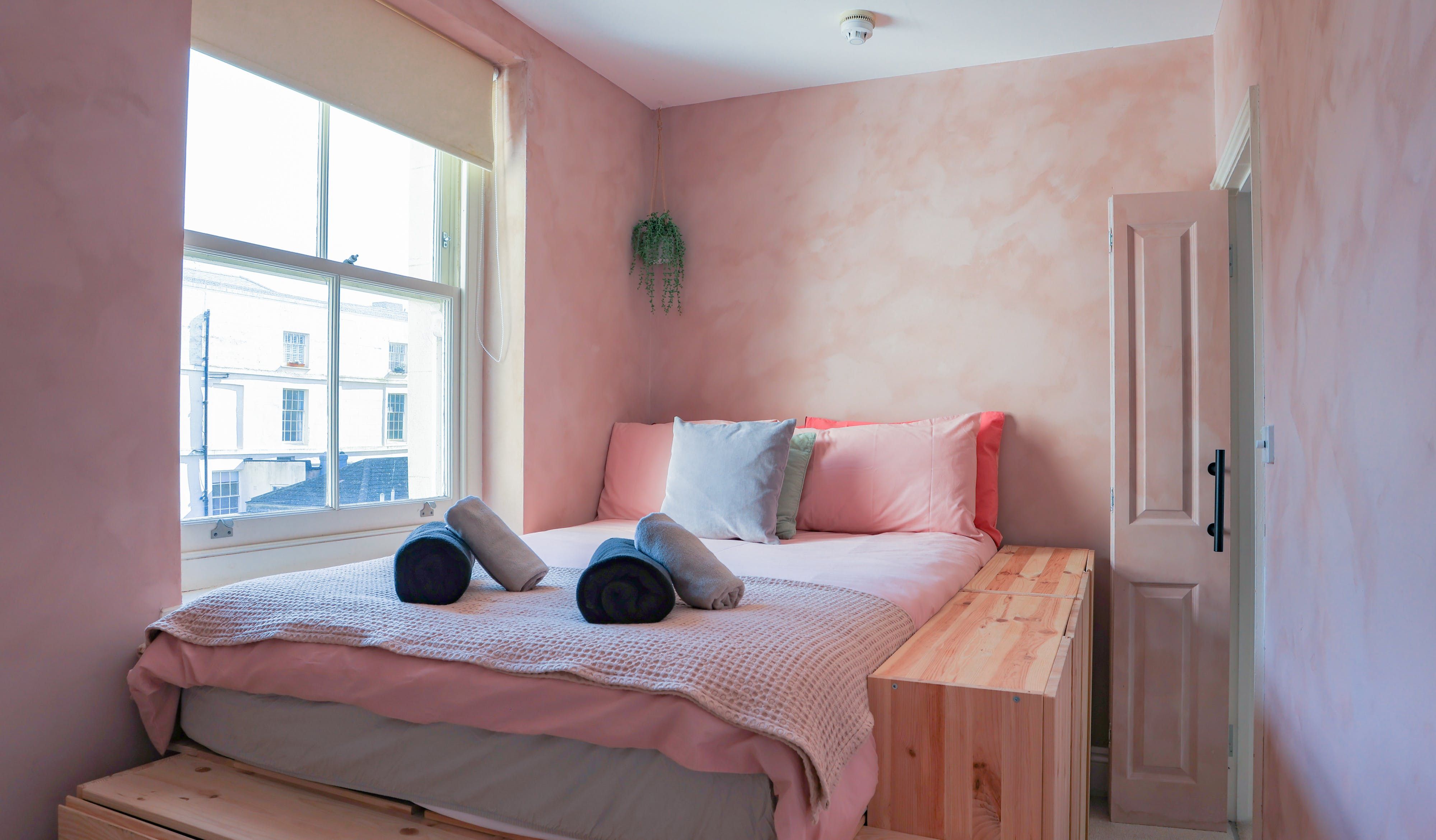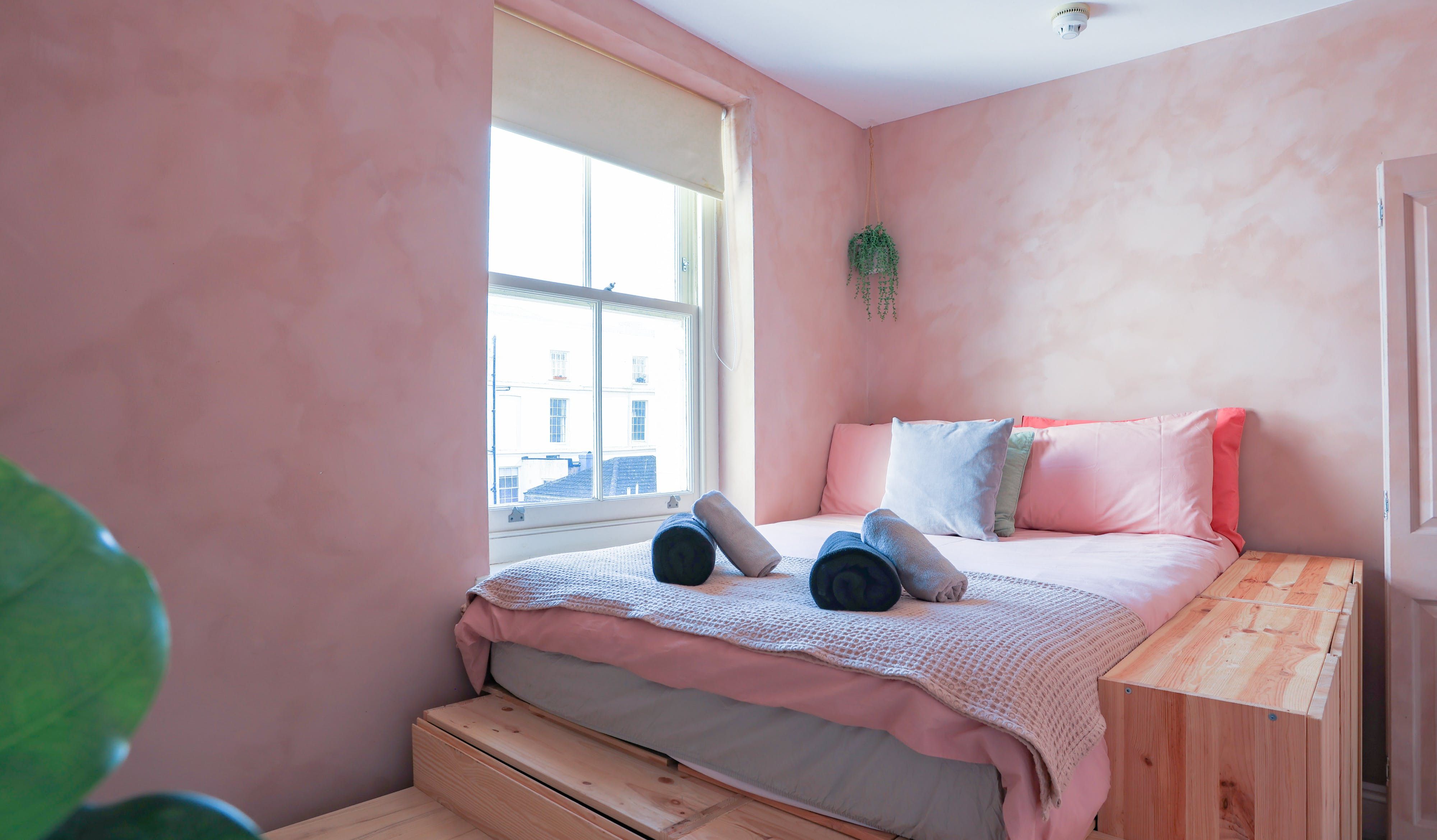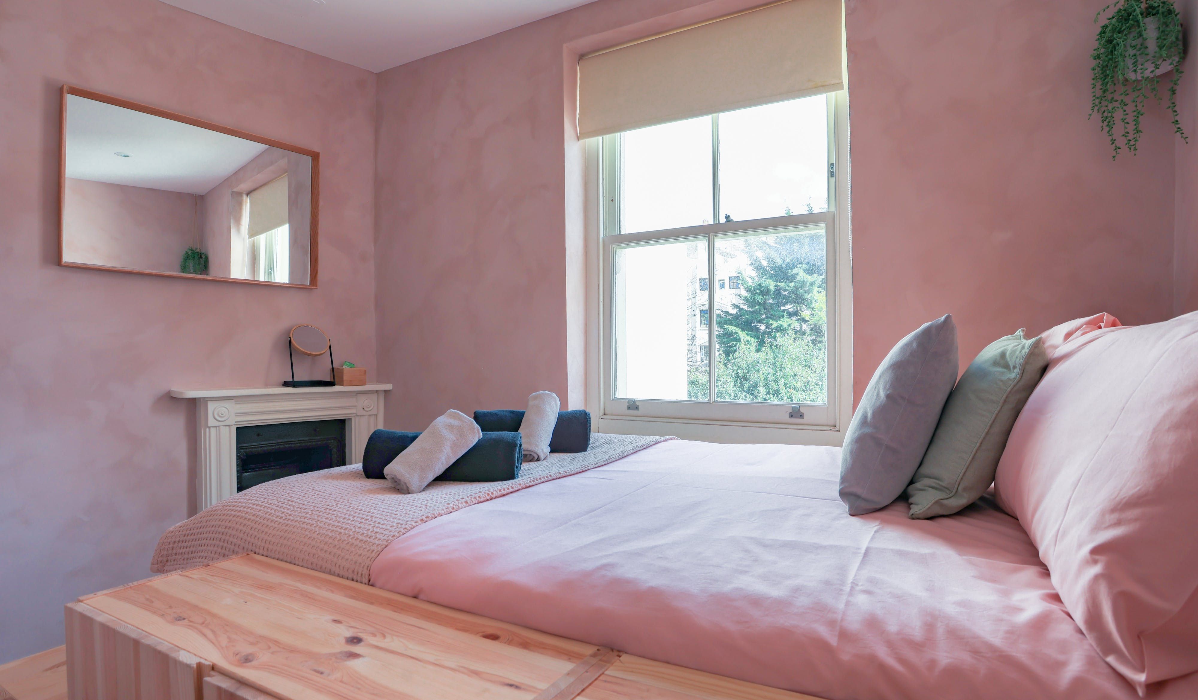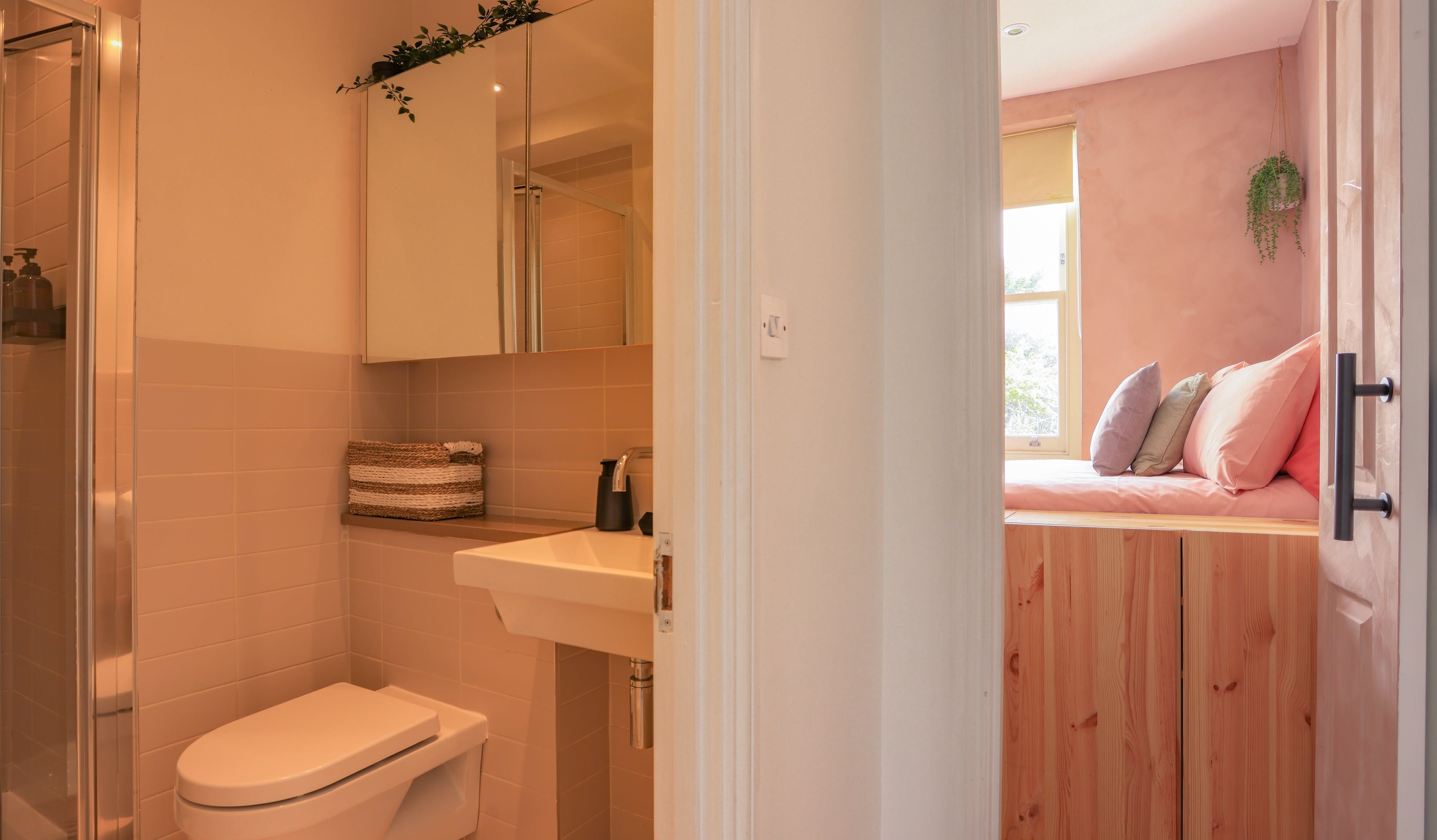 A pink limewashed bedroom makes for a soothing sanctuary to unwind at the end of a day of exploring the neighbourhood, shopping The Lanes and feasting on fish and chips down at the beach. Meanwhile, the adjacent bathroom is perfectly equipped for morning and evening pampering sessions.