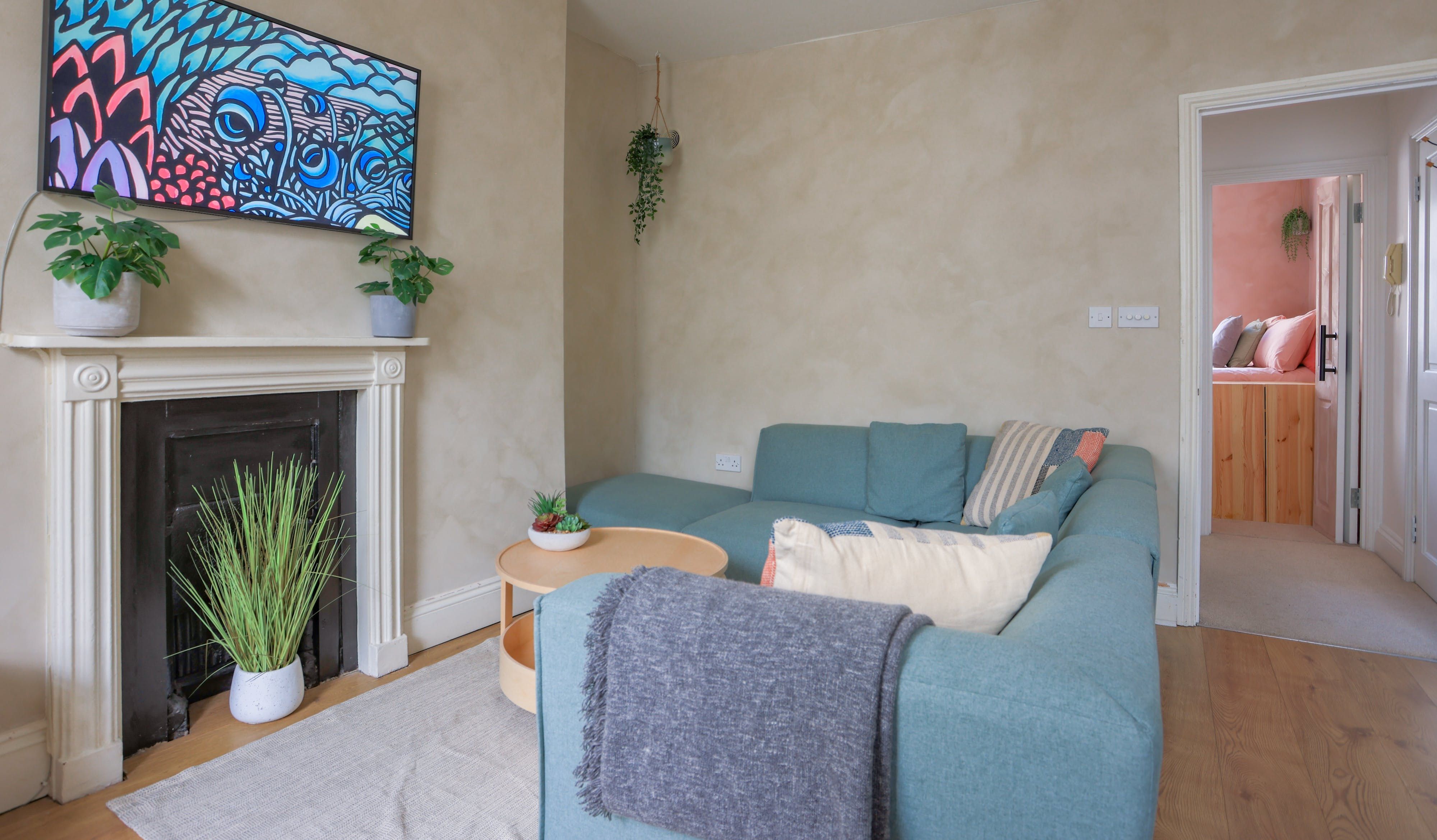 Step inside the apartment to find a spacious open-plan living area with a sleek kitchen to prepare mouthwatering meals and a dining table to enjoy them around. An array of houseplants add to the homely feel, while a state-of-the-art TV switches from Netflix to displaying art above the ornamental fireplace at the flick of a button.