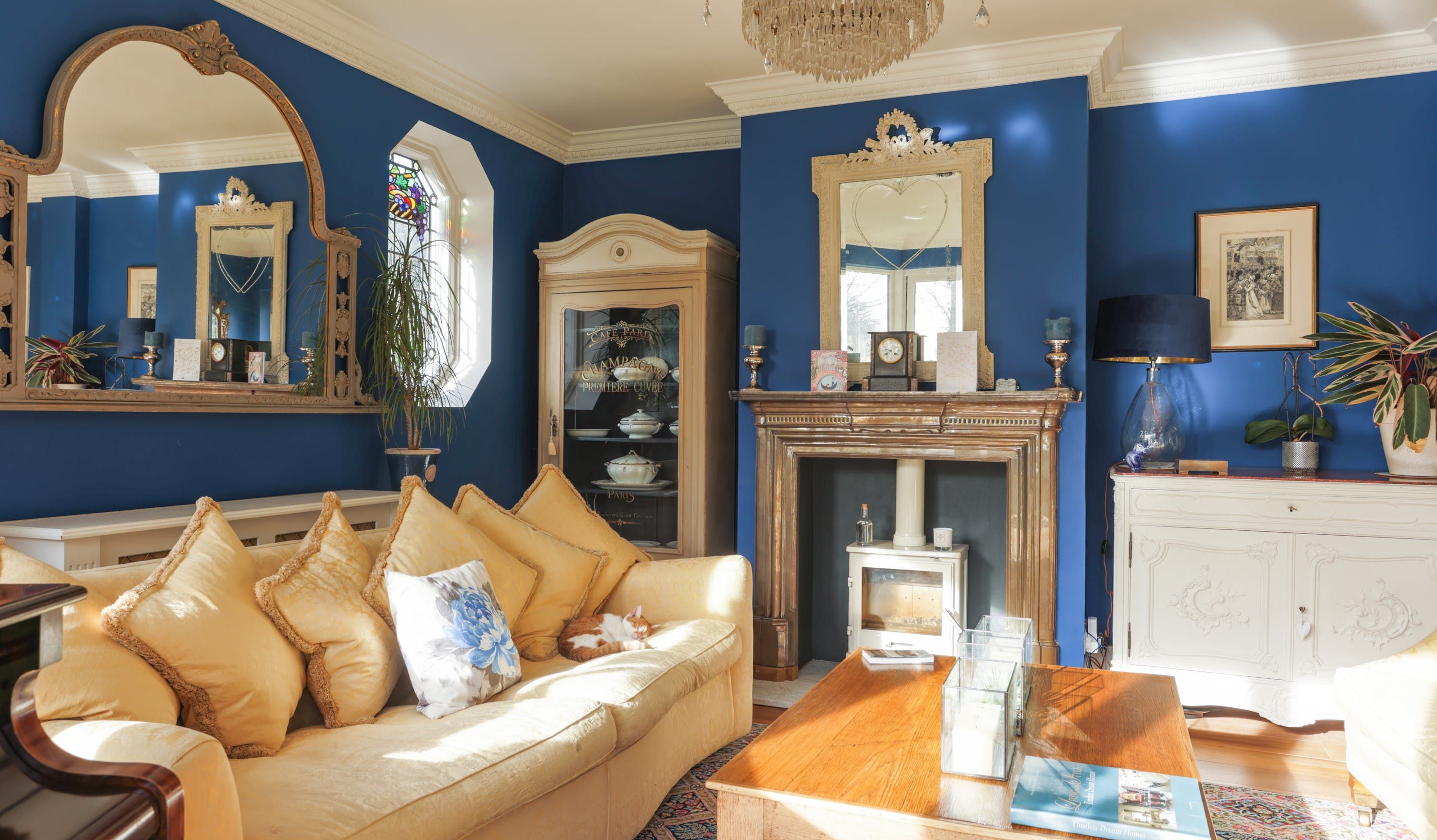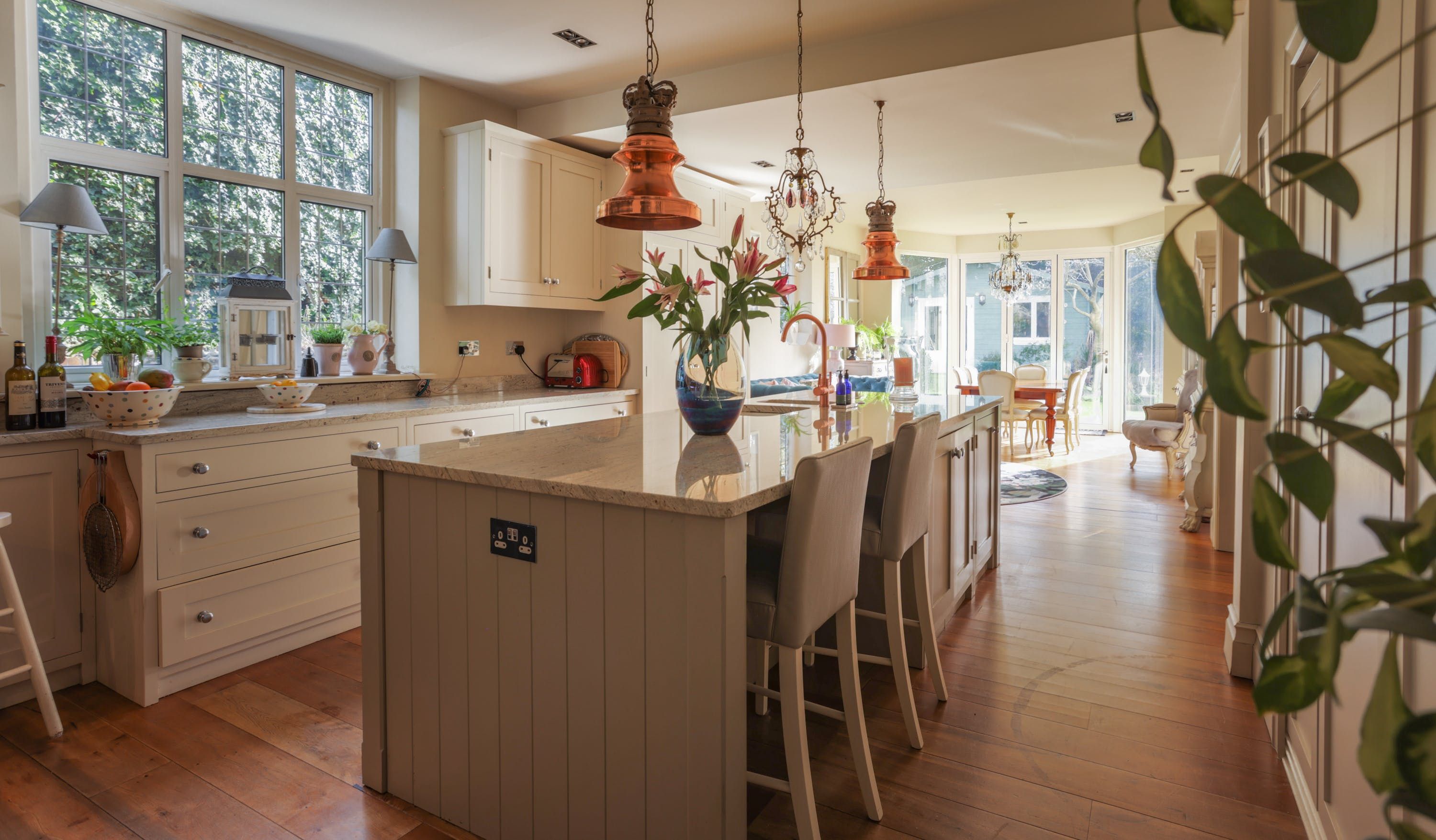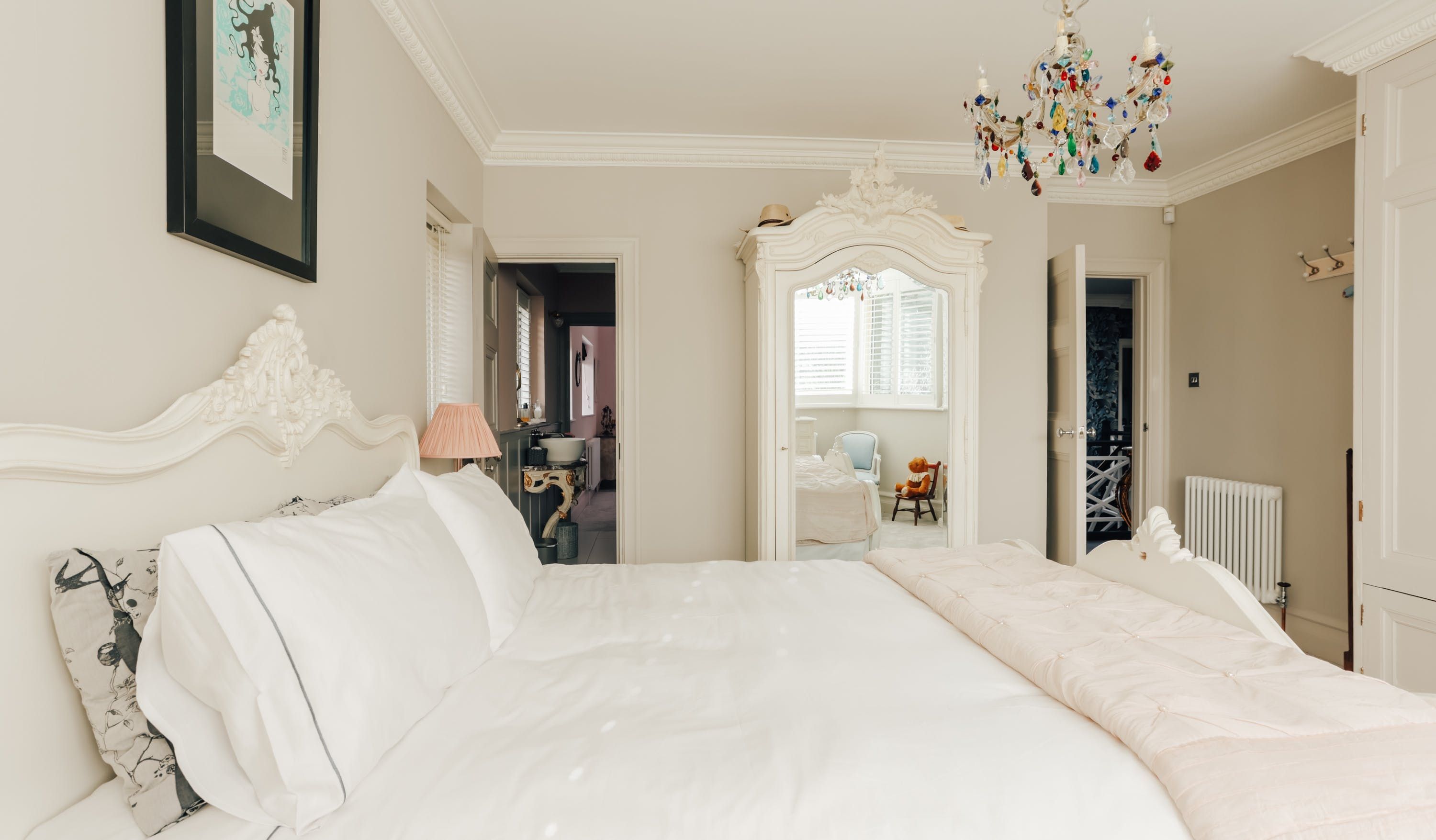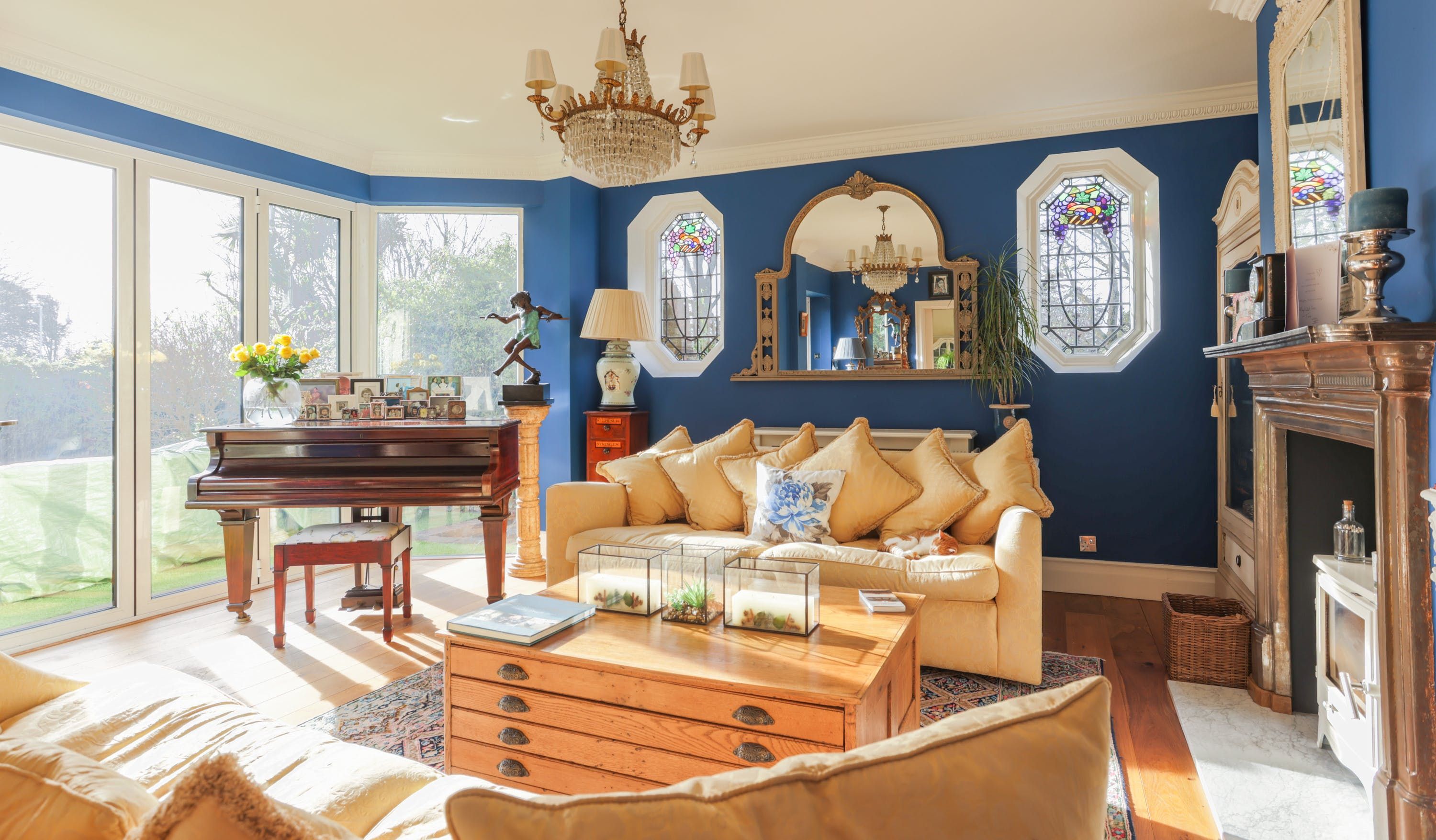 Stepping into the living room is like crossing the threshold into a 19th-century drawing room with its grand piano, sparkling chandelier and carriage clock above the mantle. A wood-burning stove can crackle away in the evening for a bit of atmosphere and floor-to-ceiling bay windows let the sunshine stream in. Double doors lead to the kitchen, where there’s dining for the whole group and an additional seating area around a big TV. Upstairs, bedrooms are super plush and spacious.