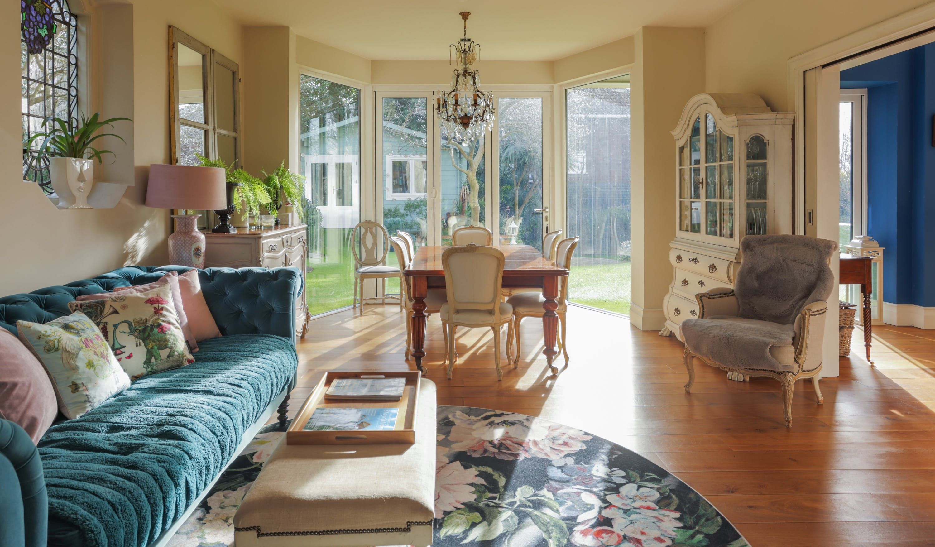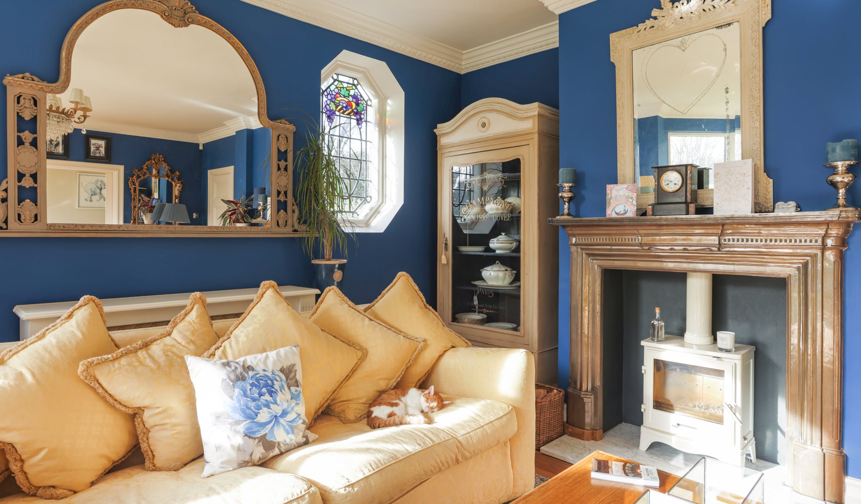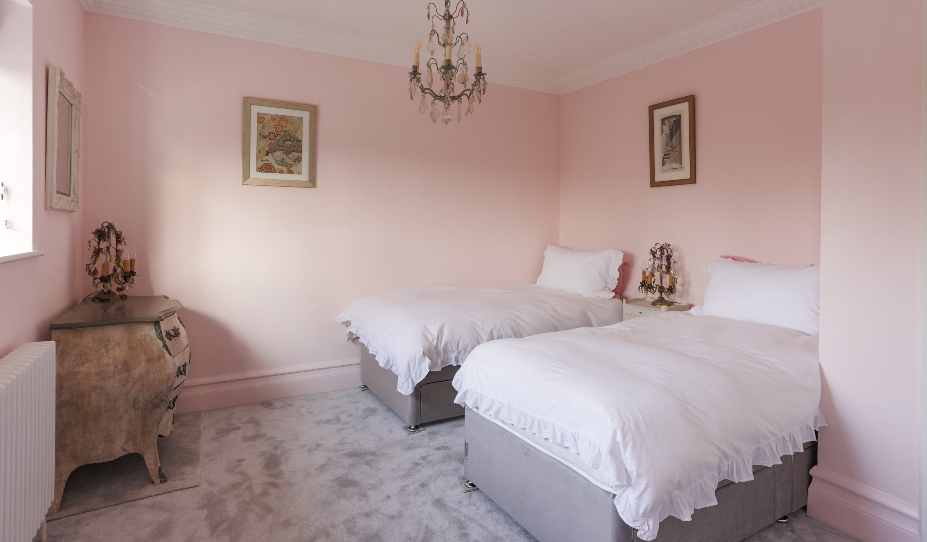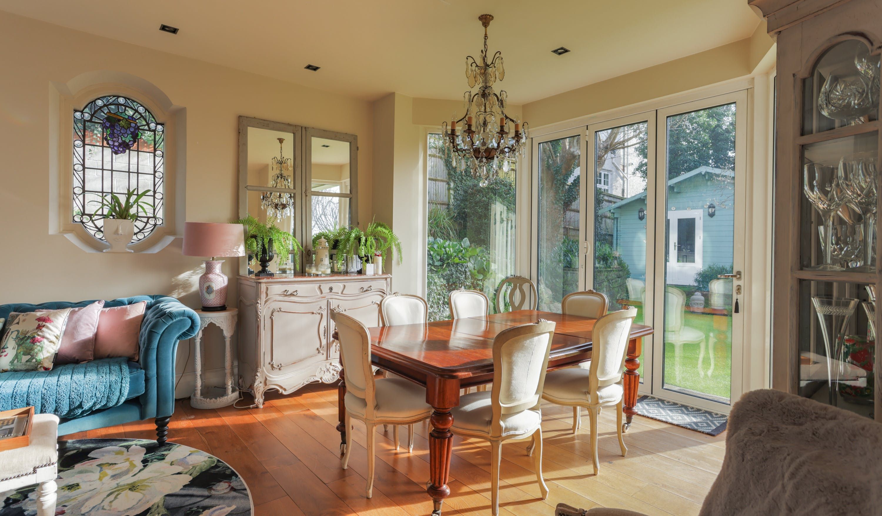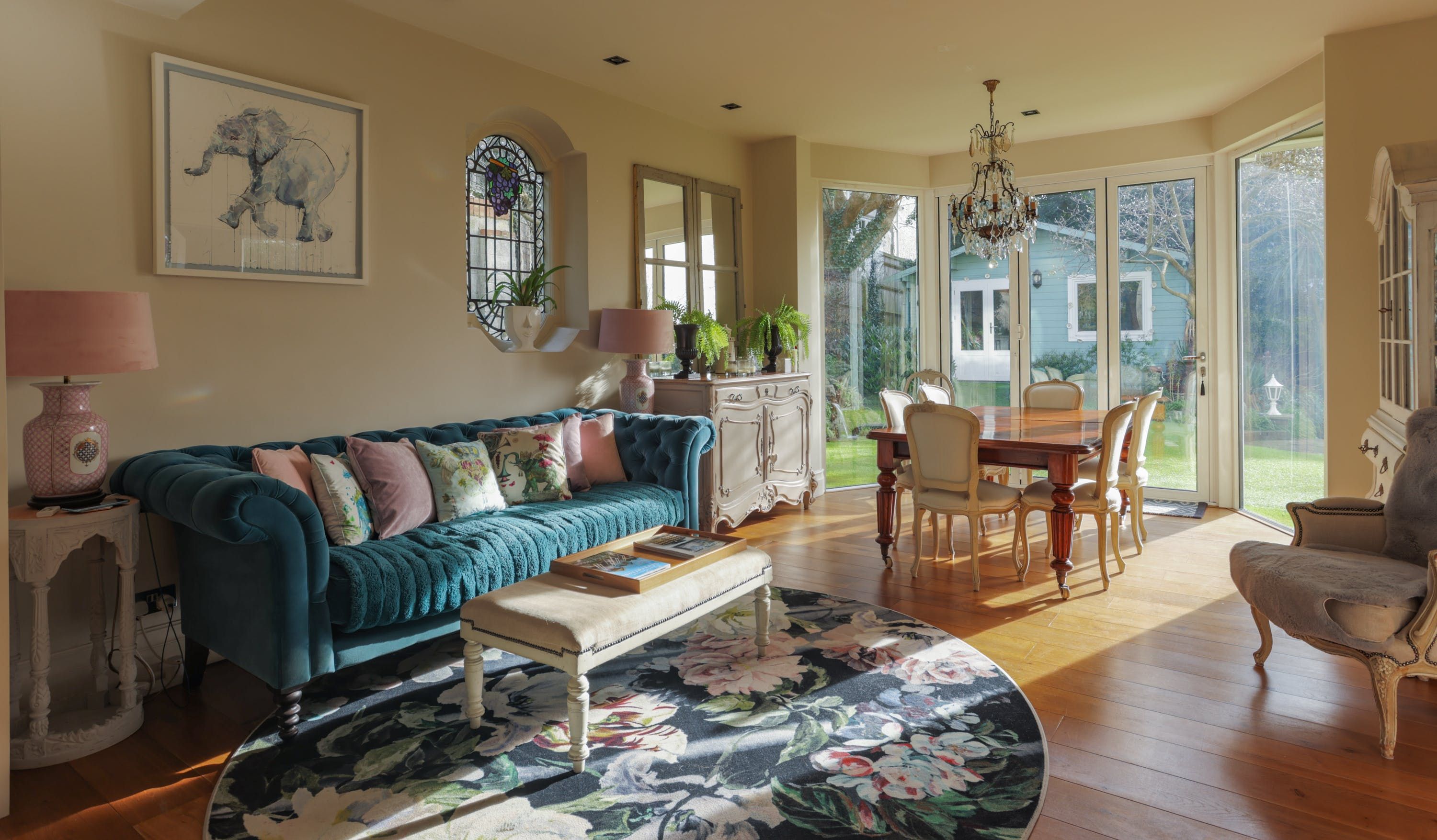 Stepping into the living room is like crossing the threshold into a 19th-century drawing room with its grand piano, sparkling chandelier and carriage clock above the mantle. A wood-burning stove can crackle away in the evening for a bit of atmosphere and floor-to-ceiling bay windows let the sunshine stream in. Double doors lead to the kitchen, where there’s dining for the whole group and an additional seating area around a big TV. Upstairs, bedrooms are super plush and spacious.