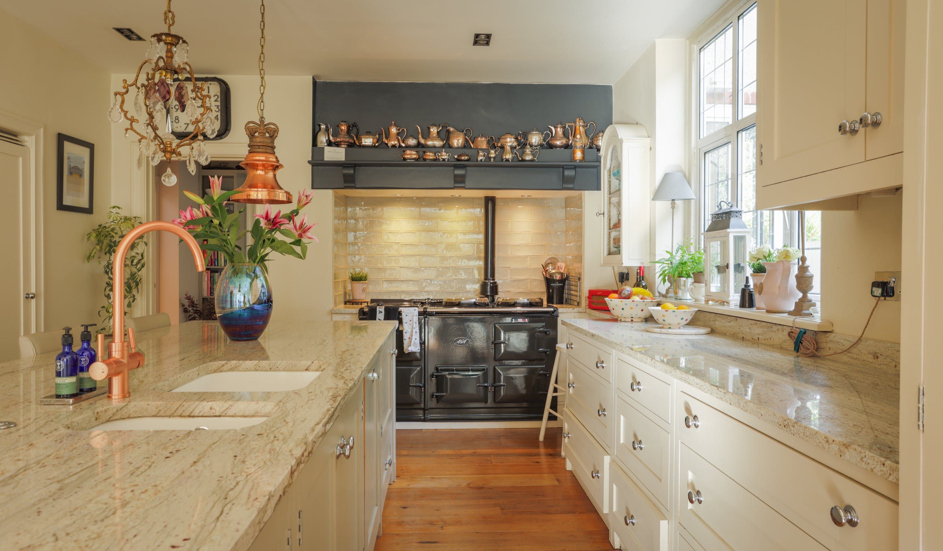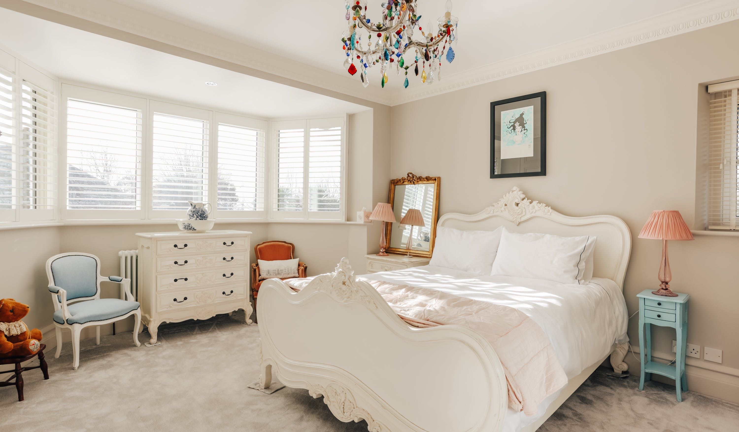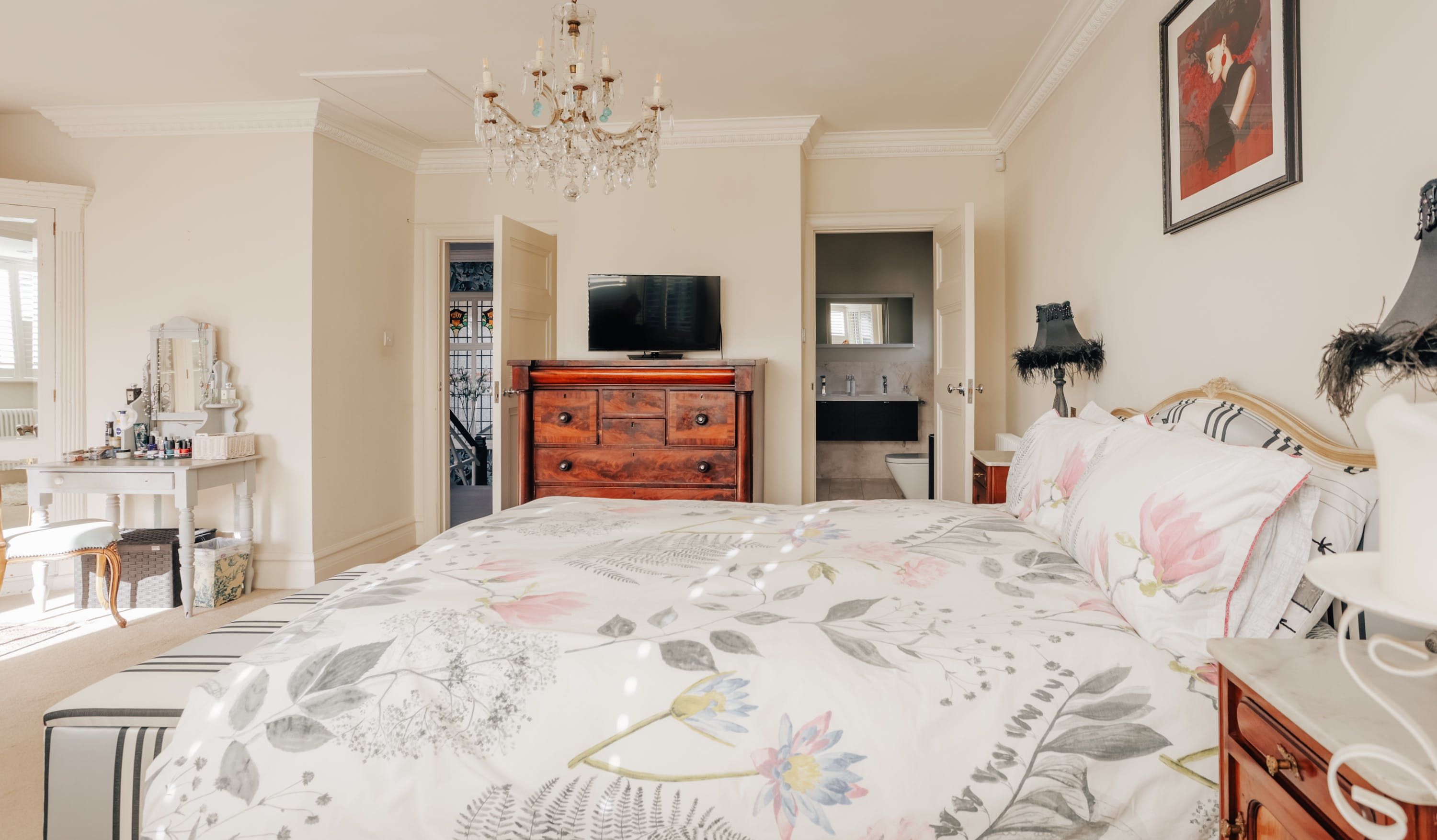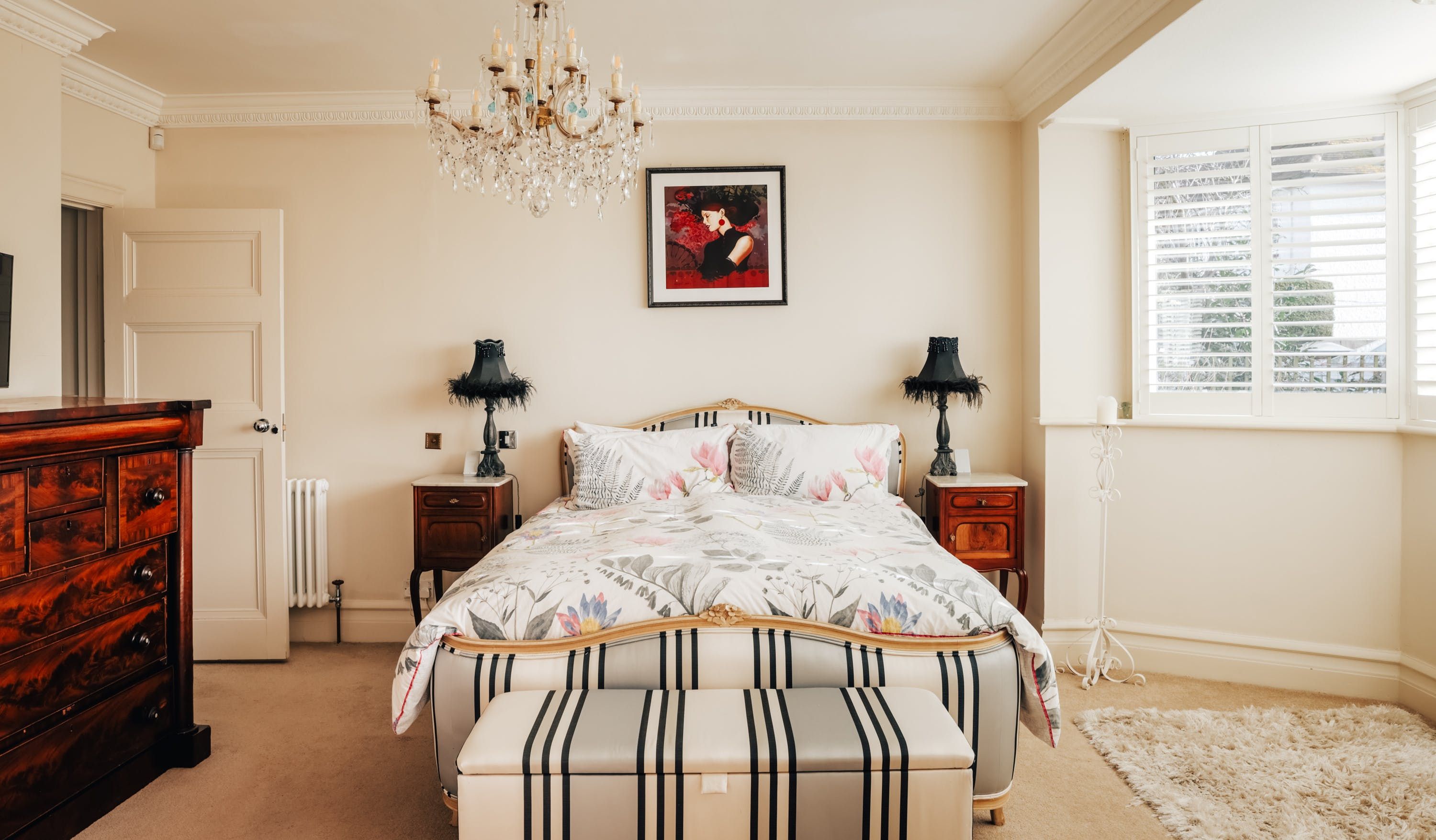Stepping into the living room is like crossing the threshold into a 19th-century drawing room with its grand piano, sparkling chandelier and carriage clock above the mantle. A wood-burning stove can crackle away in the evening for a bit of atmosphere and floor-to-ceiling bay windows let the sunshine stream in. Double doors lead to the kitchen, where there’s dining for the whole group and an additional seating area around a big TV. Upstairs, bedrooms are super plush and spacious.