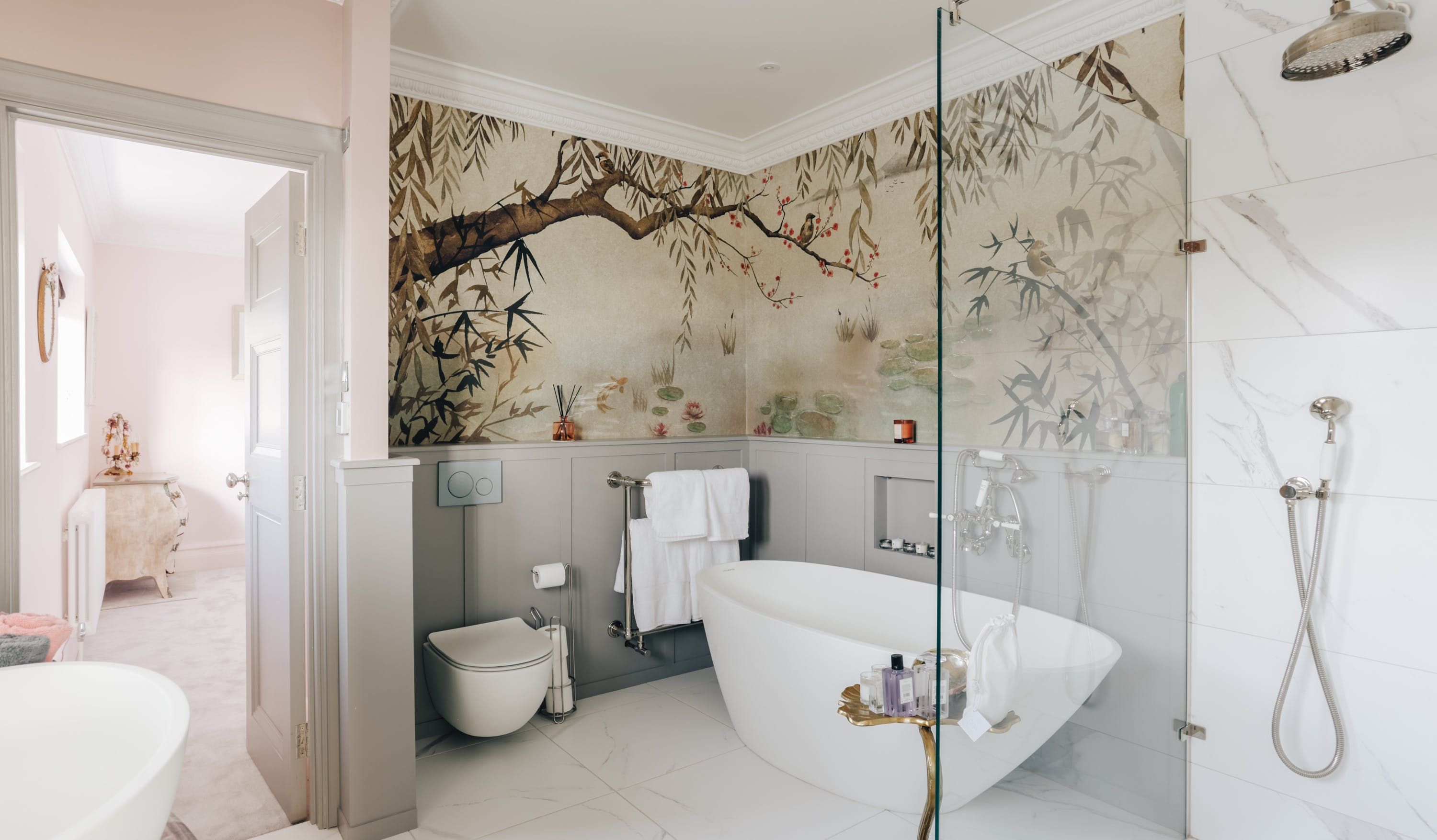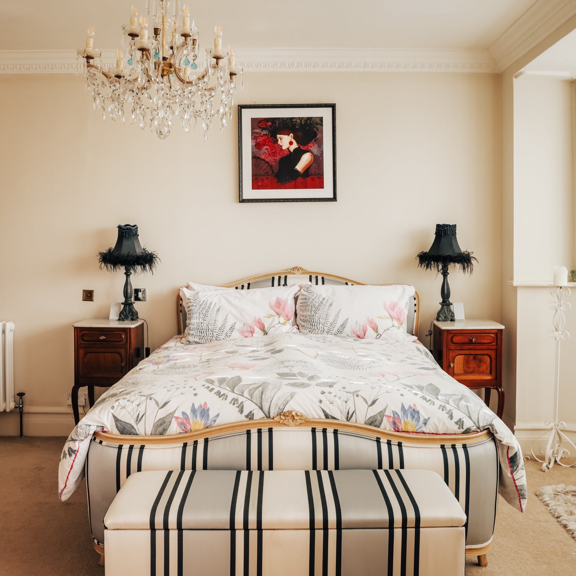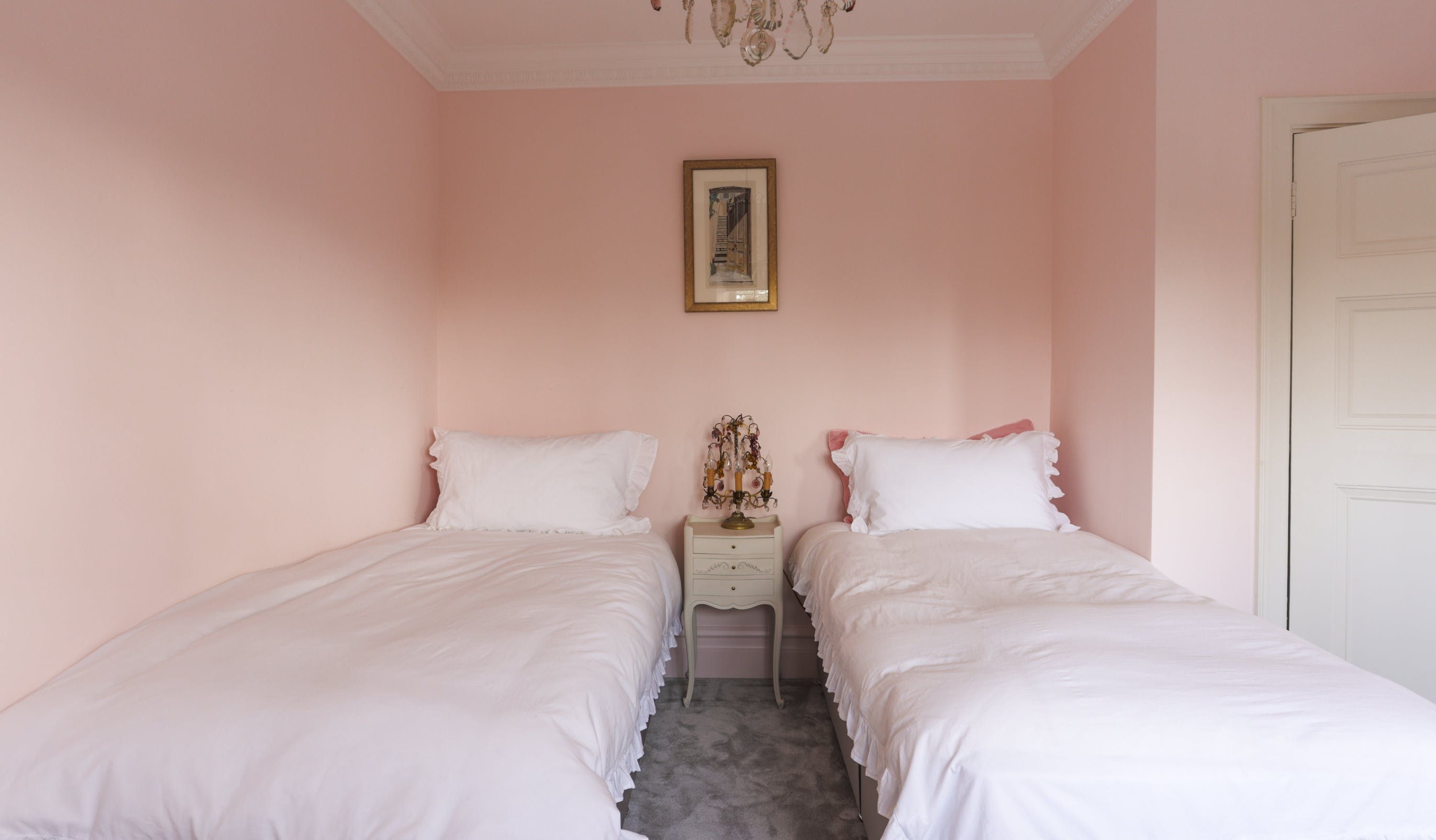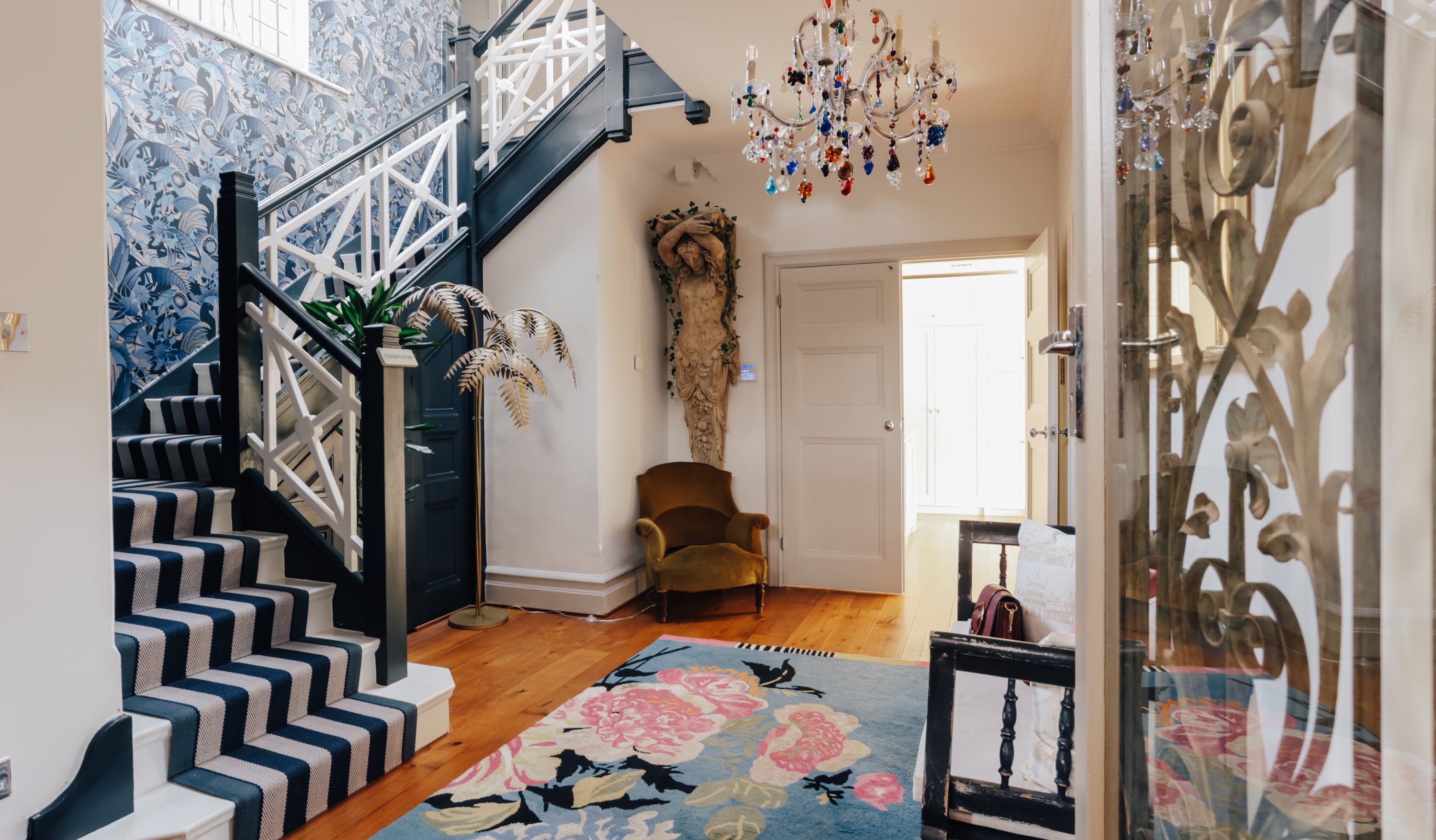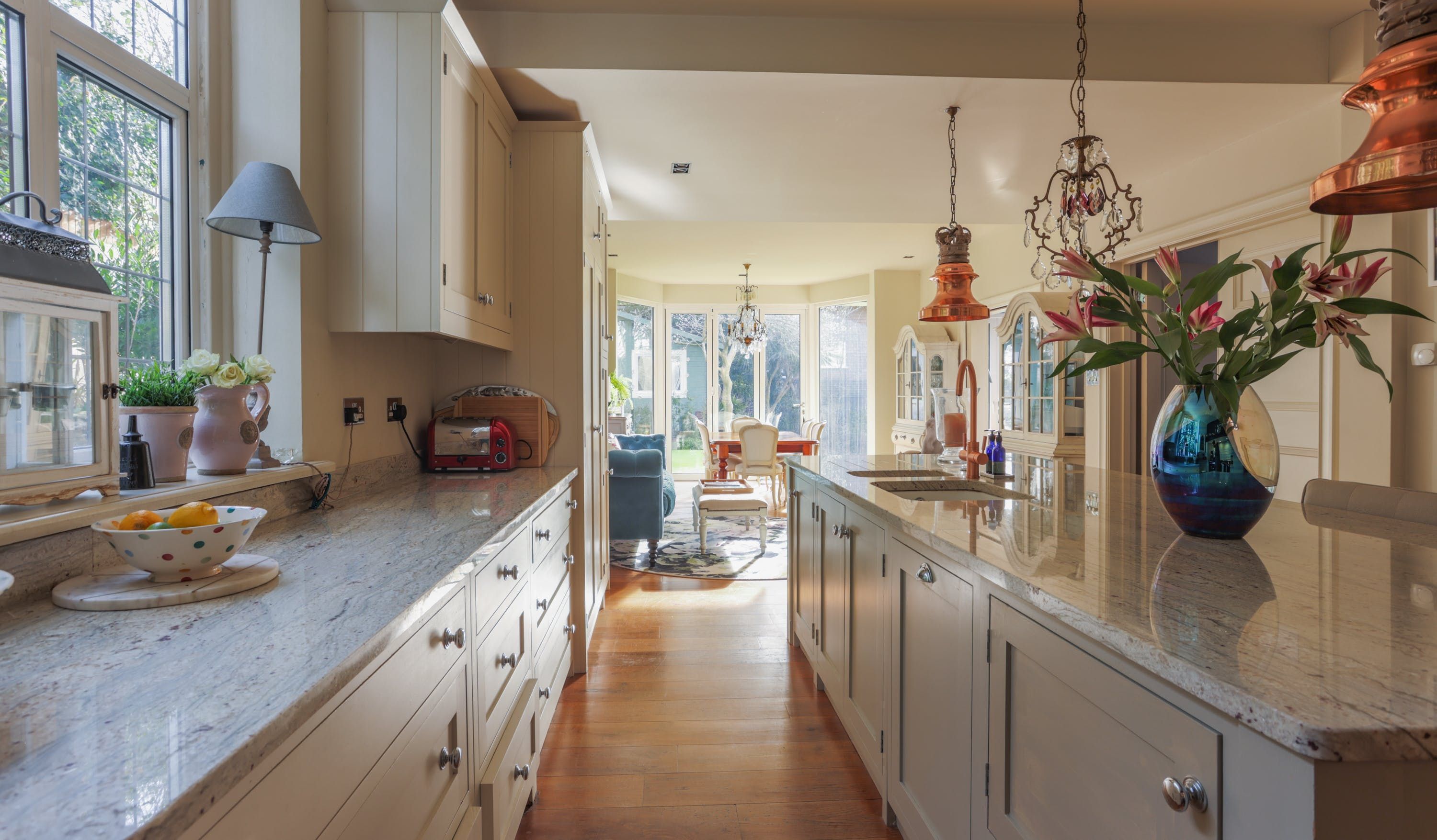 Stepping into the living room is like crossing the threshold into a 19th-century drawing room with its grand piano, sparkling chandelier and carriage clock above the mantle. A wood-burning stove can crackle away in the evening for a bit of atmosphere and floor-to-ceiling bay windows let the sunshine stream in. Double doors lead to the kitchen, where there’s dining for the whole group and an additional seating area around a big TV. Upstairs, bedrooms are super plush and spacious.