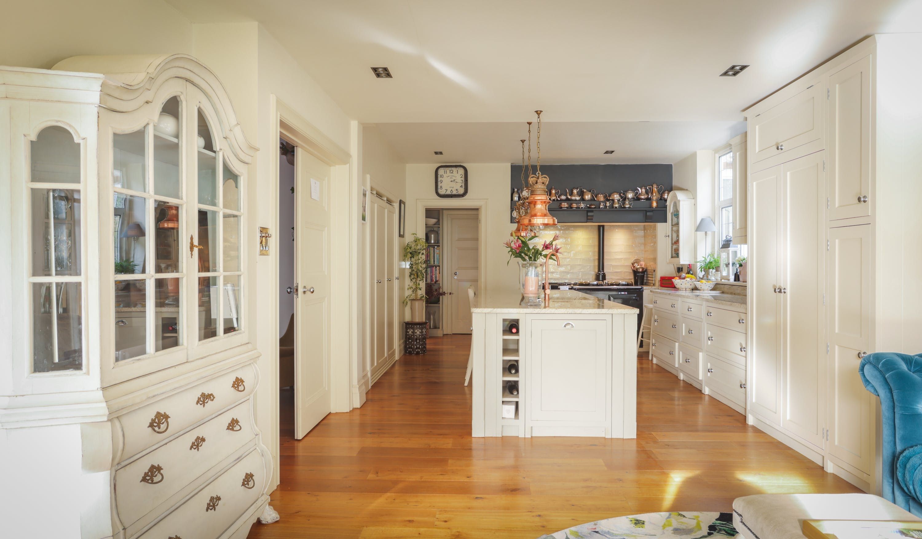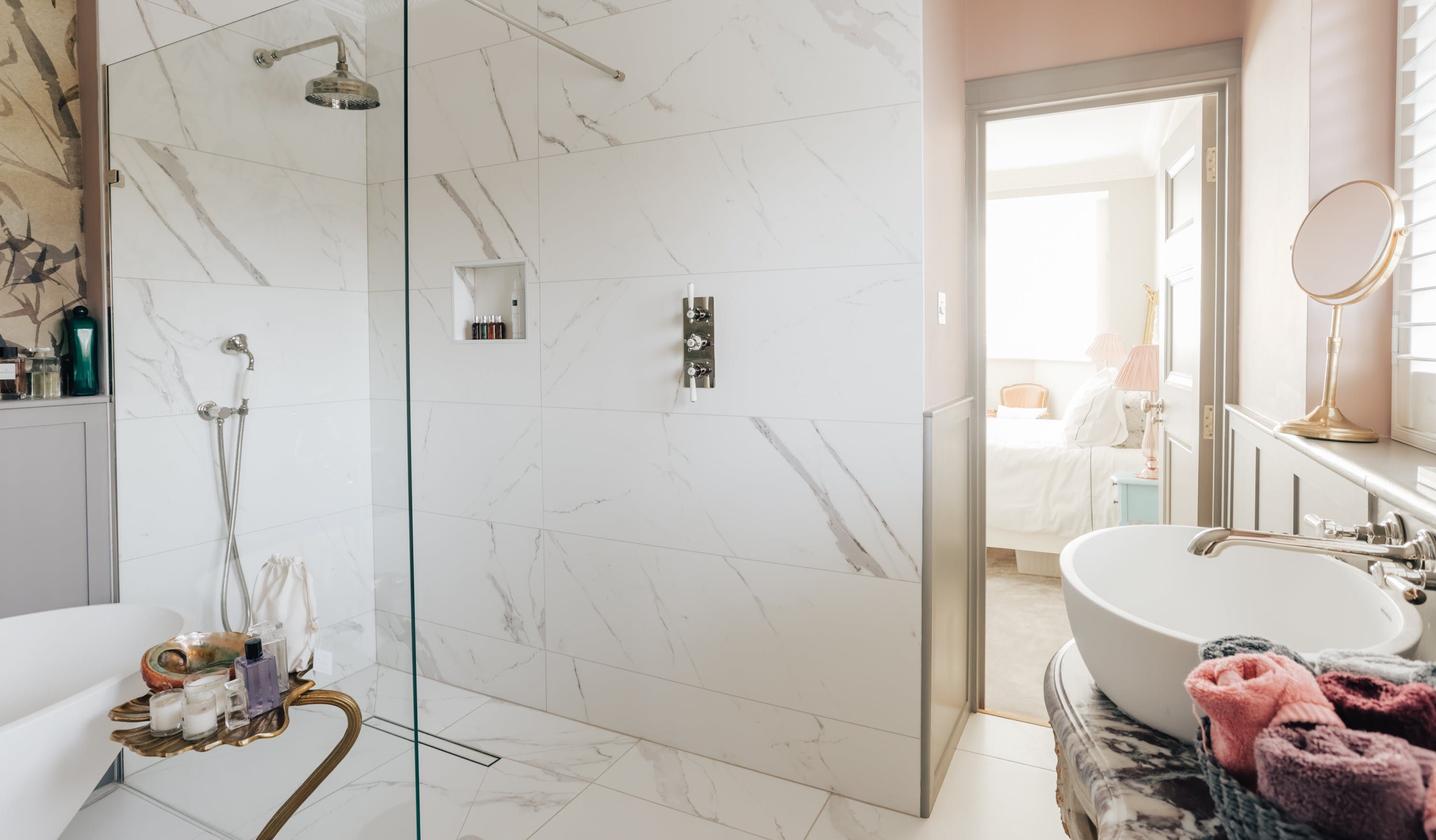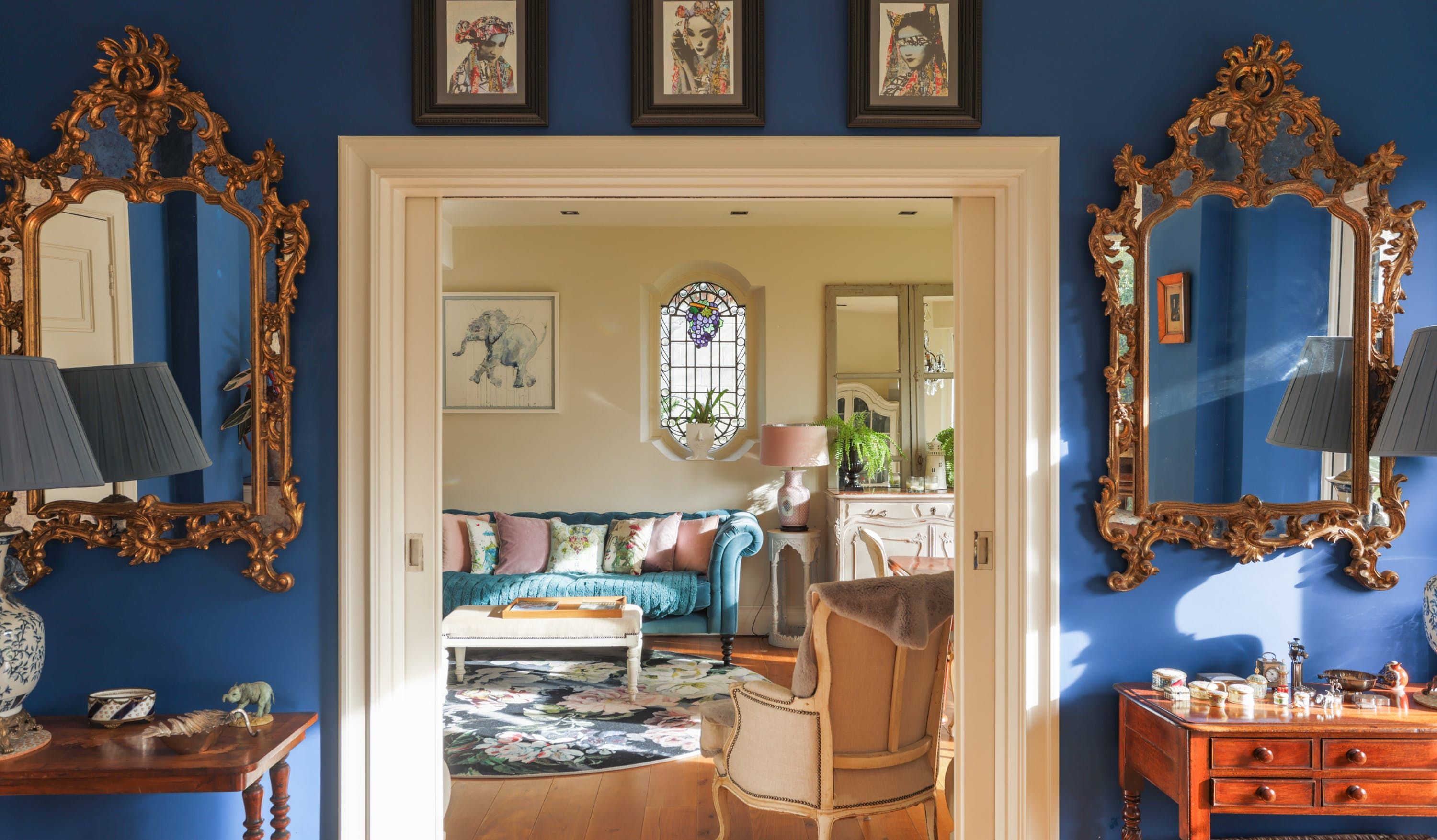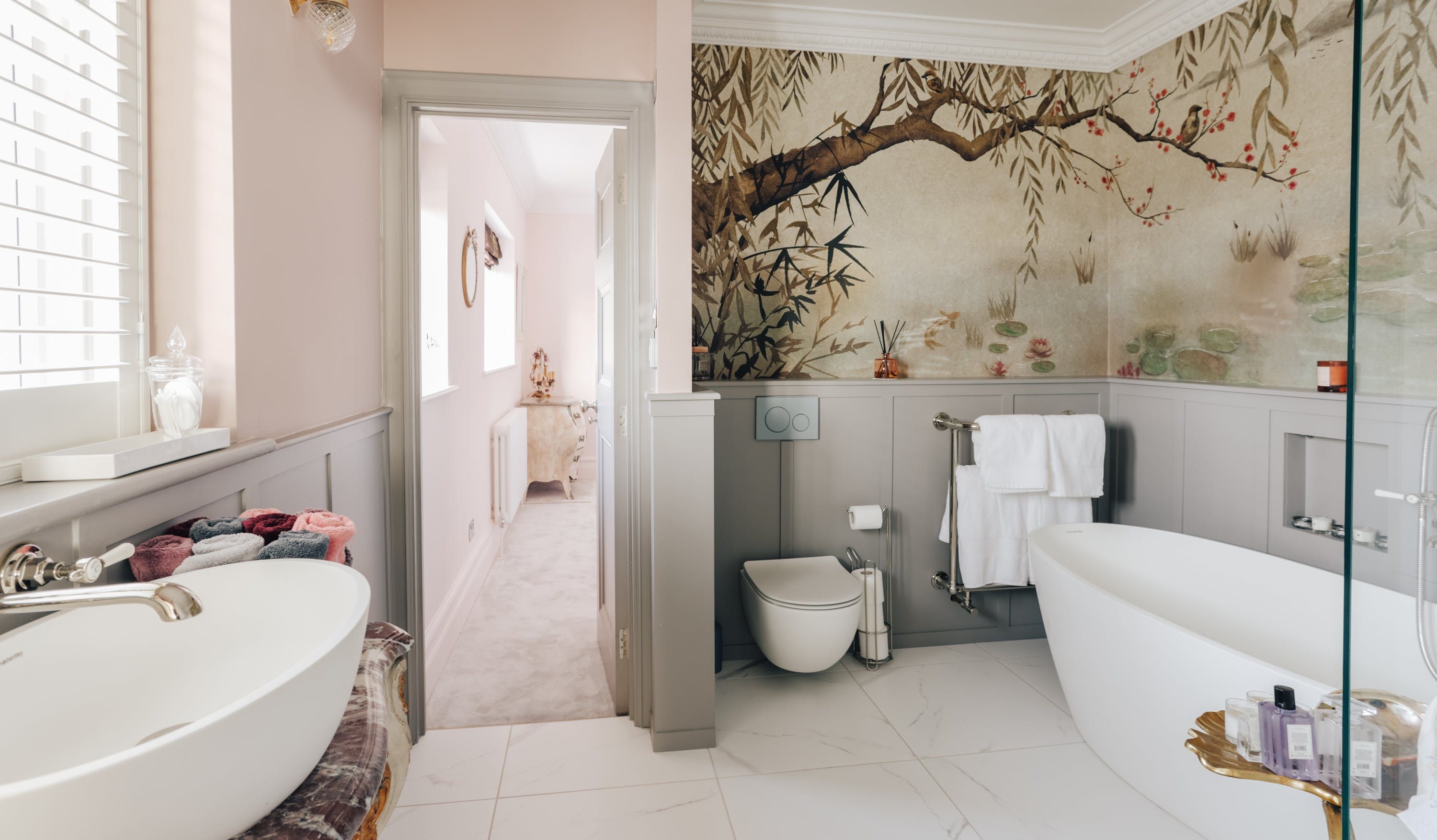 Stepping into the living room is like crossing the threshold into a 19th-century drawing room with its grand piano, sparkling chandelier and carriage clock above the mantle. A wood-burning stove can crackle away in the evening for a bit of atmosphere and floor-to-ceiling bay windows let the sunshine stream in. Double doors lead to the kitchen, where there’s dining for the whole group and an additional seating area around a big TV. Upstairs, bedrooms are super plush and spacious.
