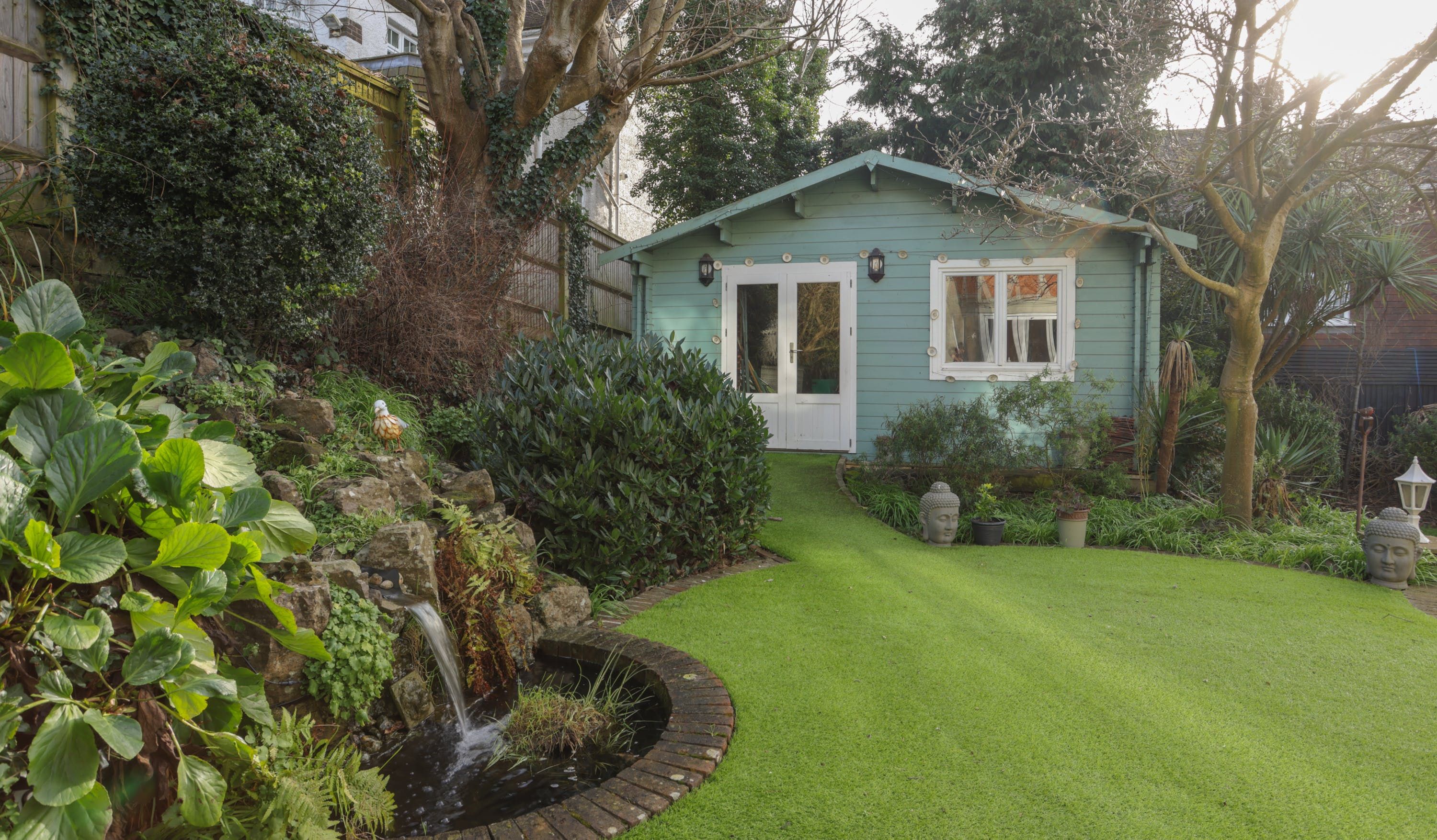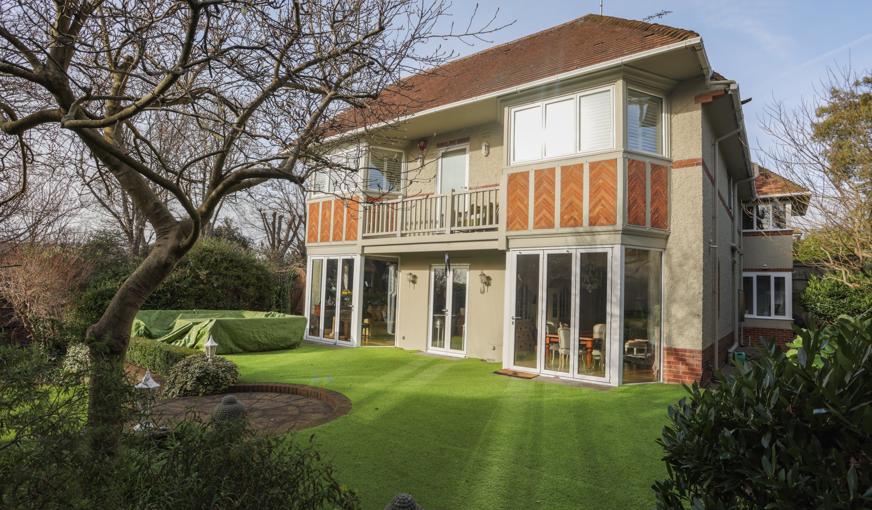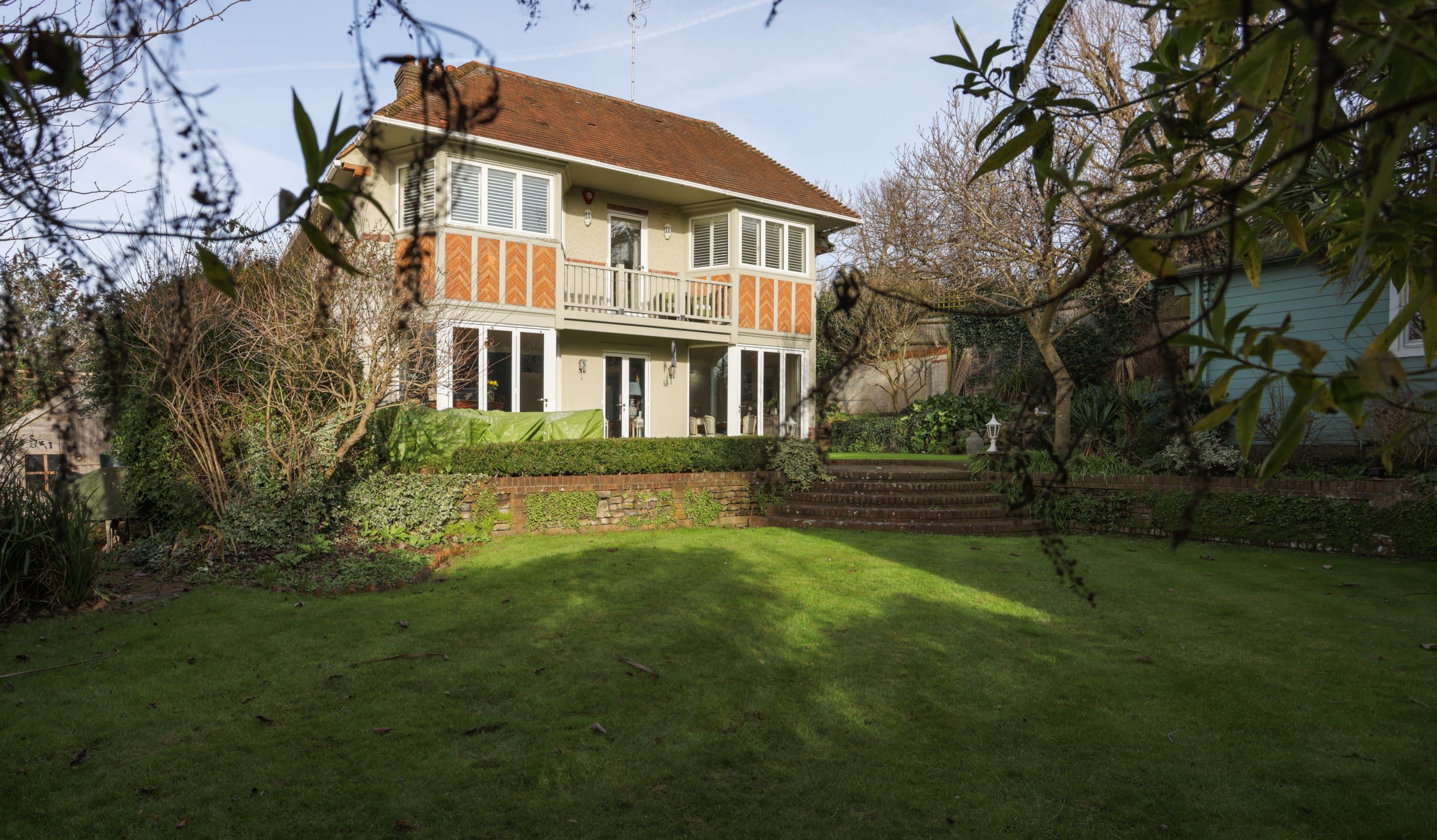 The home itself is in the style of a Victorian villa, with symmetrical bay windows flooding the place with light inside. There’s a bench up on the balcony, overlooking the garden for a quiet moment. The garden itself faces south, so there’s plenty of sunlight in the evening. Perfect if you’re planning to take dinner on the terrace, or sit on the swing seat with something bubbly.