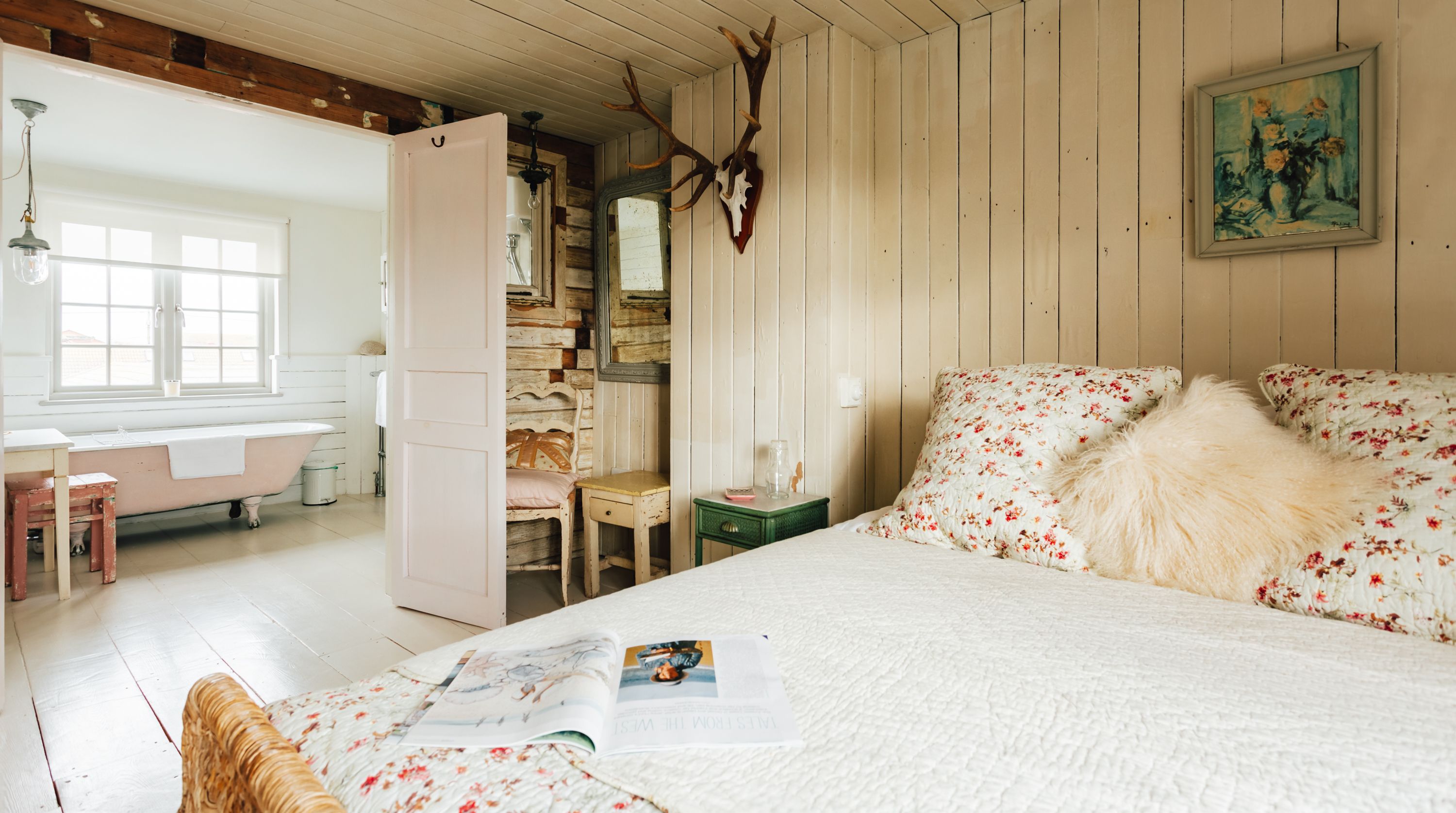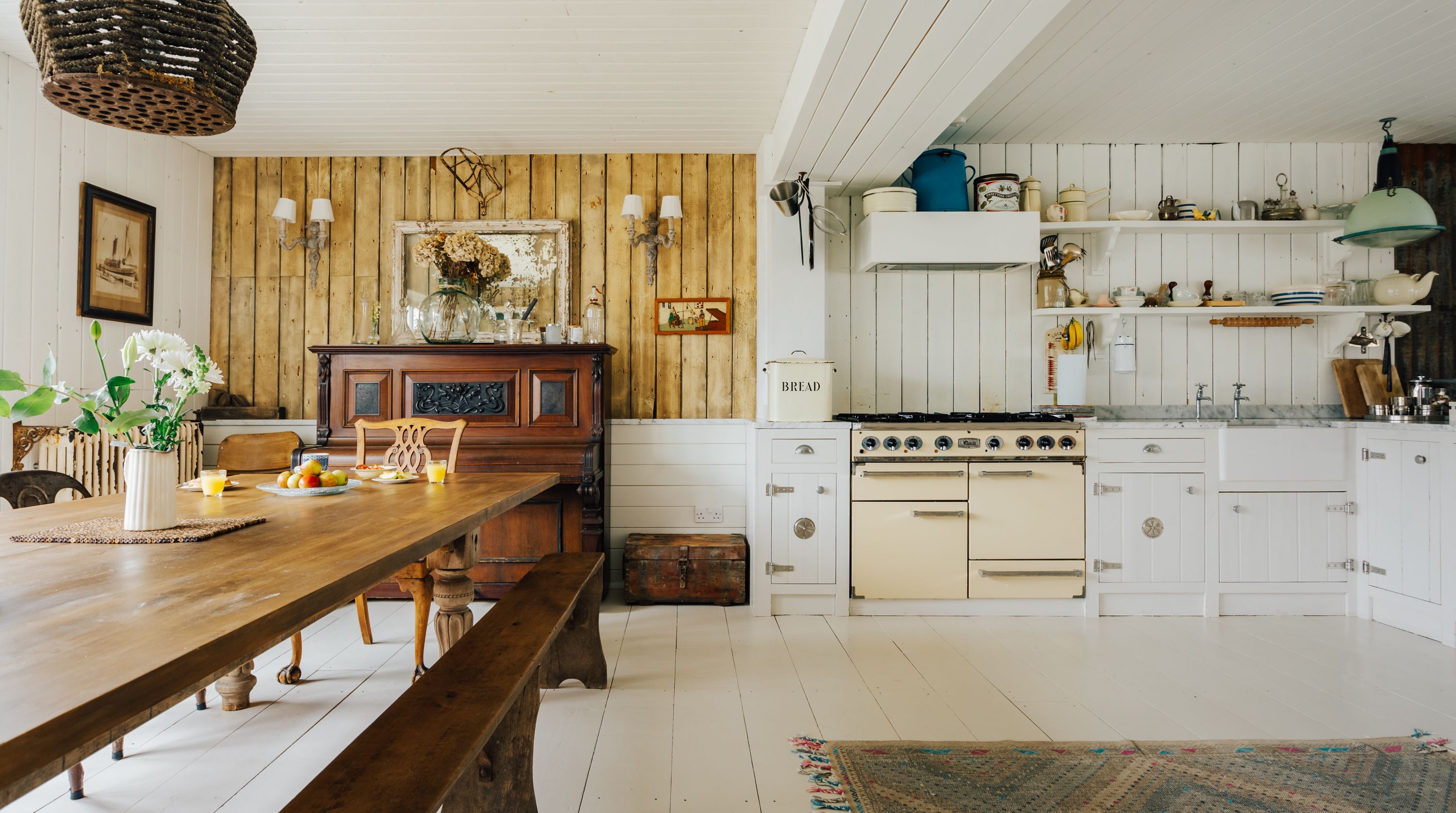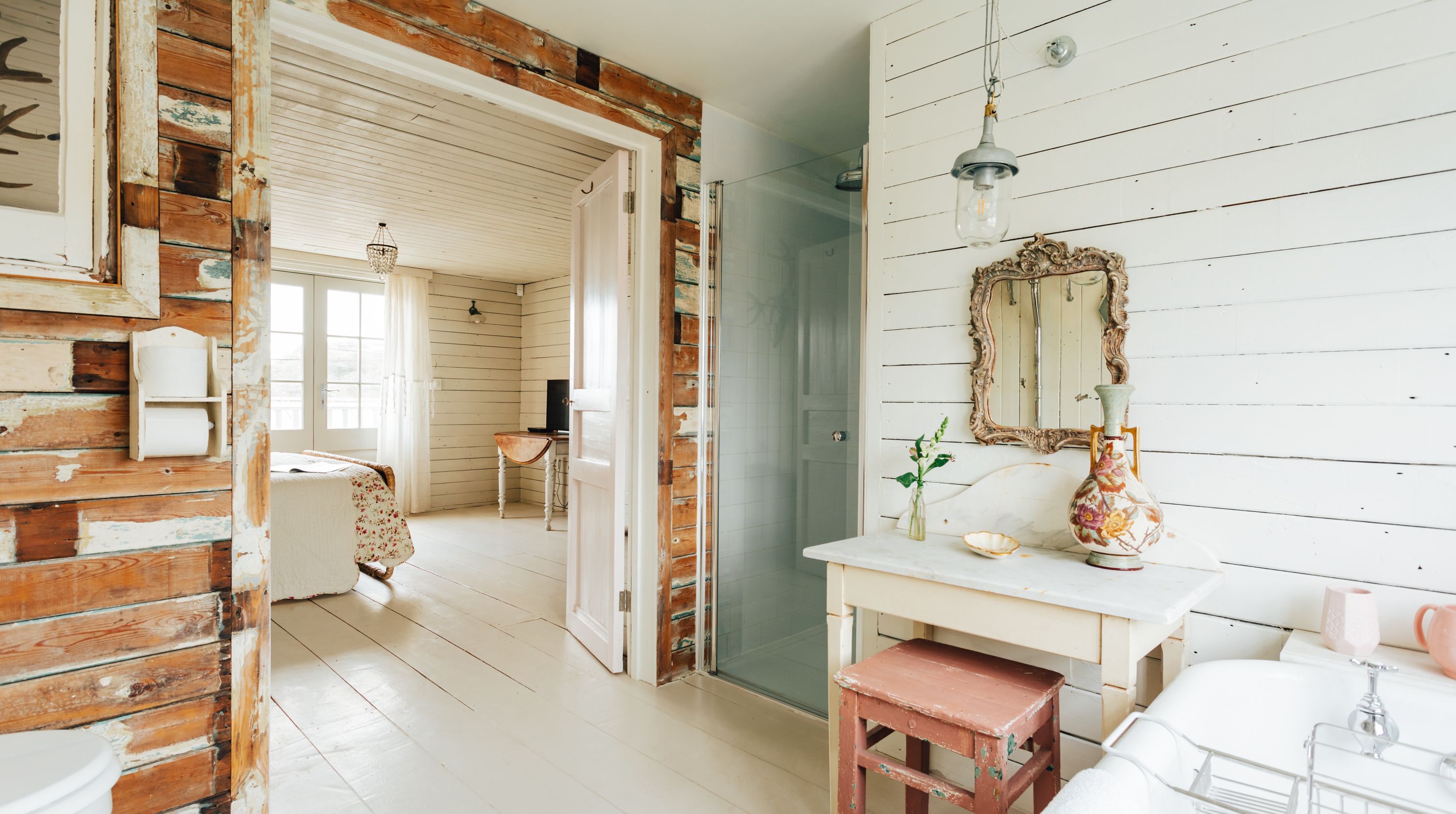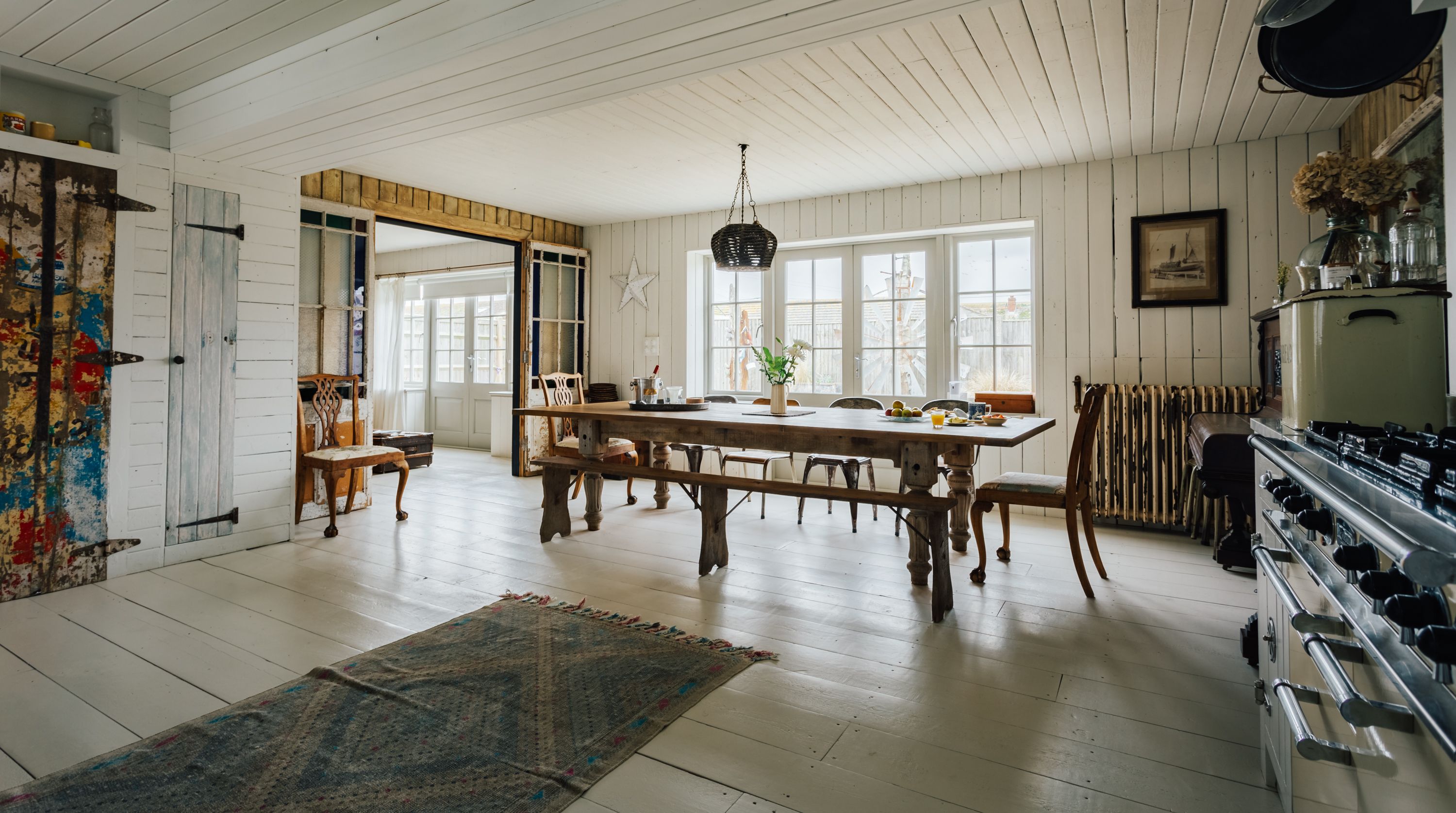 The interior is characterfully designed using reclaimed and antique materials, offering a revitalised version of seaside chic. The host is evidently a fan of up-cycling – look out for creative touches such as repurposed doors, stain-glass windows and rustic radiators. We especially love the wood-panelled walls and flooring that shape the space as a whole, while the comfortable furnishings, neutral tones and wood-burning stove keep things cosy.