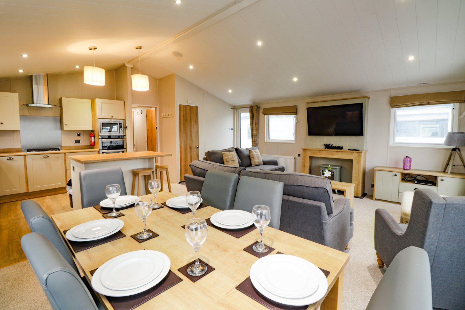 Accomodation Details All-ground-floor. Two bedrooms: 1 x double with TV, walk-in wardrobe and en-suite shower, basin and WC; 1 x twin with walk-in wardrobe. Bathroom with bath, shower over, basin and WC. Open-plan living space with kitchen, dining area and sitting area with electric fire