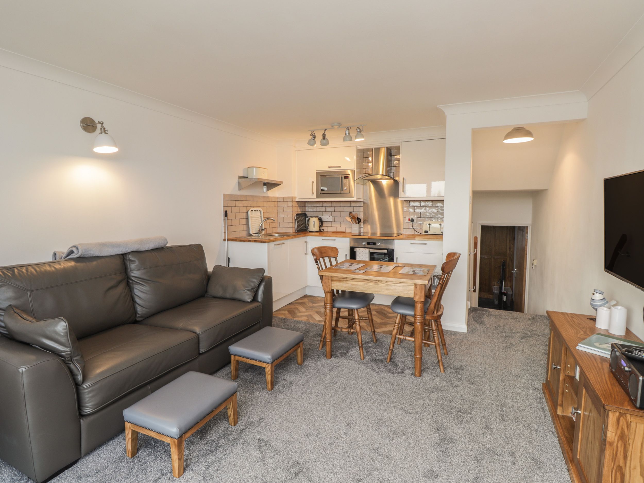 Amenities Gas heating. Electric oven and hob, microwave, fridge, TV and WiFi. Fuel and power inc. in rent. Bed linen and towels inc. in rent. Balcony with furniture. Parking for one car. Sorry, no smoking. Shop 0.5 miles, pub 0.2 miles. Please note there are steps to access the property and there are stairs down from the living area to the bedroom and shower room. Please see image 10. Note: Sorry, no pets