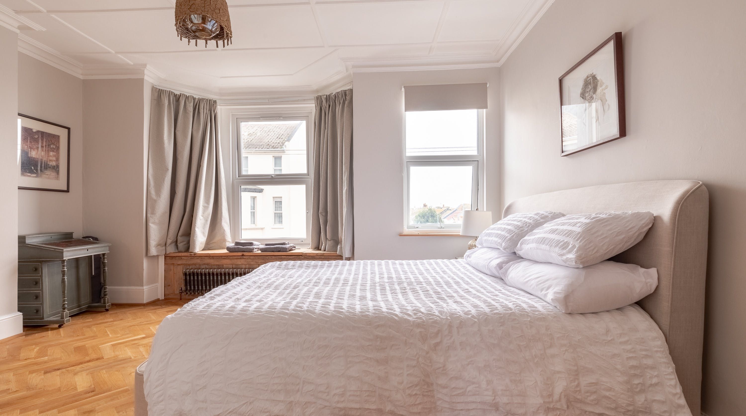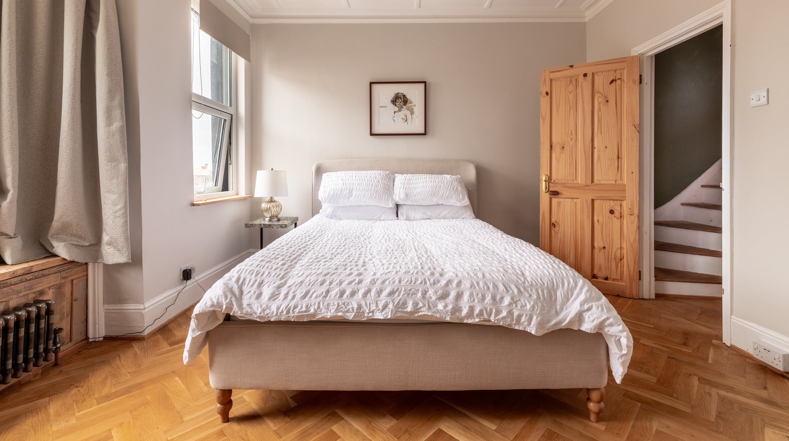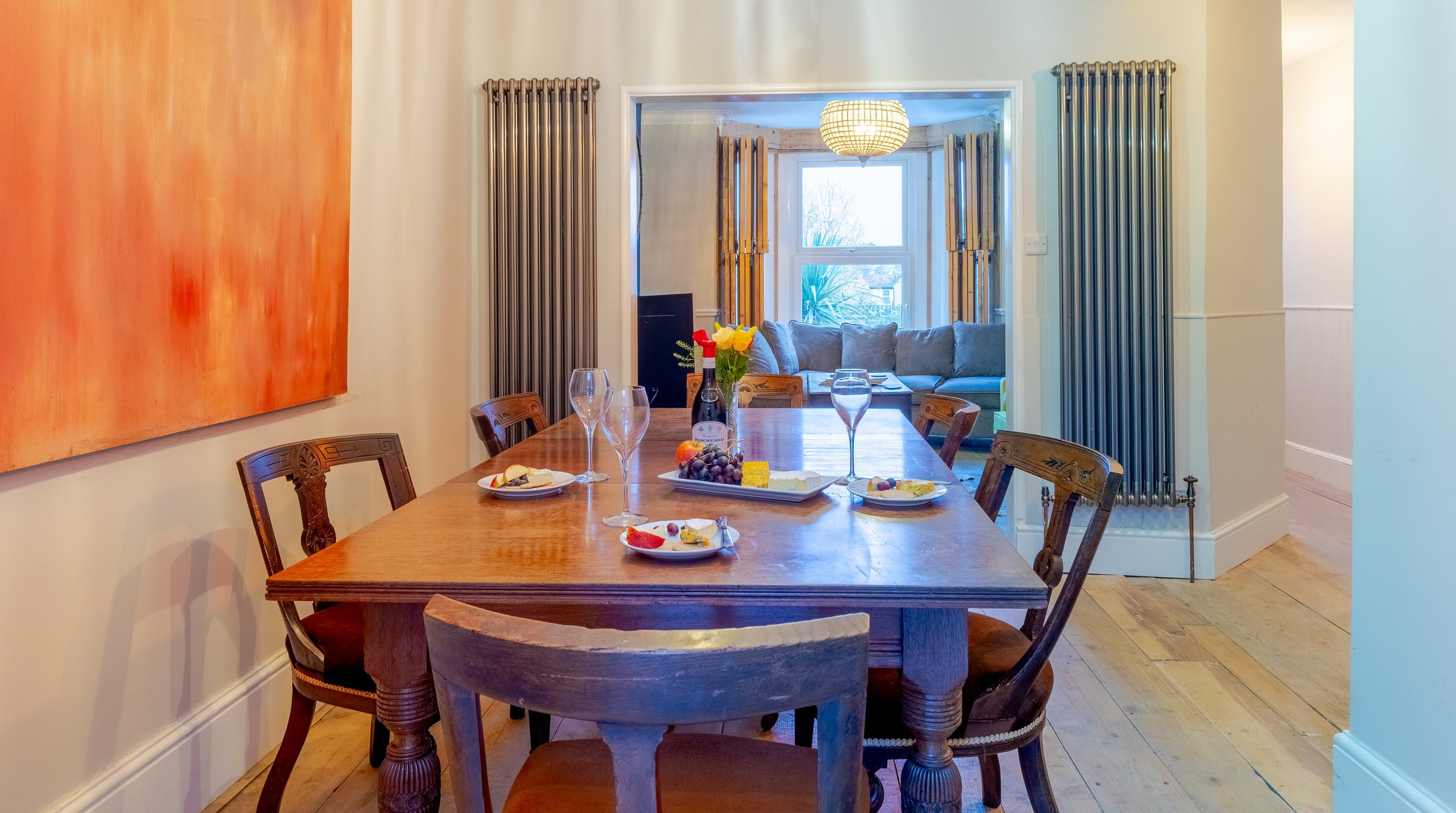This striking black townhouse in the seaside town of Hastings holds a few secrets inside. First of all, the eclectic living room, set around a big bay window with ingenious half-fold wooden shutters that allow in natural light while keeping a bit of privacy. The wood-burning stove is a cosy bonus for cold nights and the walls are adorned with vibrant modern art. Then there’s the private patio garden with its summer house set up as a creative studio. The outdoors is illuminated with stringed lights at night where a sunken, hand-crafted picnic table and chairs await. Finally, our favourite spot has to be the Japanese onsen style bathroom, with its cascading waterfall sink and a bubble Jacuzzi tub designed specifically for the space. The bathroom is a testament to the rest of the house, where bannisters feel hand-crafted from reclaimed wood and book-filled shelves in the bedrooms are bespoke. Venturing out into Hastings, you’ll find the long sweep of sandy beach is just a fifteen-minute stroll away, and the heart of town, brimming with shops, restaurants and cafés is ten minutes on foot.
