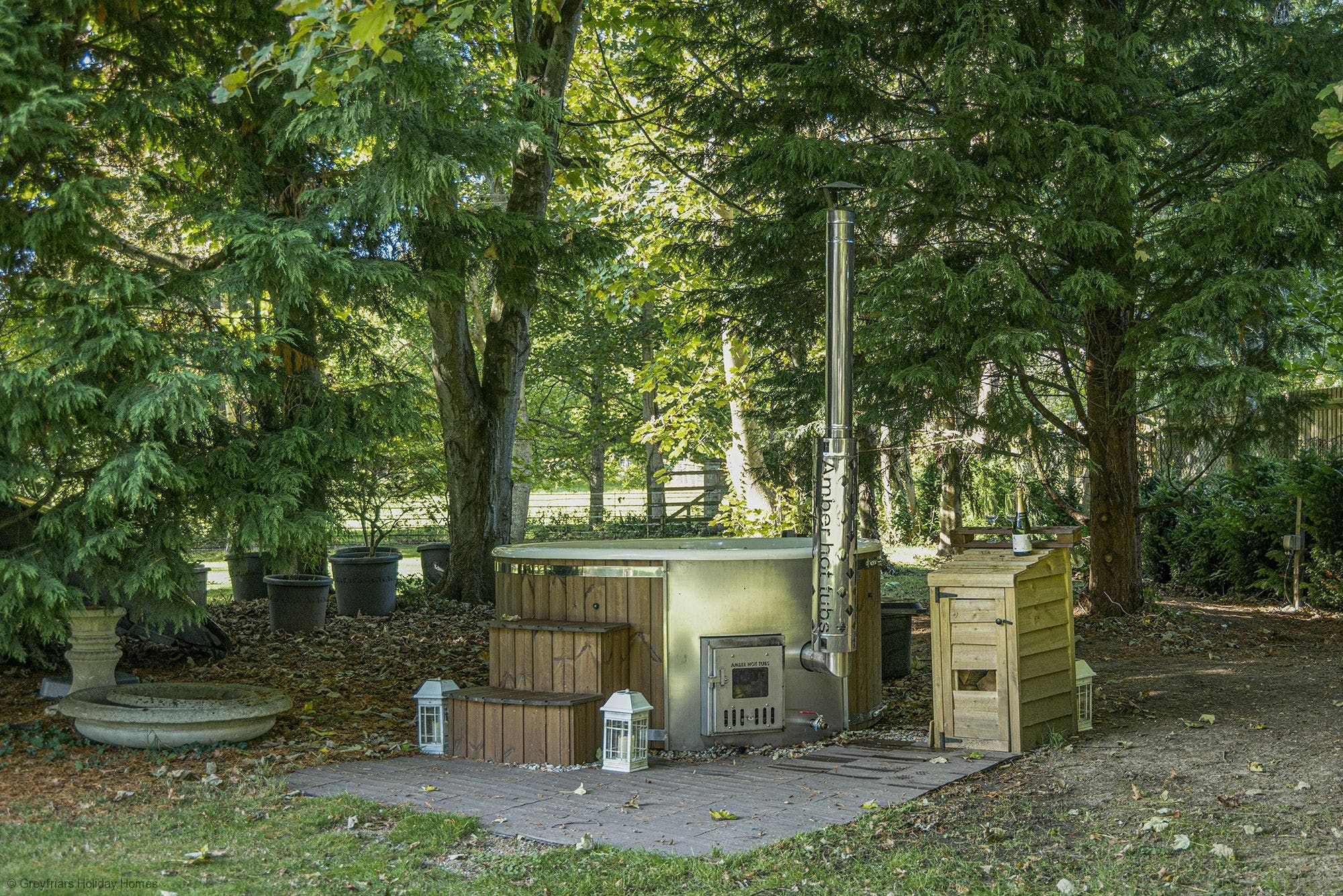 And that's not all. As well as the long balcony with its sweeping views, you'll have a private section of the garden, where a dining table and a barbecue mean you can make the most of sunny days. And what could be more of a treat than a long soak in your very own wood-fired hot tub?