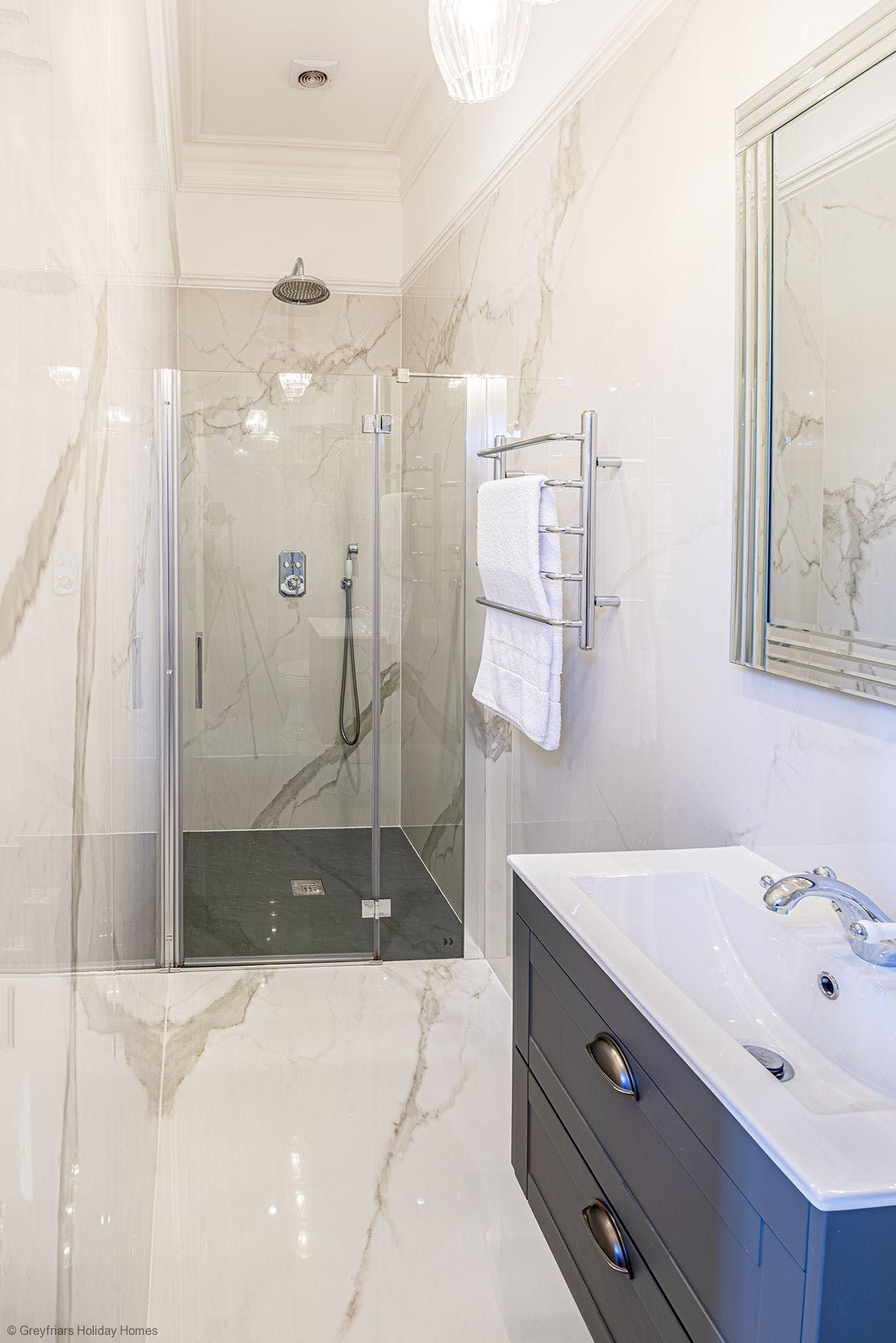 You enter your first-floor retreat through a courtyard and by climbing the stairs to the terrace, where you can look out across the grounds from double doors leading into your living room and both bedrooms – making it easy to step outside for some fresh air each morning. Inside, the home has been renovated with style and attention to detail, making sure it's modern and comfy without losing any of its period charm. We particularly love the master bedroom's enuite with its stunning agate floor and wall tiles and its luxurious Japanese soaking tub.