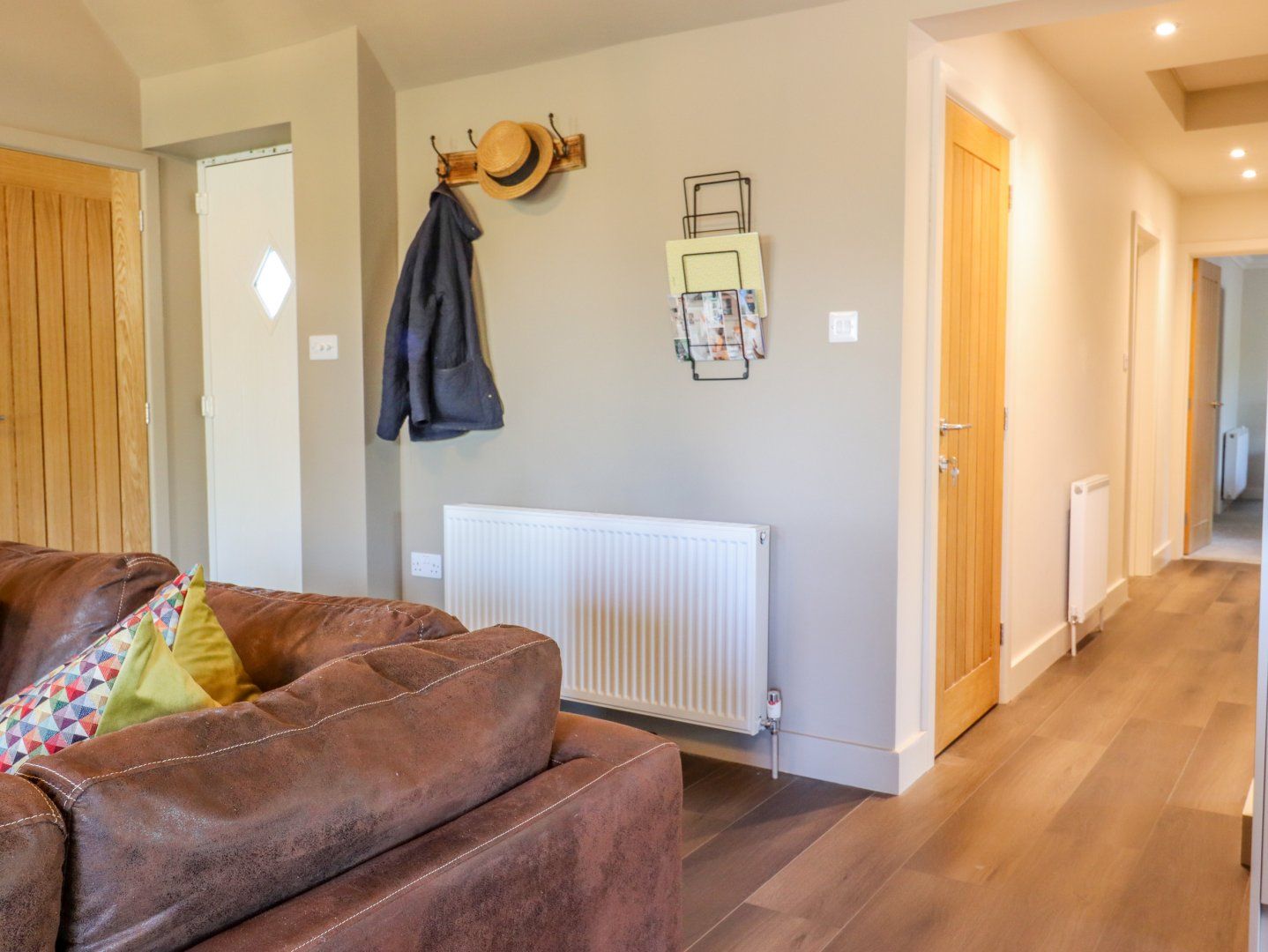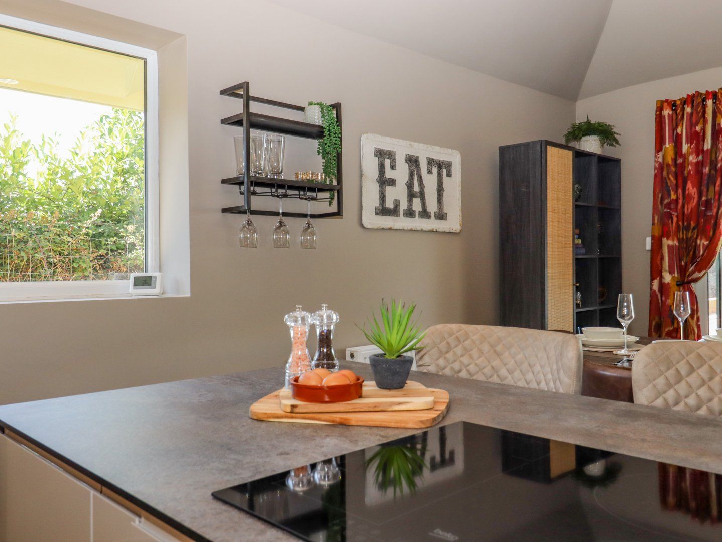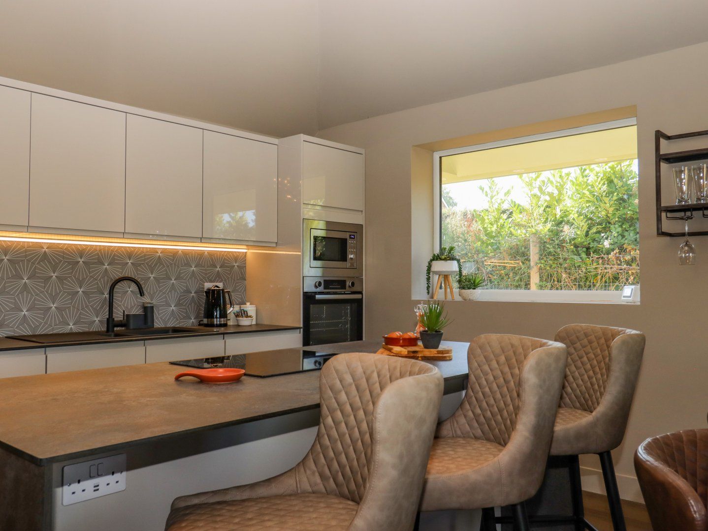 Single-storey. Two bedrooms: 1 x king-size with TV and en-suite bath, hand held shower, walk-in shower, basin, heated towel rail and WC, 1 x twin with TV. Bathroom with bath, hand held shower, walk-in shower, basin, heated towel rail and WC. Open-plan living space with kitchen, dining area and sitting area with electric fire and sofa bed