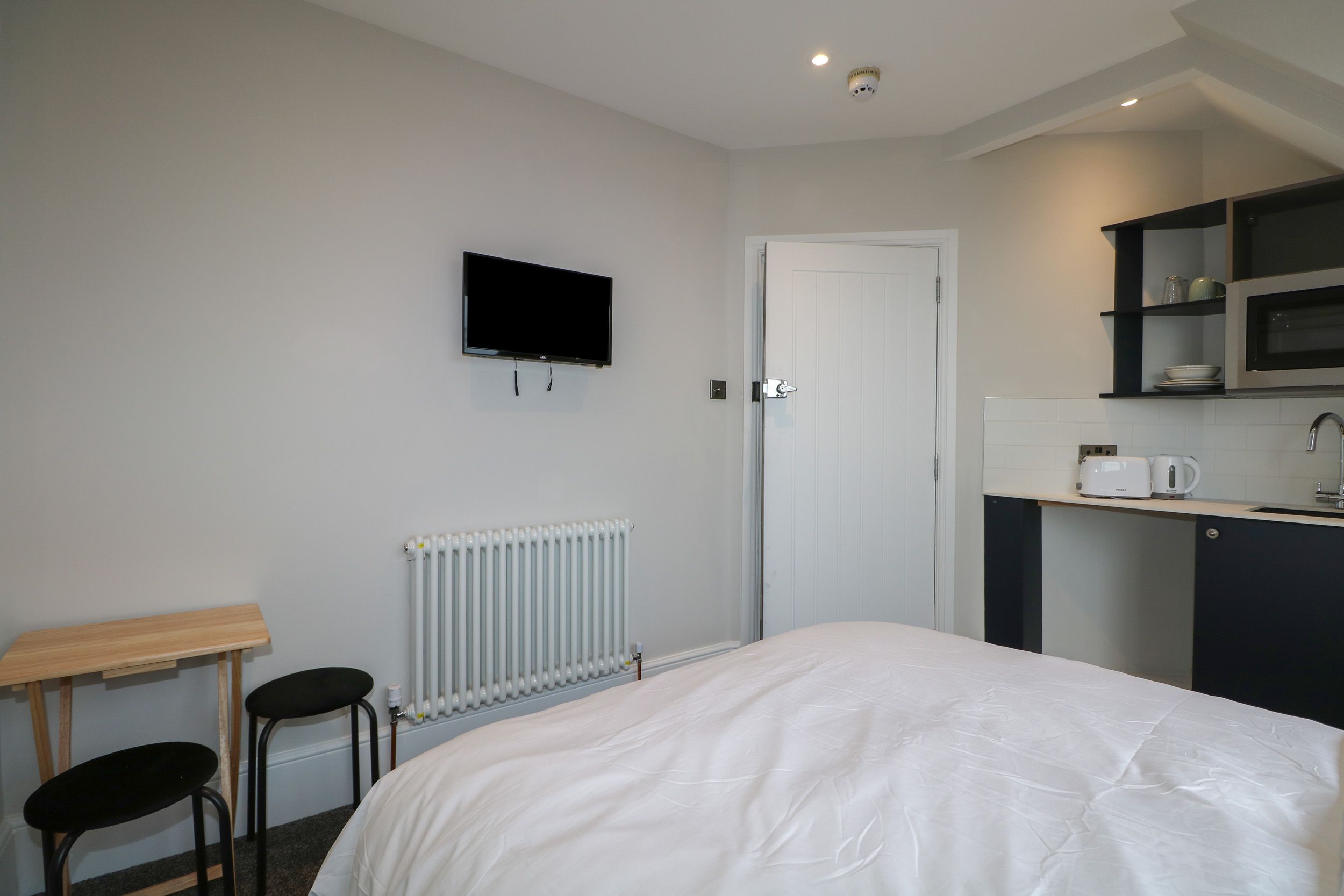 Accomodation Details Second-floor apartment. Studio-style living with double bedroom, kitchen, dining area with TV. Shower room with walk-in shower, basin, and WC