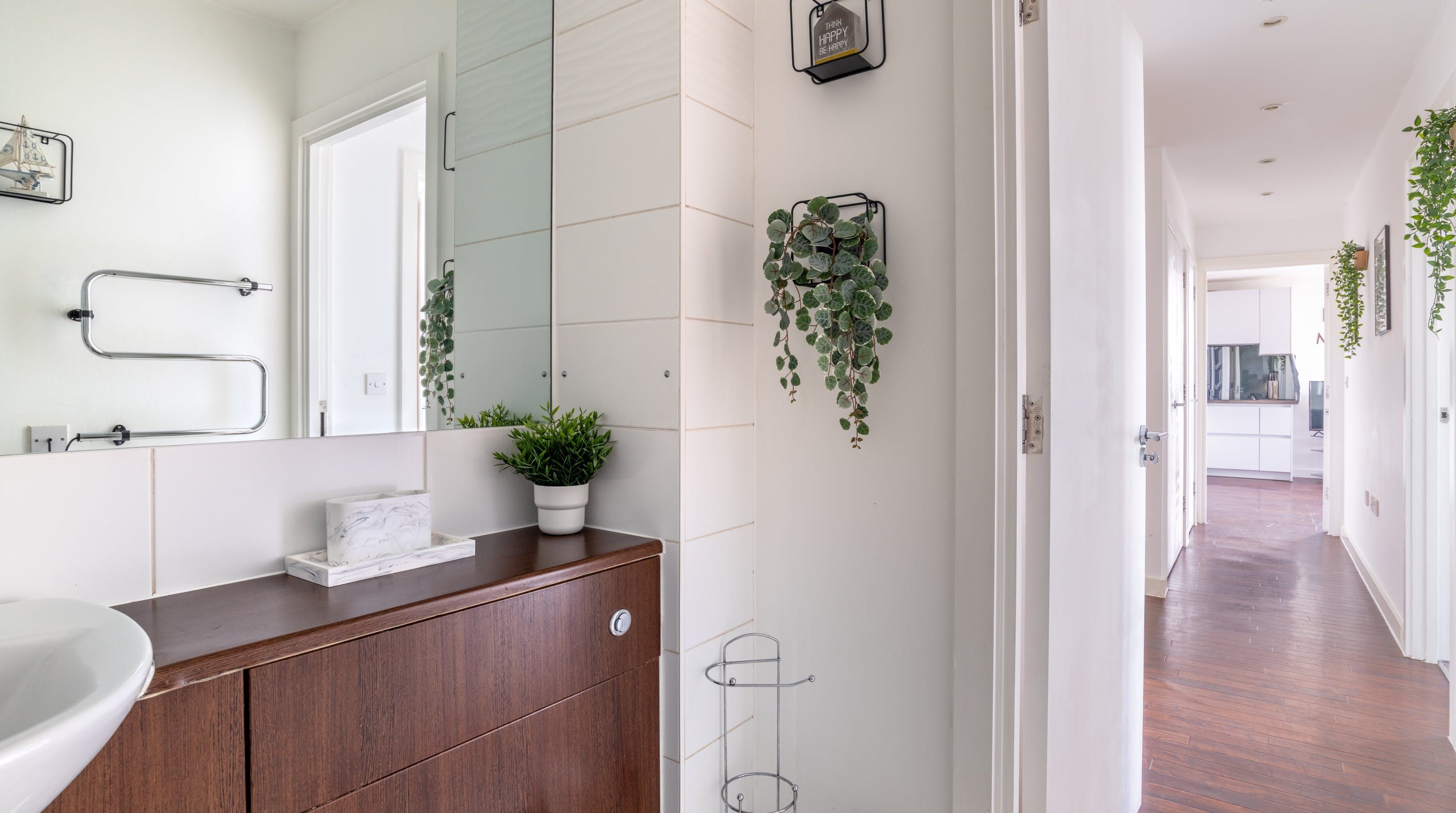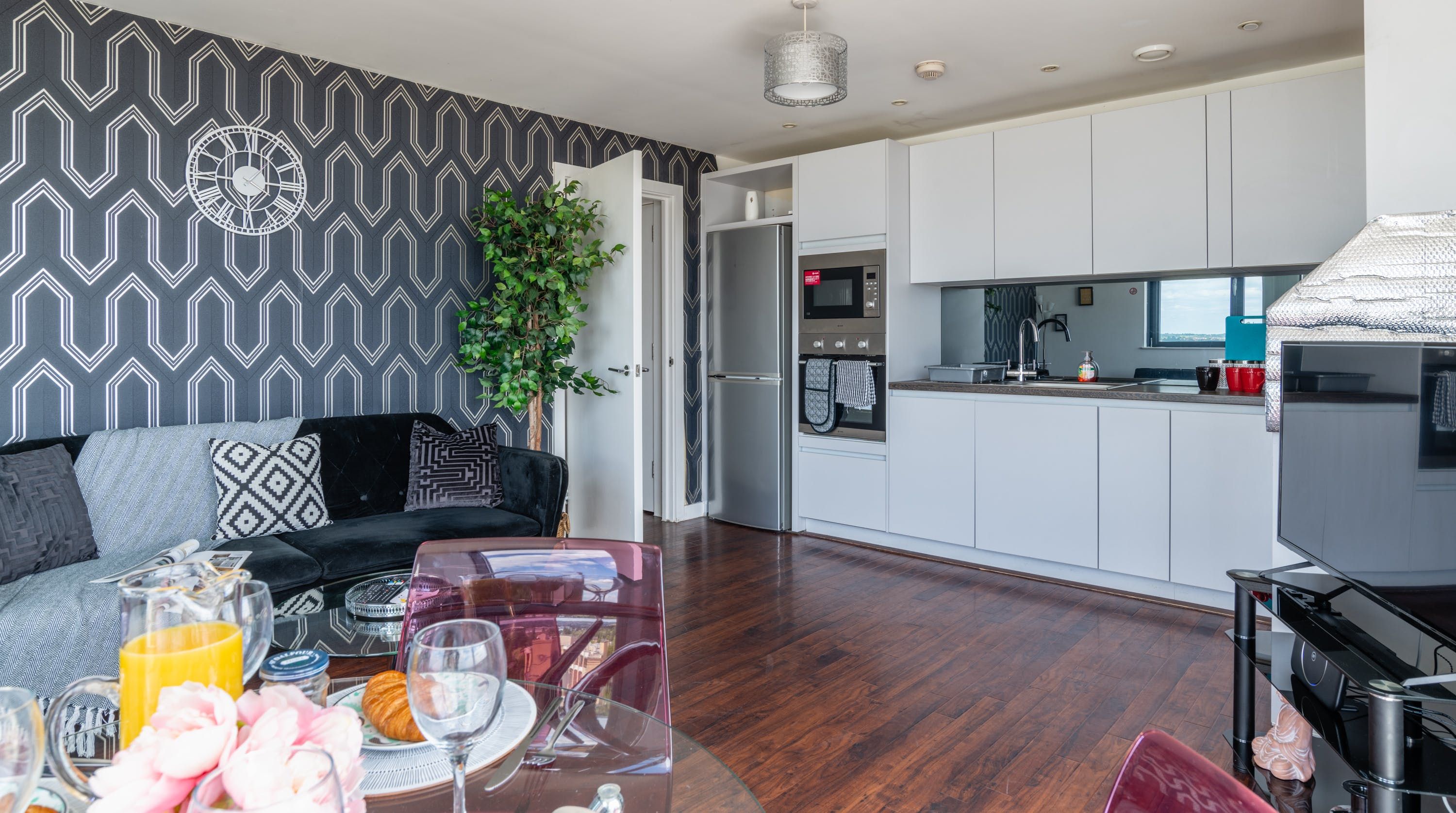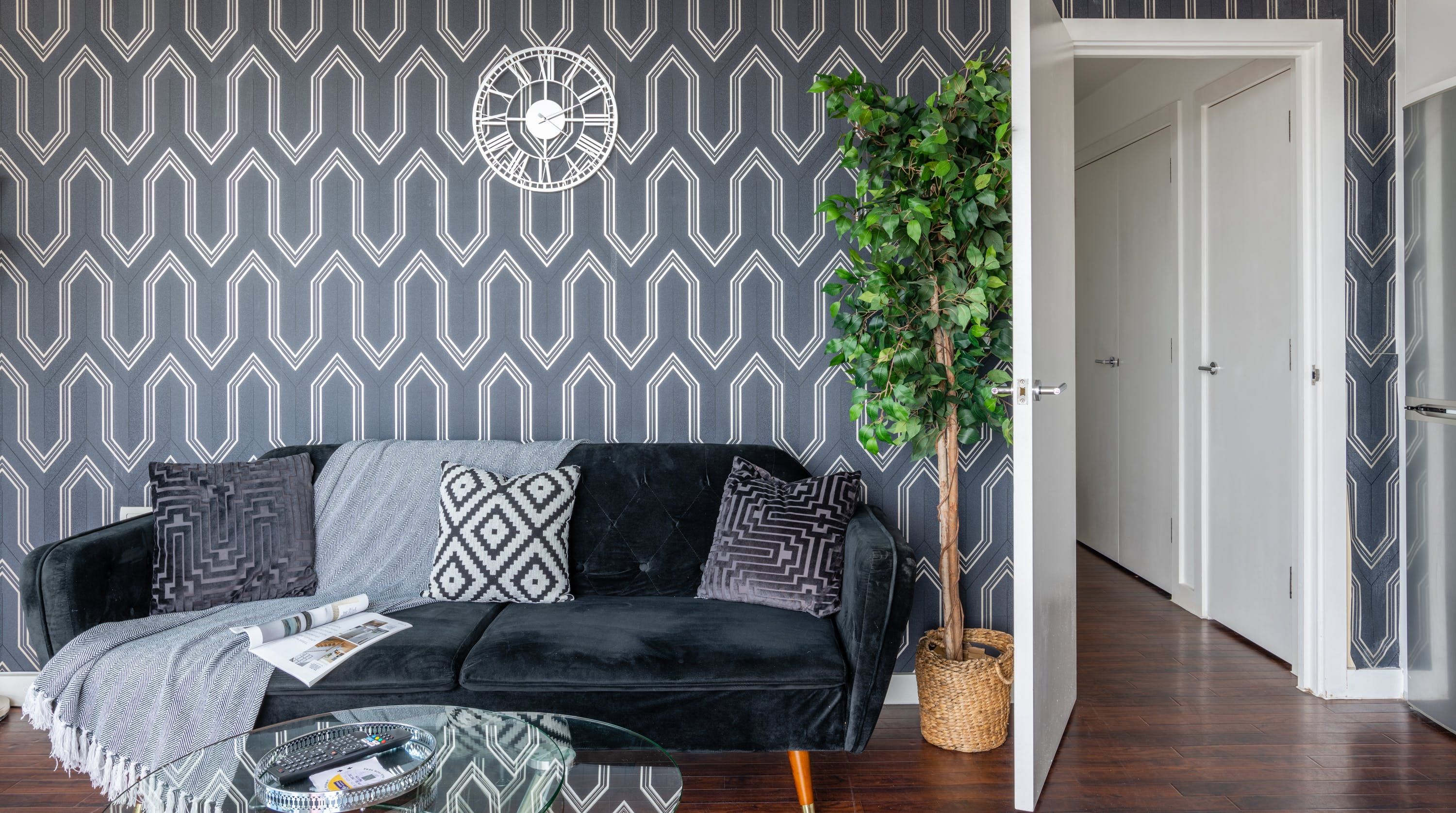 Close to transport links, this home is in an ideal location to accommodate both business and recreational trips, with flair. We always find it’s the little details that make the most difference, and that rings true here in the trim of the rich velvet sofa, the bright pop of pink dining chairs, the choice of wallpaper, and the sense of calm the green plants bring to the space.