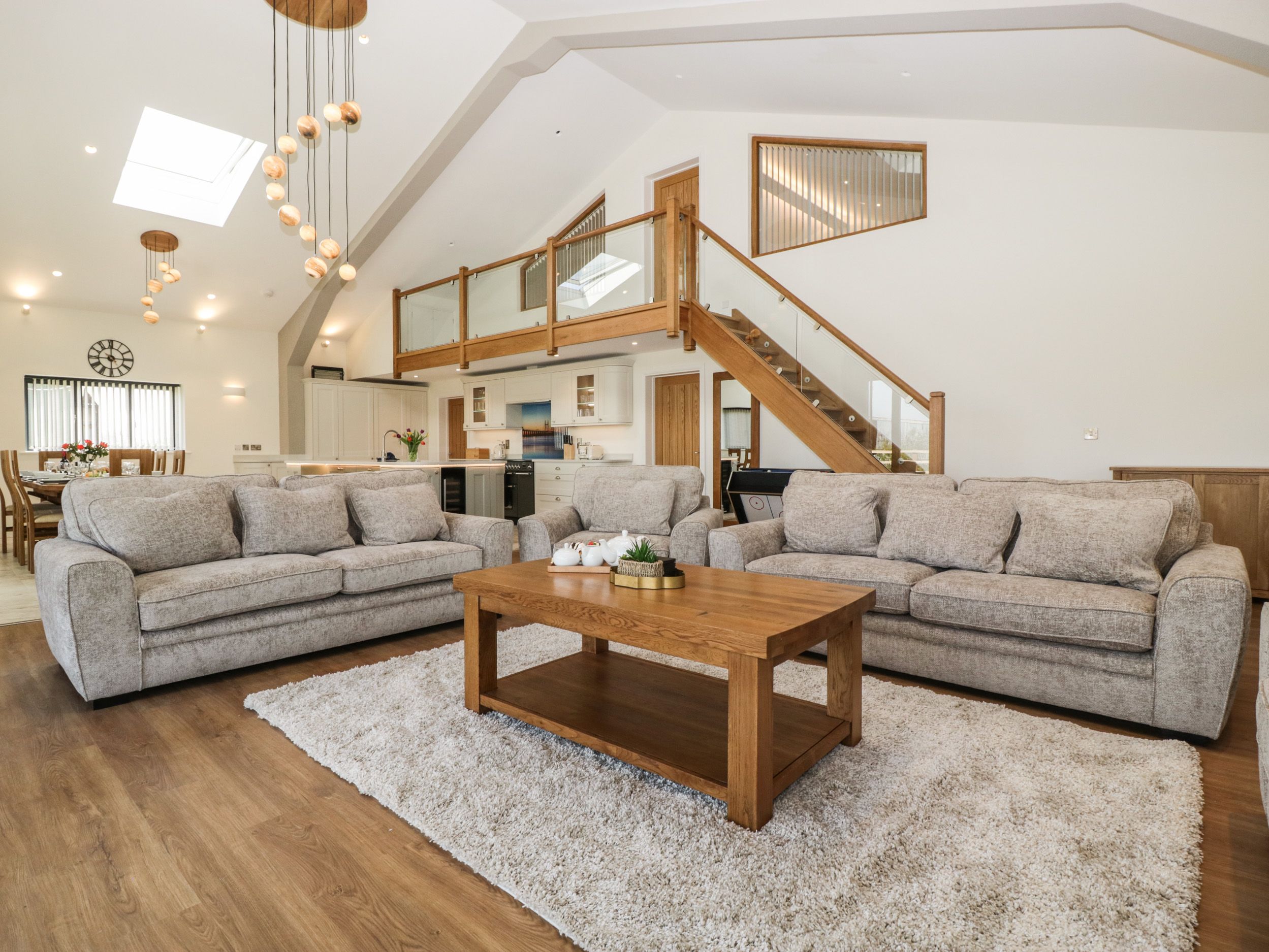Accomodation Details Three bedrooms: 1 x super-king-size and double sofa bed with TV and en-suite bath, handheld shower, walk-in shower, double basin, 2 x heated towel rail, and WC, 1 x ground-floor family room with super-king-size (zip/link, can be twin on request) and single with TV and en-suite bath, handheld shower, walk-in shower, double basin, heated towel rail, and WC, 1 x ground-floor family room with super-king-size (zip/link, can be twin on request) and single with TV and en-suite walk-in shower, double basin, heated towel rail, and WC. Open-plan living space with kitchen, dining area, and sitting area