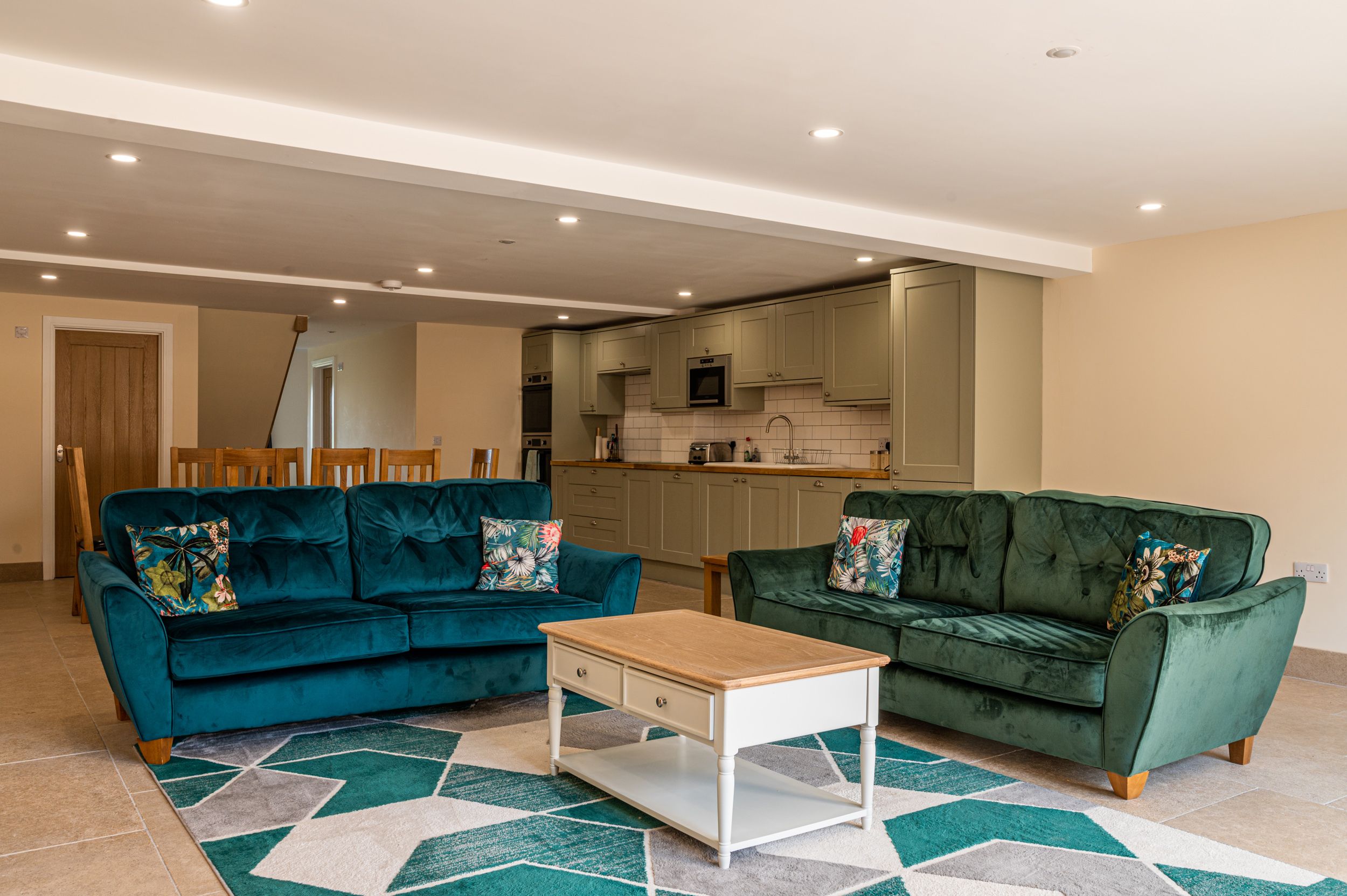 Accomodation Details Four bedrooms: 1 x super-king size (zip/link, can be twin on request) with en-suite walk-in shower, basin and WC, 1 x king-size with en-suite walk-in shower, basin and WC, 2 x double bedrooms. Family bathroom on first floor. Shower room with walk-in shower, basin and WC. Open-plan living space with kitchen, dining and sitting area