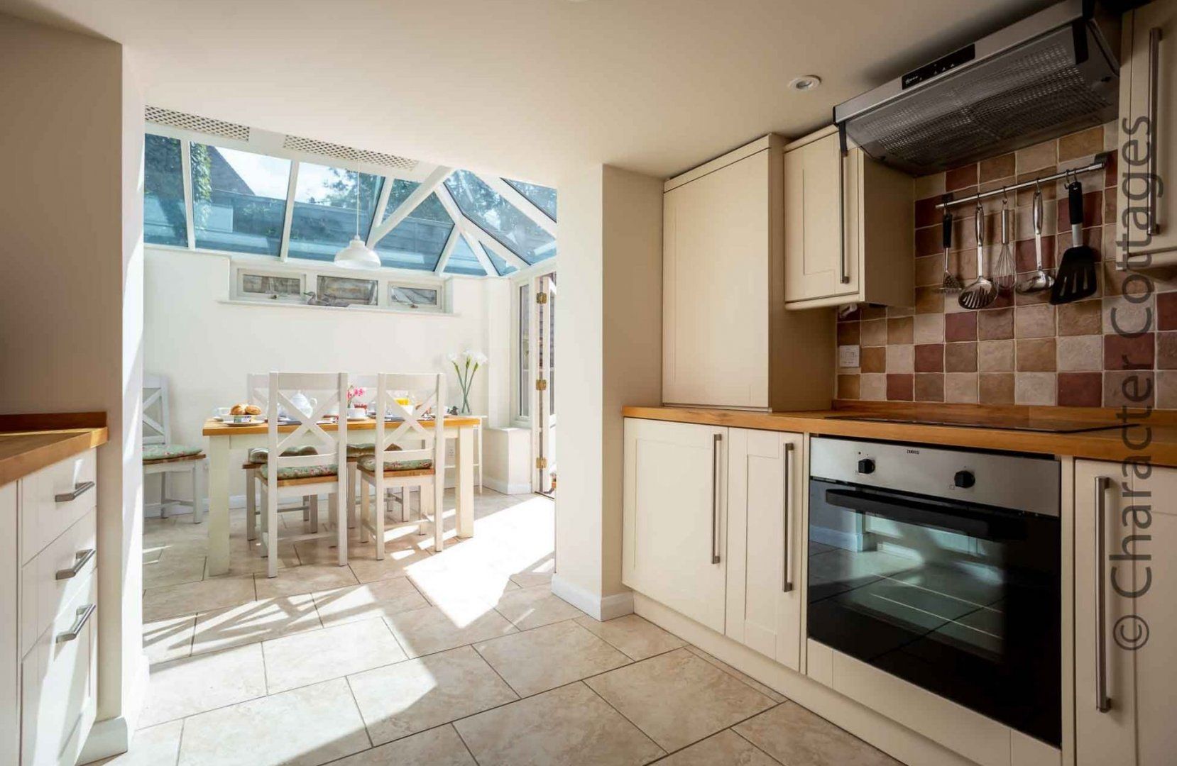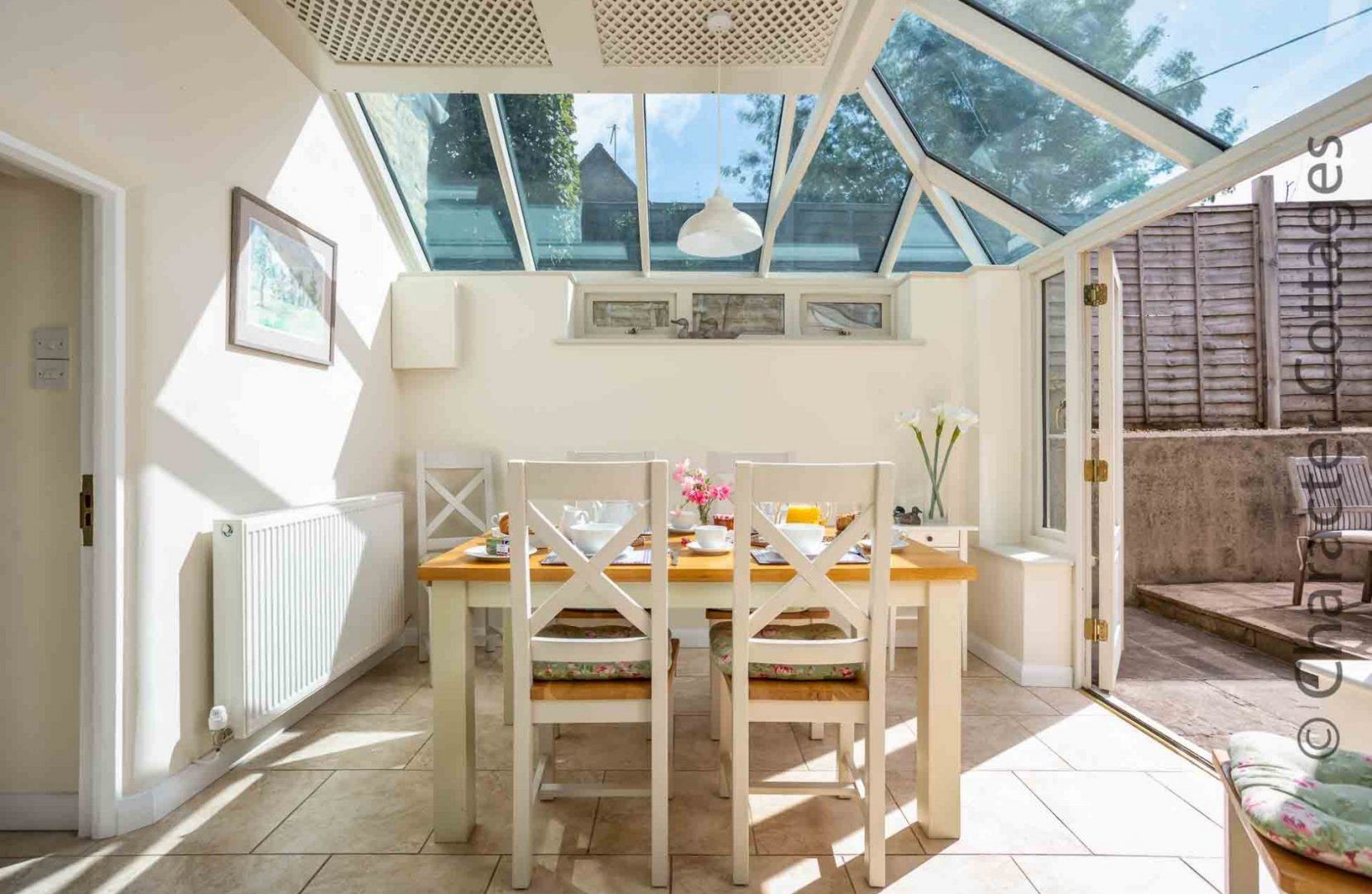 The chef of the group will have a great time rustling up the evening meal in the well-equipped, spacious kitchen which has everything you will need during your stay, before you all move into the connecting conservatory which houses a wooden dining table and leads out to the peaceful patio garden, where you have the choice to dine alfresco, which has a lovely lawn area with surrounding plants and flowers.