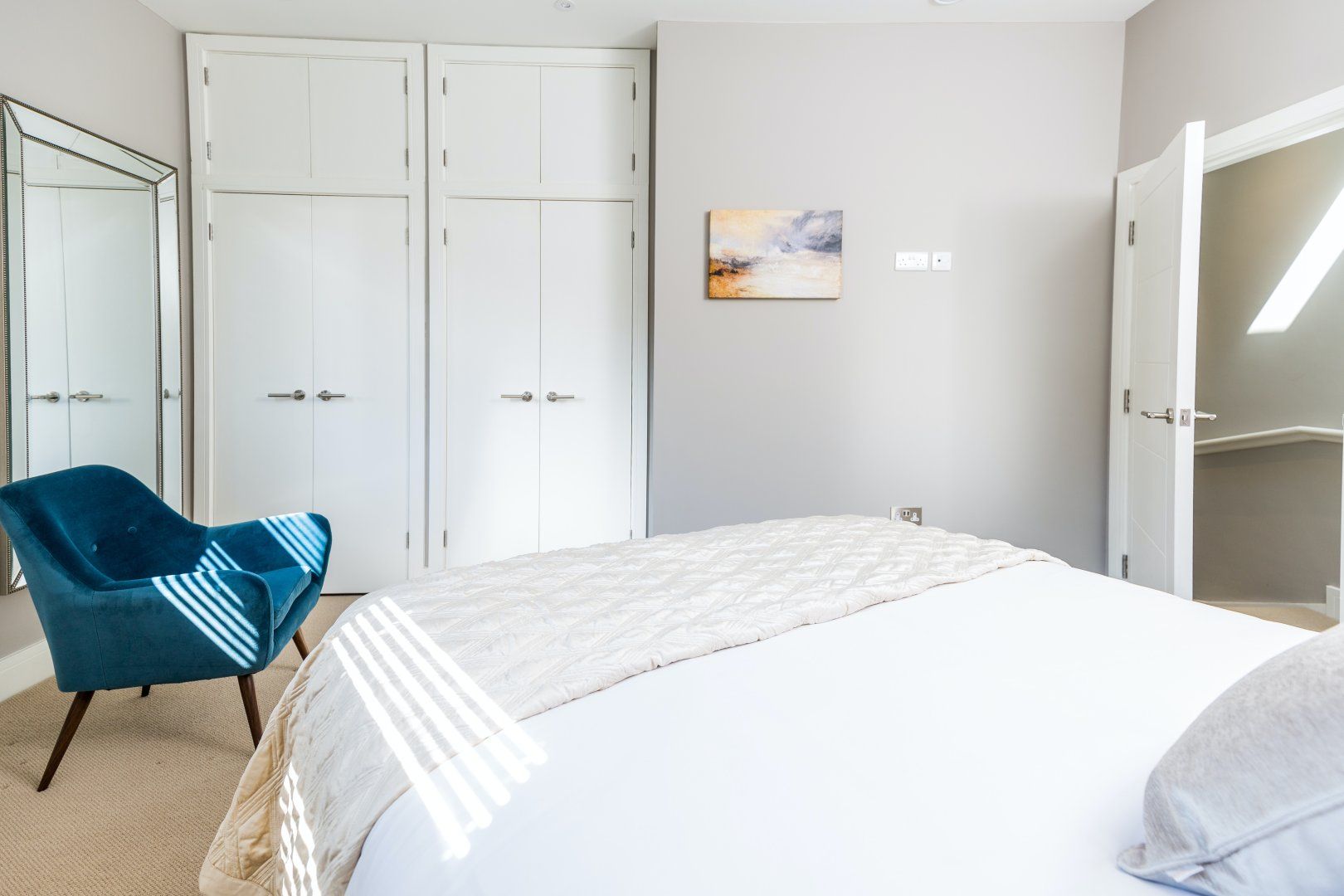 The ground floor of this new-build in the Montpellier neighbourhood is a great example of how to execute open-concept design successfully. Upon entrance, there's a zone for socialising, with a green velvet sofa and a chic glass dining table. This moves onto the minimalist kitchen, which has plenty of surface space and a sleek island for morning coffee. Carry on and you'll reach a glass door that opens out onto a large patio, decorated with conifers, loose stone and potted plants — a lovely spot for soaking up the sunshine. If you've been blessed with good weather, Montpellier Garden is only five minutes' walk away. Similarly, the famous Devil's Chimney, along with hiking routes in the Cotswold Area of Outstanding Natural Beauty can be reached in ten minutes in the car.