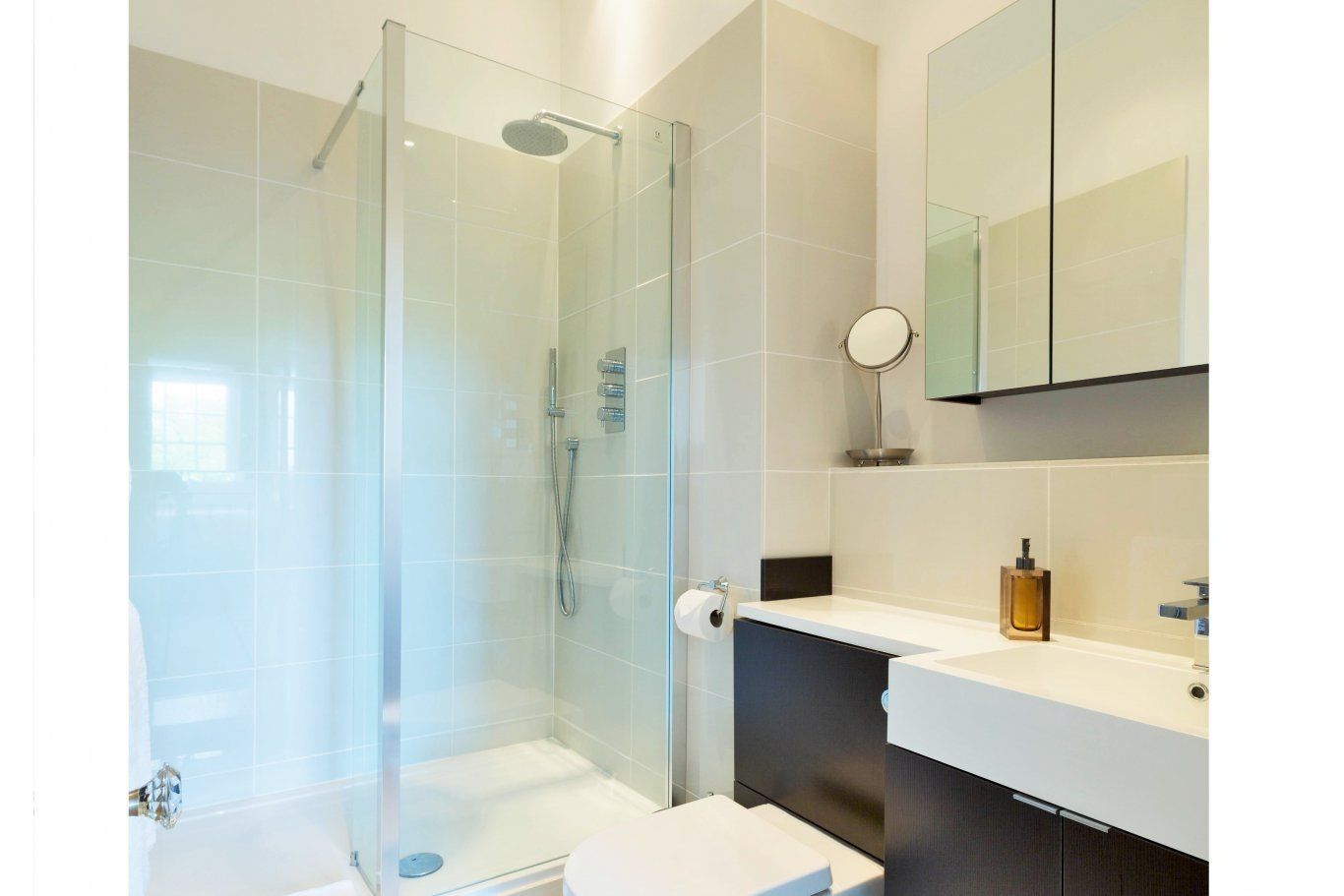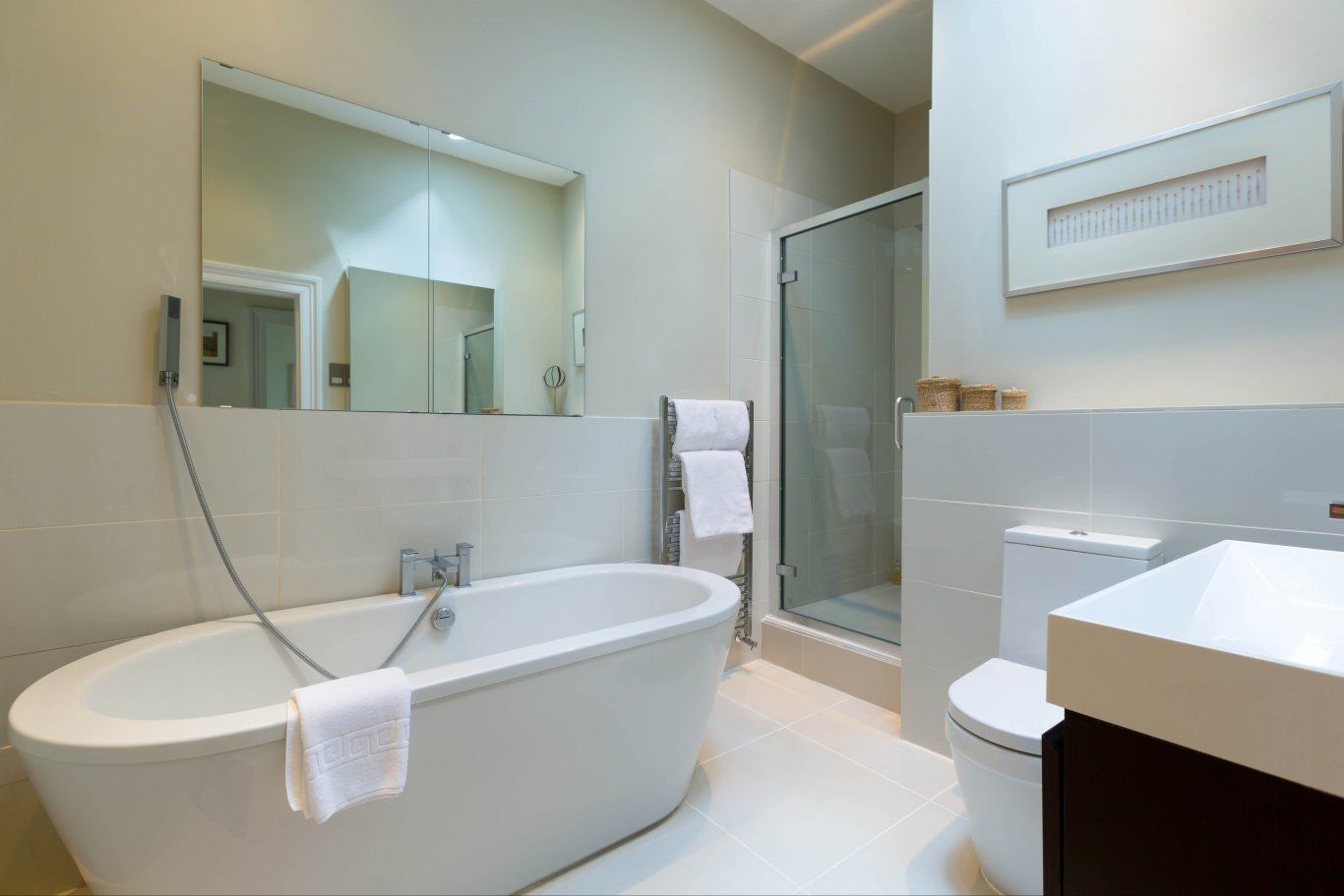 Rather aptly for an apartment on a street called Queen's Circus, this home is really rather regal. Some of that is down to the tall ceilings, period features and tall sash windows looking out over Imperial Gardens, but it's all the little design touches, too — the chandeliers and oversized, ornate mirror frames add a touch of class in the living space and bedrooms, while the rainfall shower and elegant free-standing tub bring spa-level amenities to the bathrooms. The kitchen is both large and dazzlingly white, perfect for any culinary experimentation you have in mind. Alternatively, you're more than welcome to leave it completely unused, as there's a wide array of restaurants available in the surrounding Montpellier neighbourhood. If the weather's kind during your visit, Sandford Parks Lido can be reached in fifteen minutes' on foot, while you can be in the Cotswold Area of Outstanding Natural Beauty in ten minutes' drive.